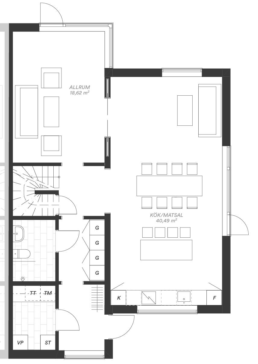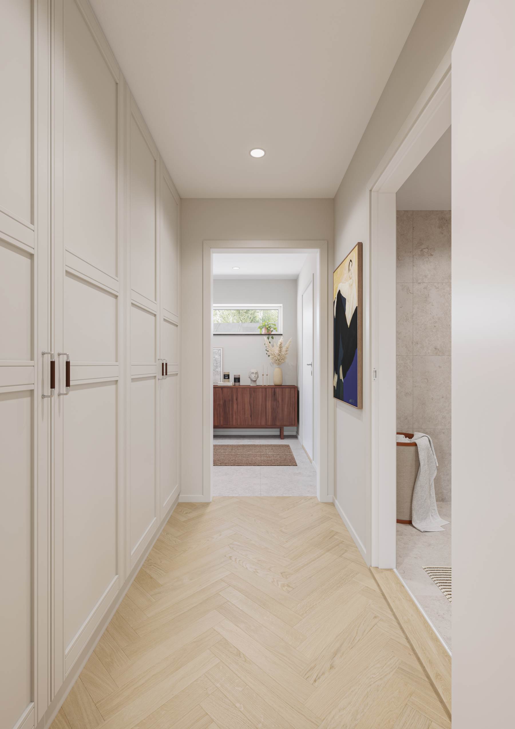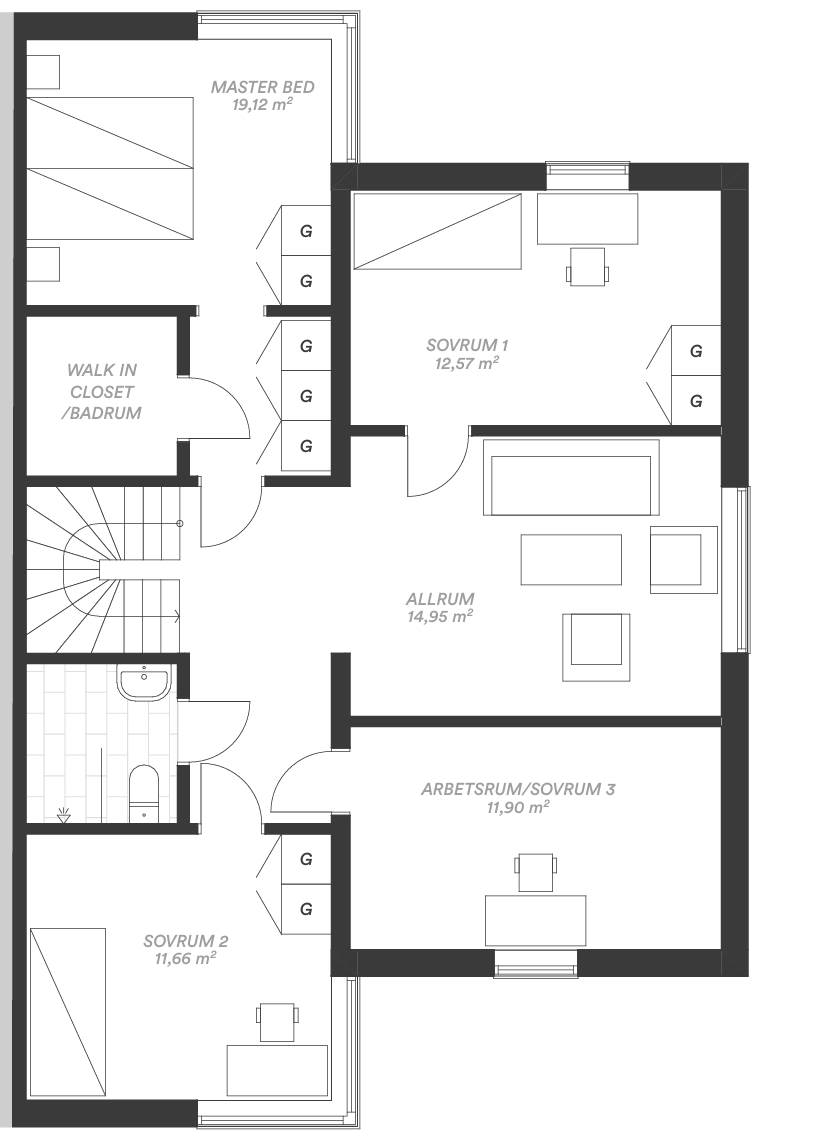 Minimalistisk design kombineras med ett tydligt kvalitetsfokus där naturmaterial och omsorgsfulla detaljer skapar en harmonisk och stilren boendemiljö. Planlösningen erbjuder tydliga sociala ytor på entréplanet och privata rum på övre plan, vilket skapar en smart och trivsam vardag.