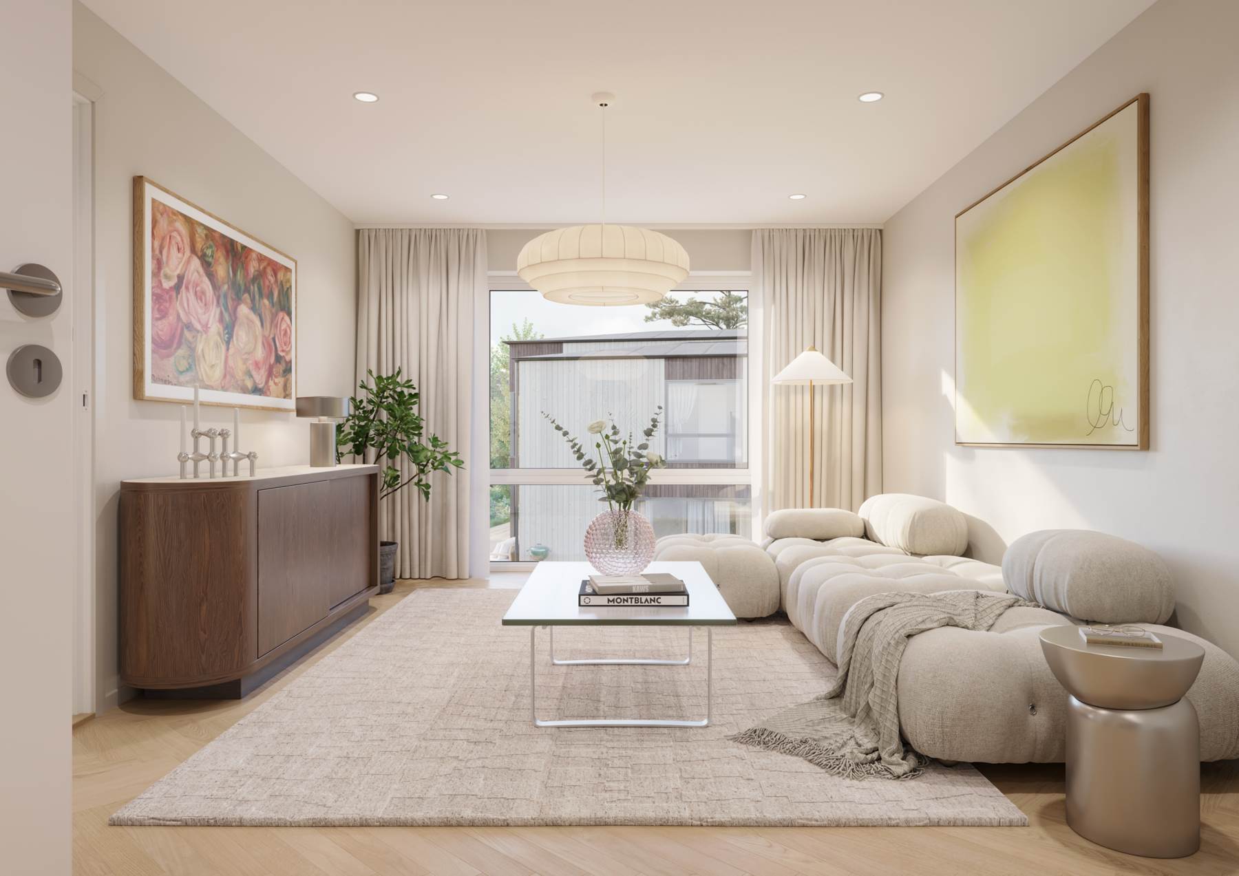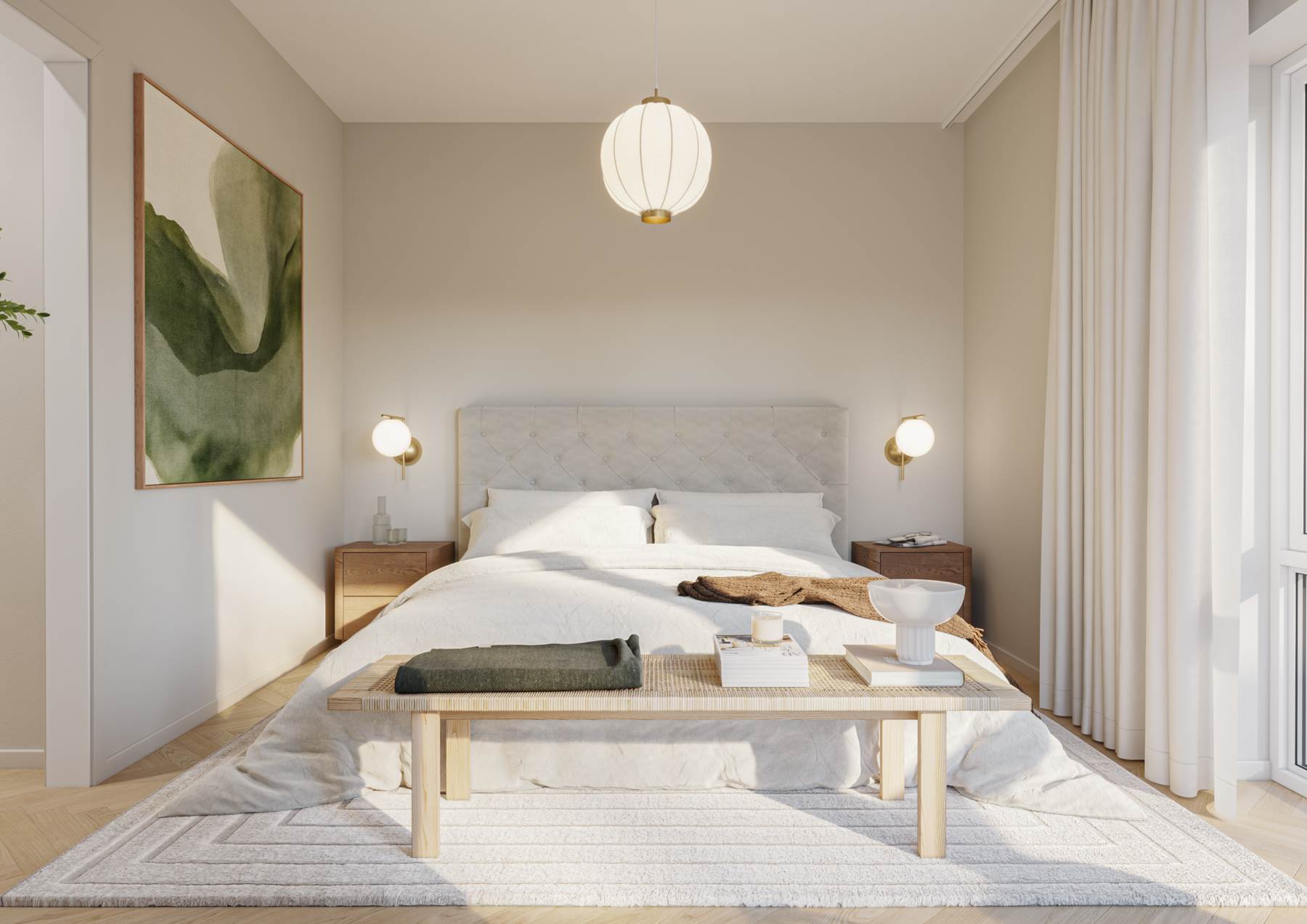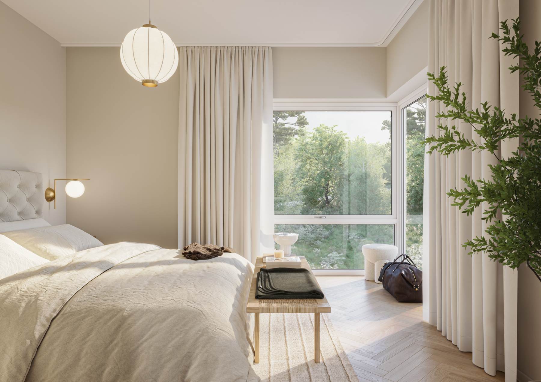Bostäderna i Brf Danderyd Park präglas av ett tydligt kvalitetsfokus – här är material och utförande lika genomtänkta som arkitekturen. Köken är byggda med snickerier från Ballingslöv med stenskivor från Cosentino och kromade detaljer med läderinfattning för en exklusiv finish. Vitvaror kommer från Electrolux och integreras stilrent i inredningen för ett sammanhållande uttryck. I badrummen återkommer samma premiumkänsla med kakel och klinker från Bricmate, armaturer från Tapwell. Golvmaterialen är valda med omsorg. Parhusen har exklusiv fiskbensparkett från Bjelin vilket ger en varm och tidlös bas. Trappor i massiv ek, målade snickerier och harmoniska kulörer knyter samman helheten och ger en lugn och elegant atmosfär. Belysningen är integrerad med spotlights och dimmer i samtliga rum, vilket förstärker ljuset från de stora fönsterpartierna och bidrar till den exklusiva känslan.