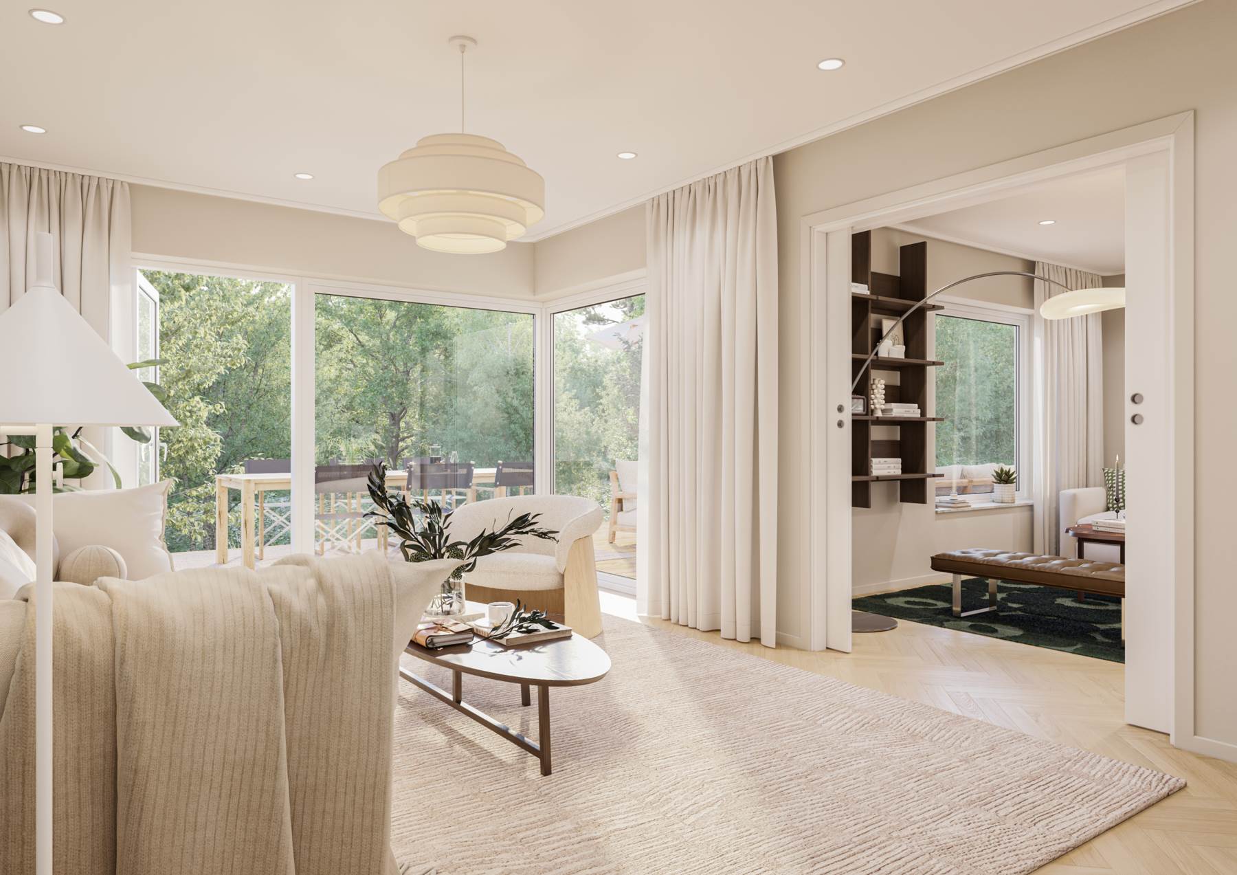 Interiören präglas av tidlös elegans. En välkomponerad materialpalett med stengolv i hall och entré och fiskbensparkett i de sociala ytorna skapar en varm och sammanhållen atmosfär. Harmoniska kulörer, inslag av trä och omsorgsfulla detaljer knyter samman rummen och ger ett stilrent och välkomnande uttryck. De stora fönsterpartierna ger generöst ljusinsläpp och låter naturen utanför bli en del av rumsupplevelsen.