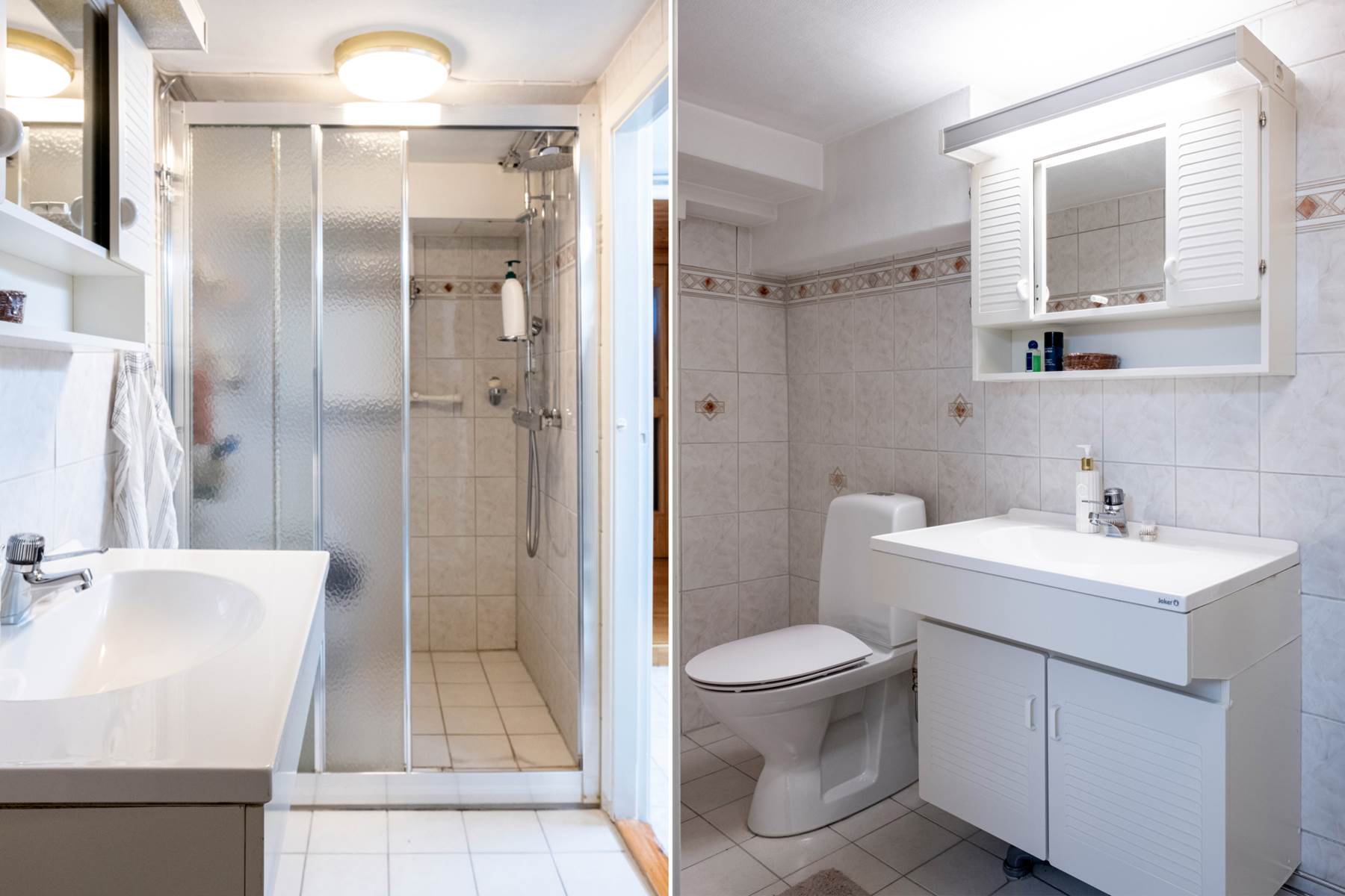 Ljust helkaklat badrum med stor duschplats, WC, handfat i kommod samt skåp med spegel och belysning.