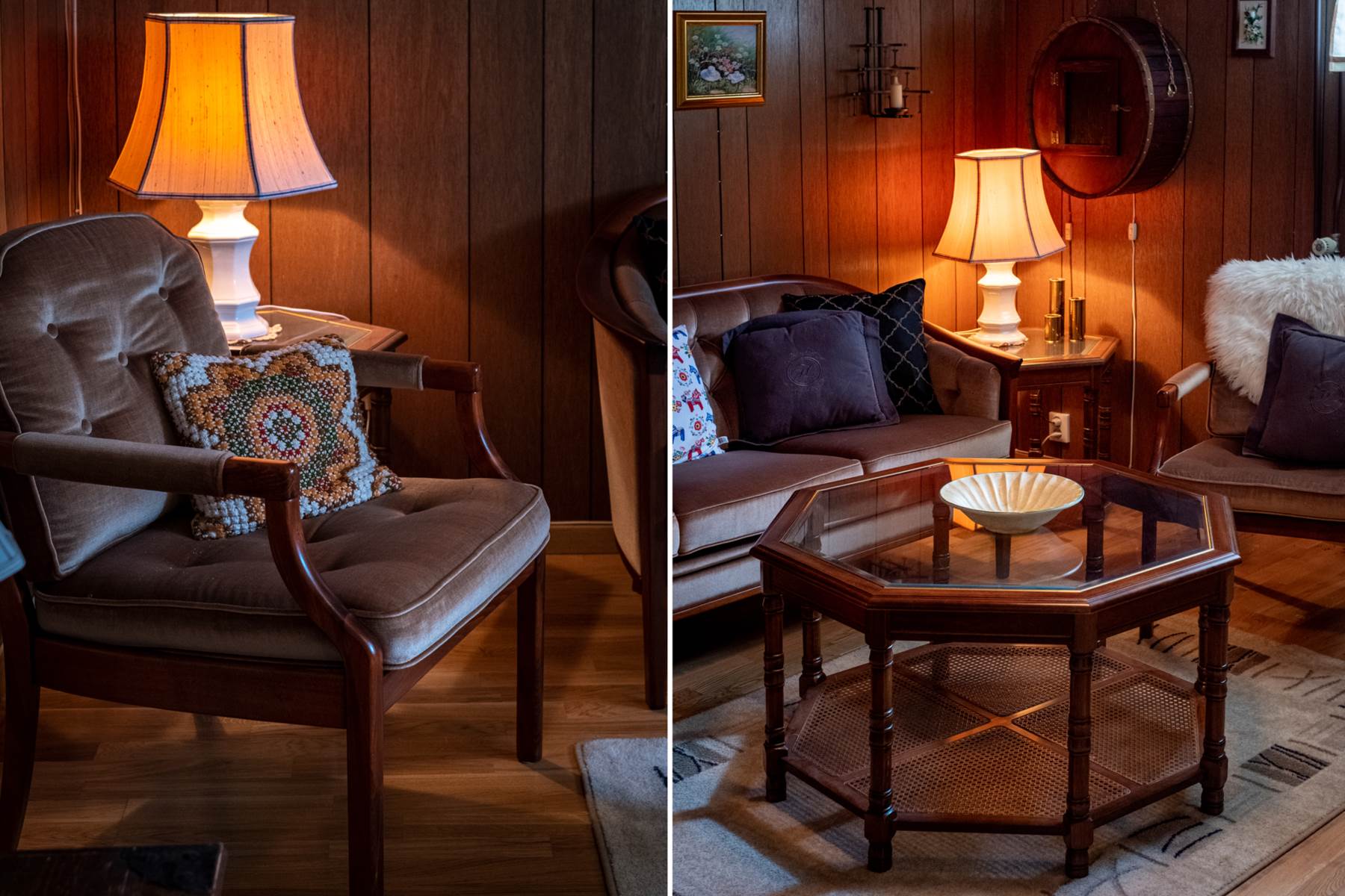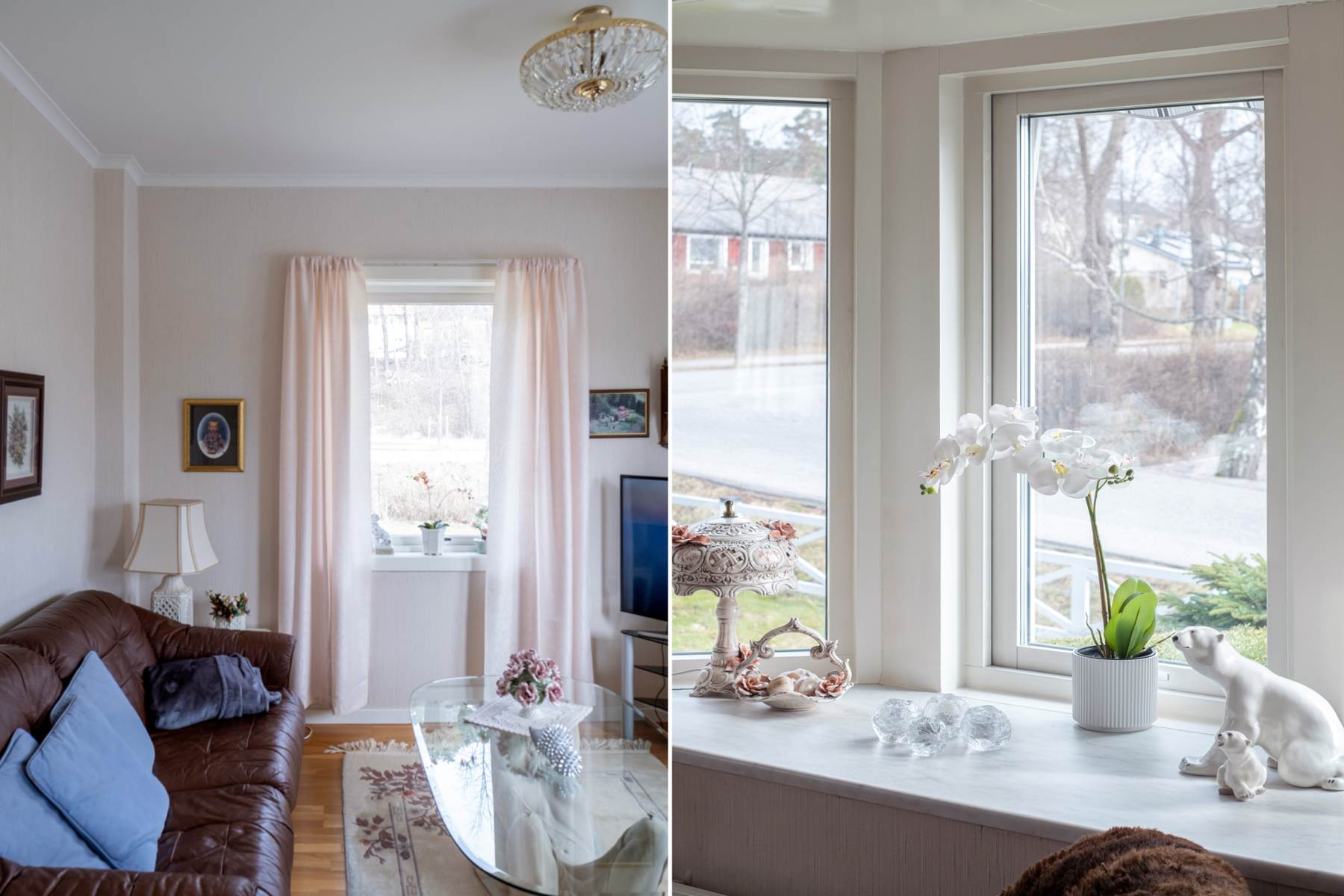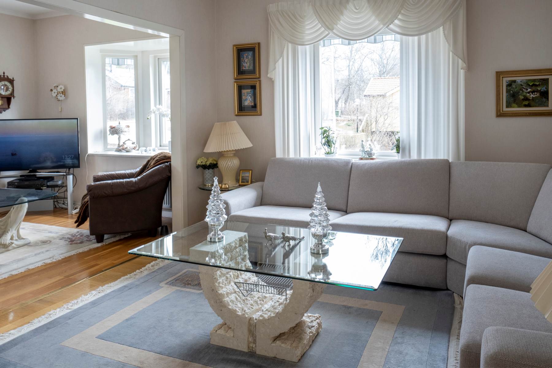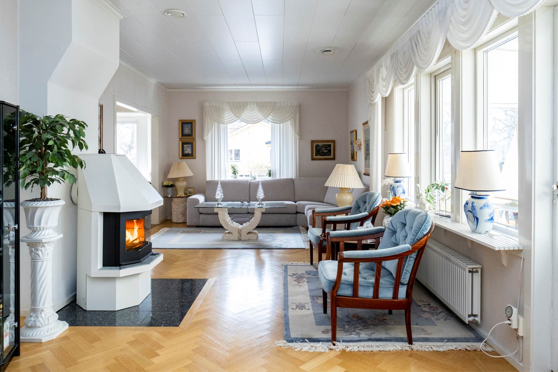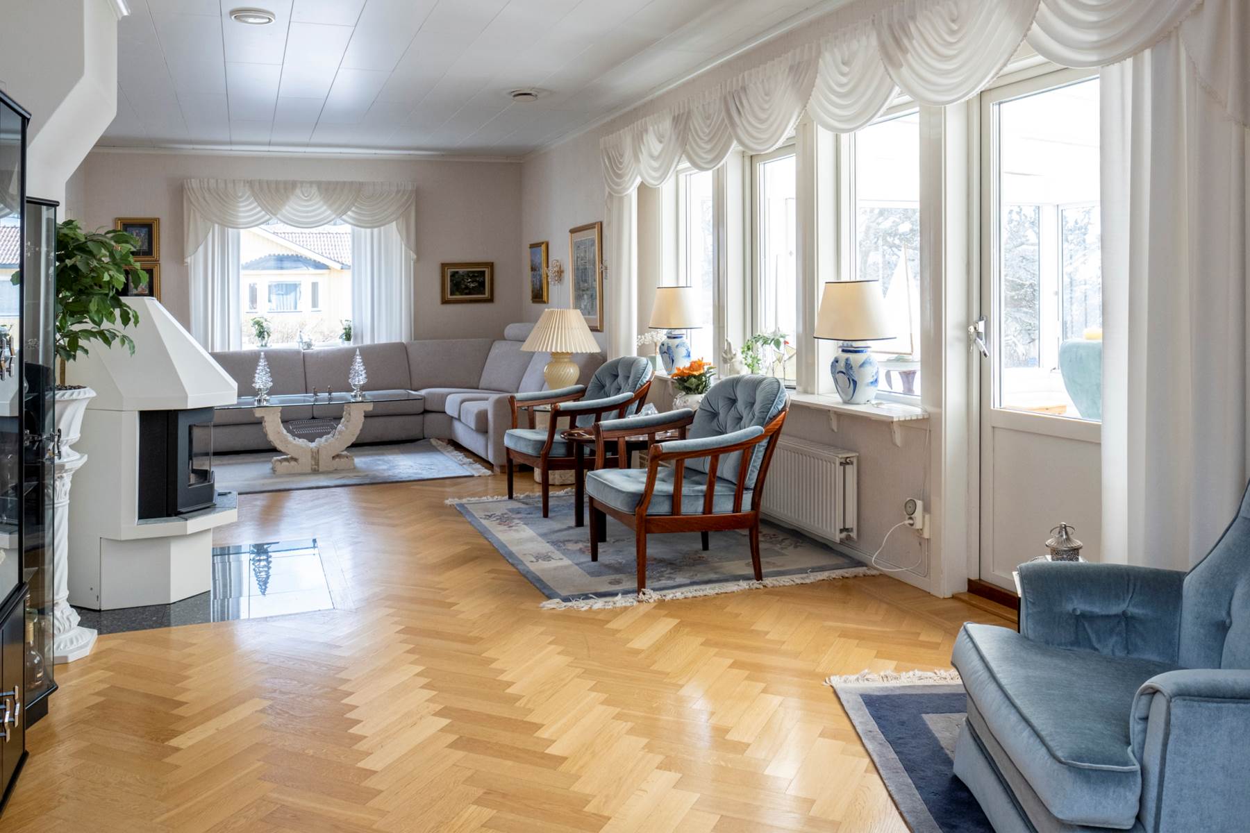Lättmöblerat vardagsrum med välbevarat parkettgolv samt väggar i en ljus ton. Stora fönsterpartier ger ett fint ljusinsläpp och här finns även utgången till det inglasade uterummet. Öppen spis ger rummet extra charm, karaktär och trivsel. I dag har man valt att öppna upp mot ett tidigare sovrum och på det sättet fått ett vardagsrum i vinkel. Önskar man kan man enkelt återställa detta och få ytterligare ett rum.