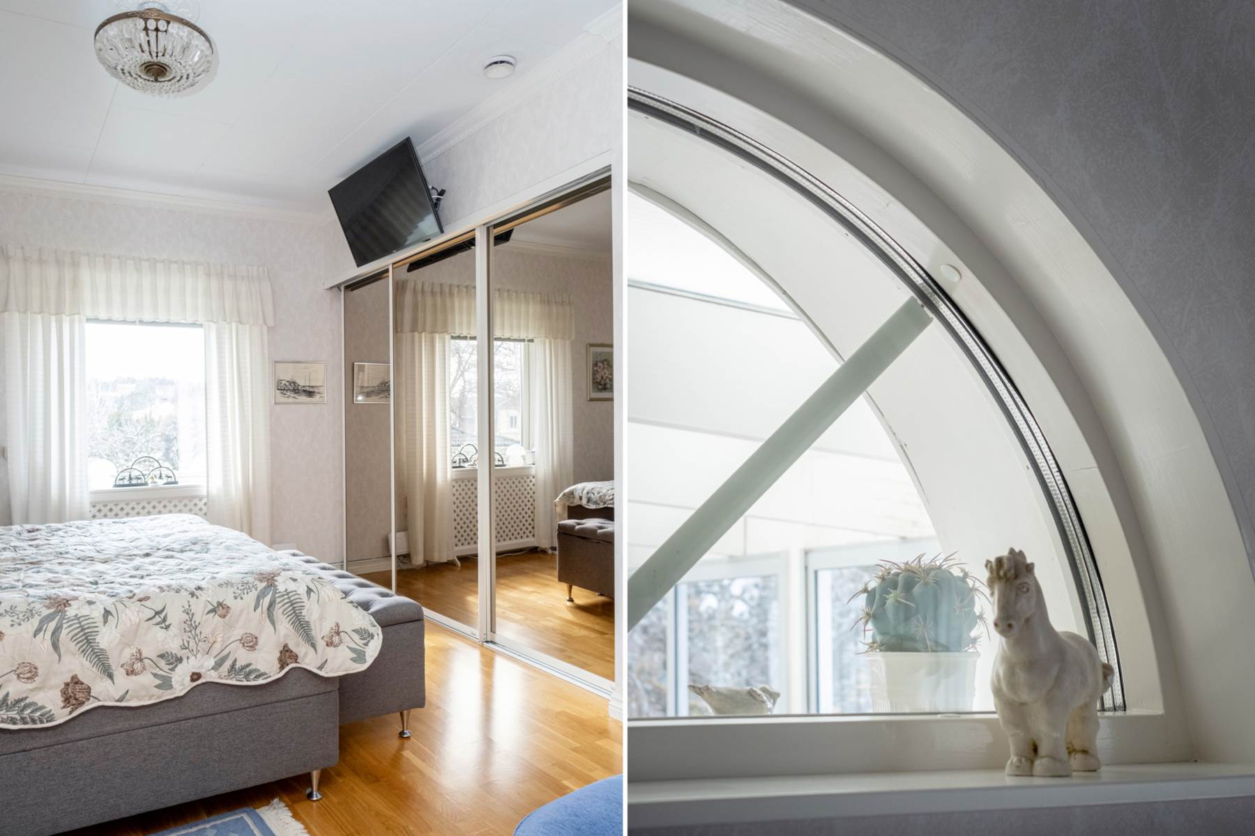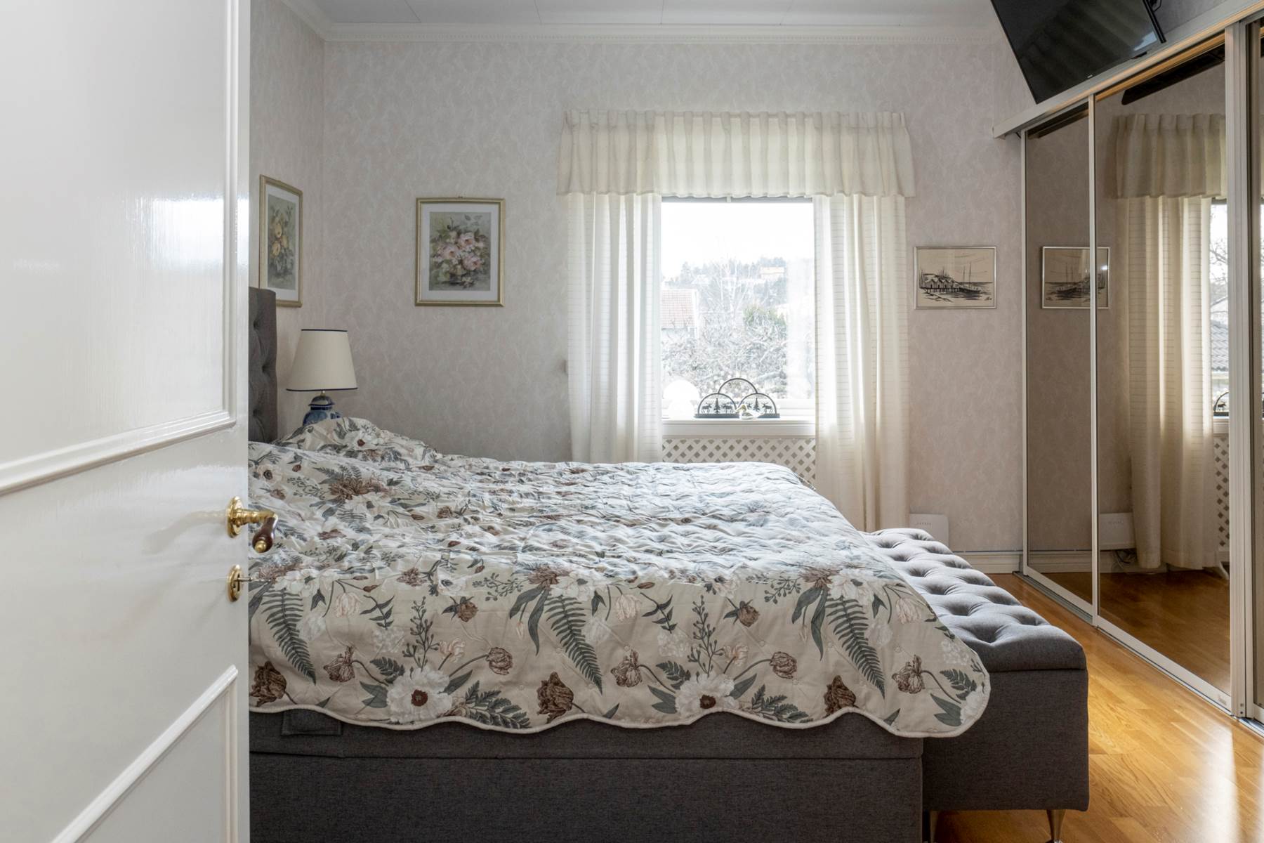 Rymligt sovrum med gott om plats för en dubbelsäng. Här finns fina förvaringsmöjligheter i garderober med spegelskjutdörrar och rummet har fönster i två väderstreck vilket ger ett fint ljusinsläpp.