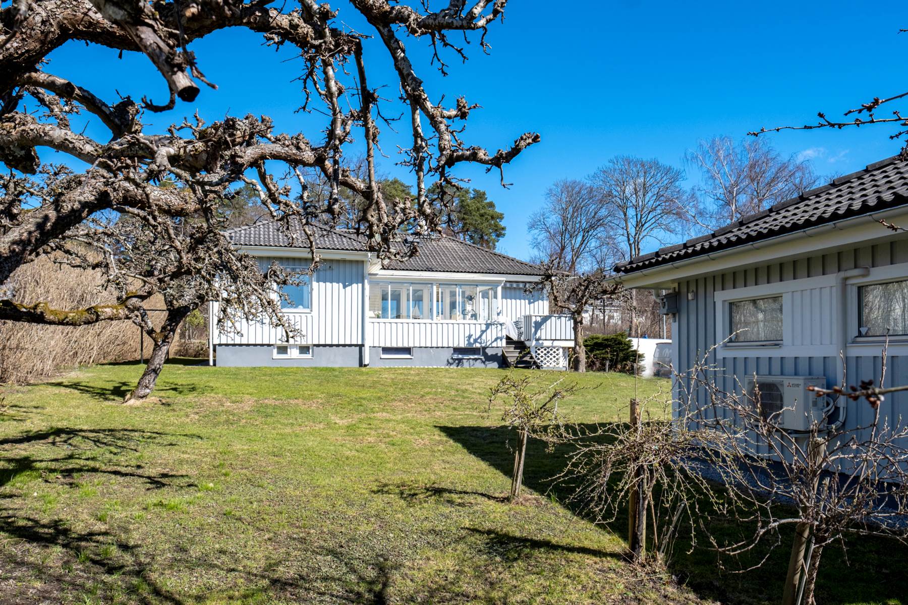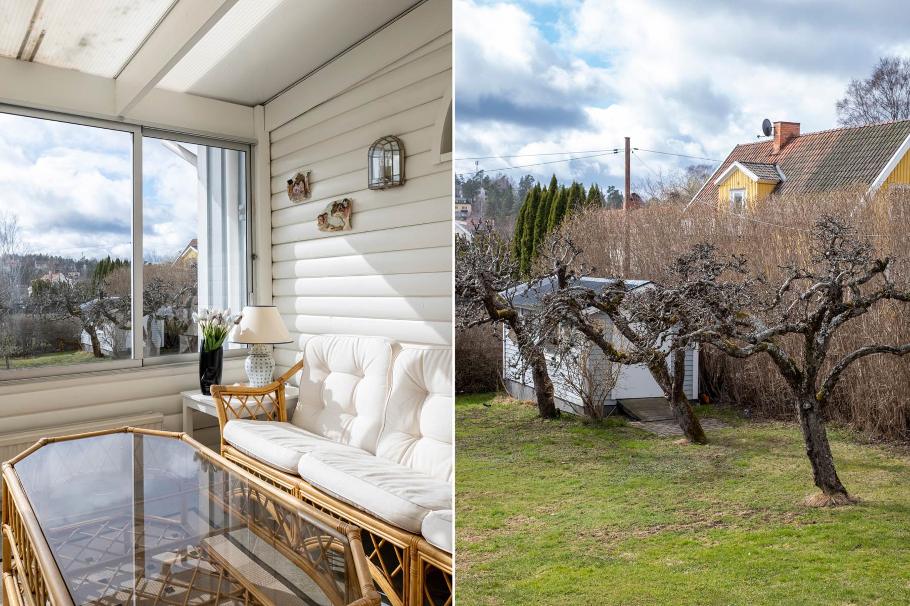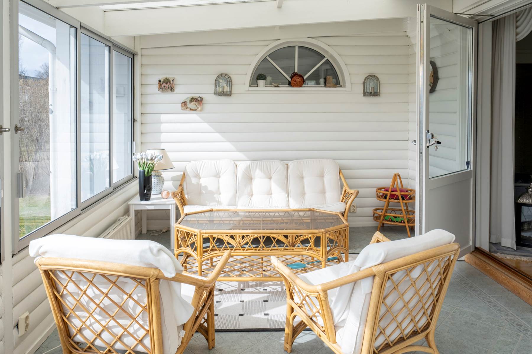 Inglasat uterum i perfekt solläge mot den grönskande trädgården. Tack vare behaglig golvvärme kan man nyttja detta rum i stort sett hela året.