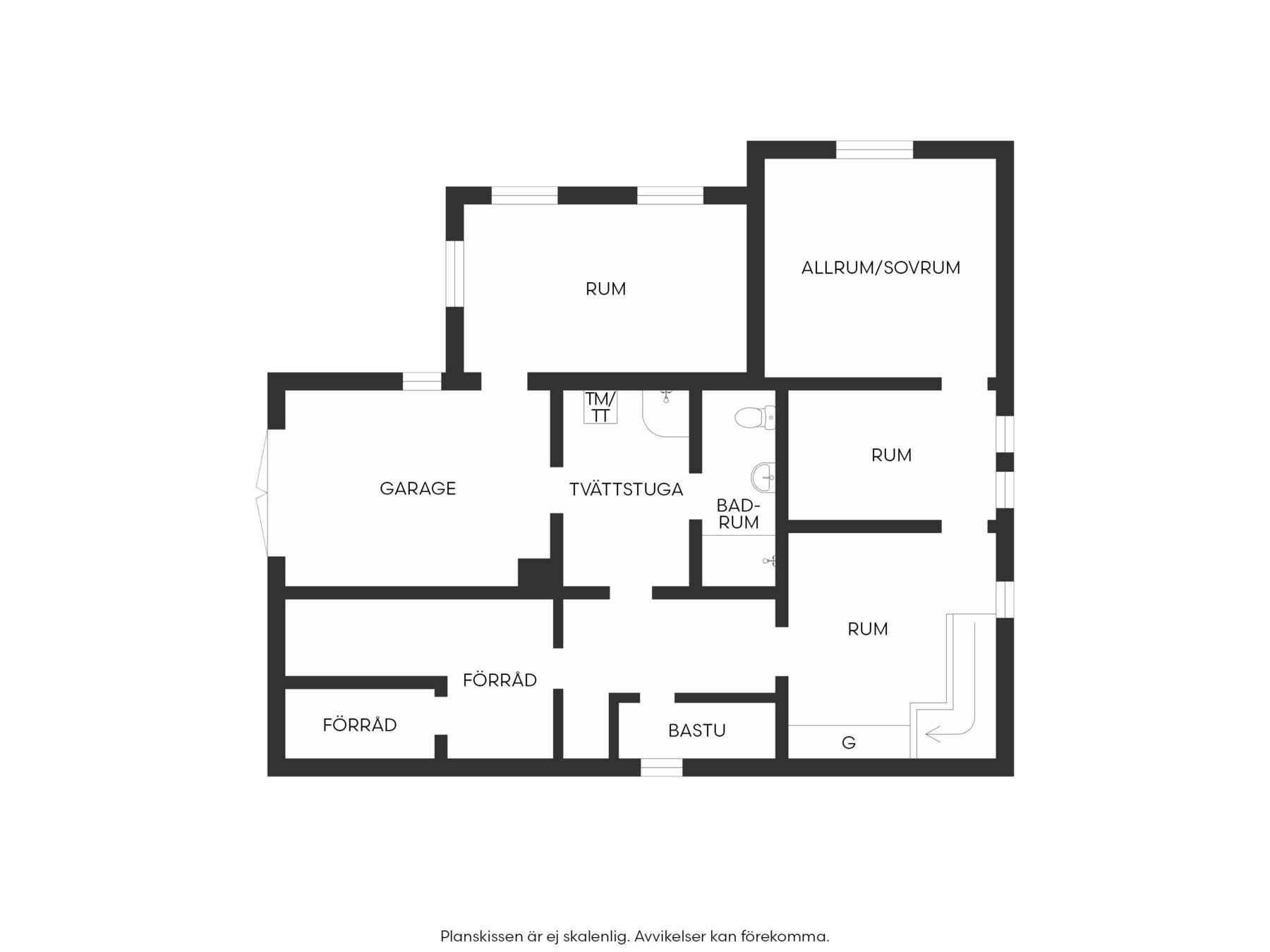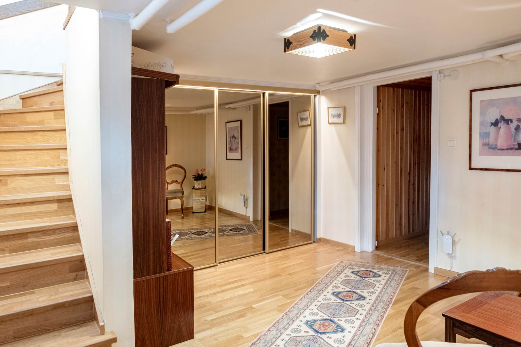 Gjuten trappa leder ner till källarvåningen där man möts av ett allrum som med fördel kan användas som TV-rum om man önskar. Här finns en garderobsvägg med skjutdörrar som erbjuder fin förvaringsplats som även fortsätter in under trappan.