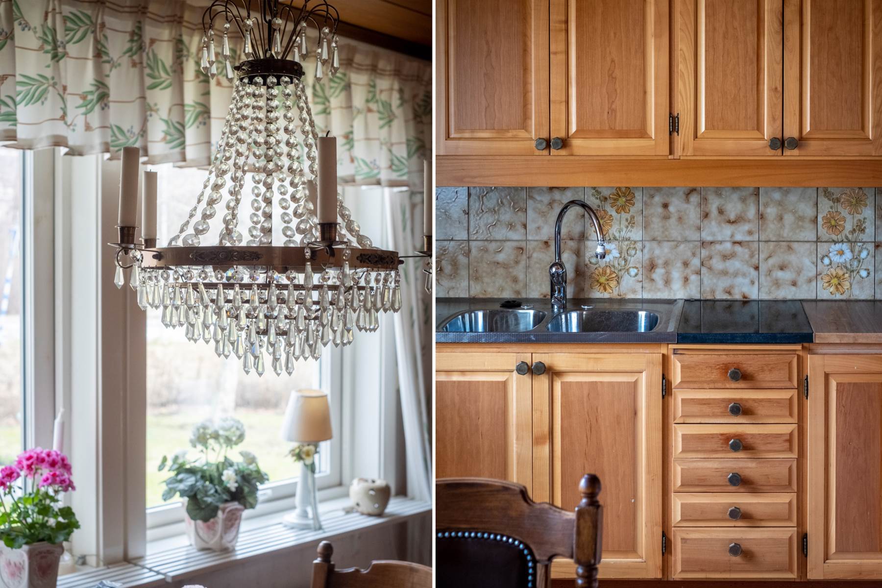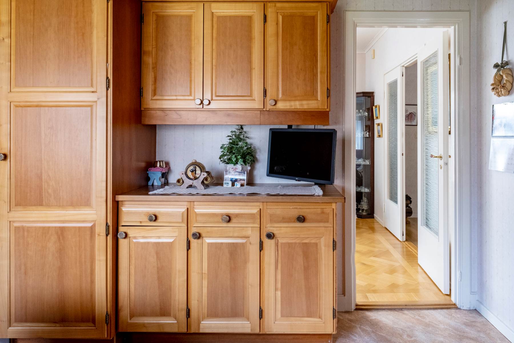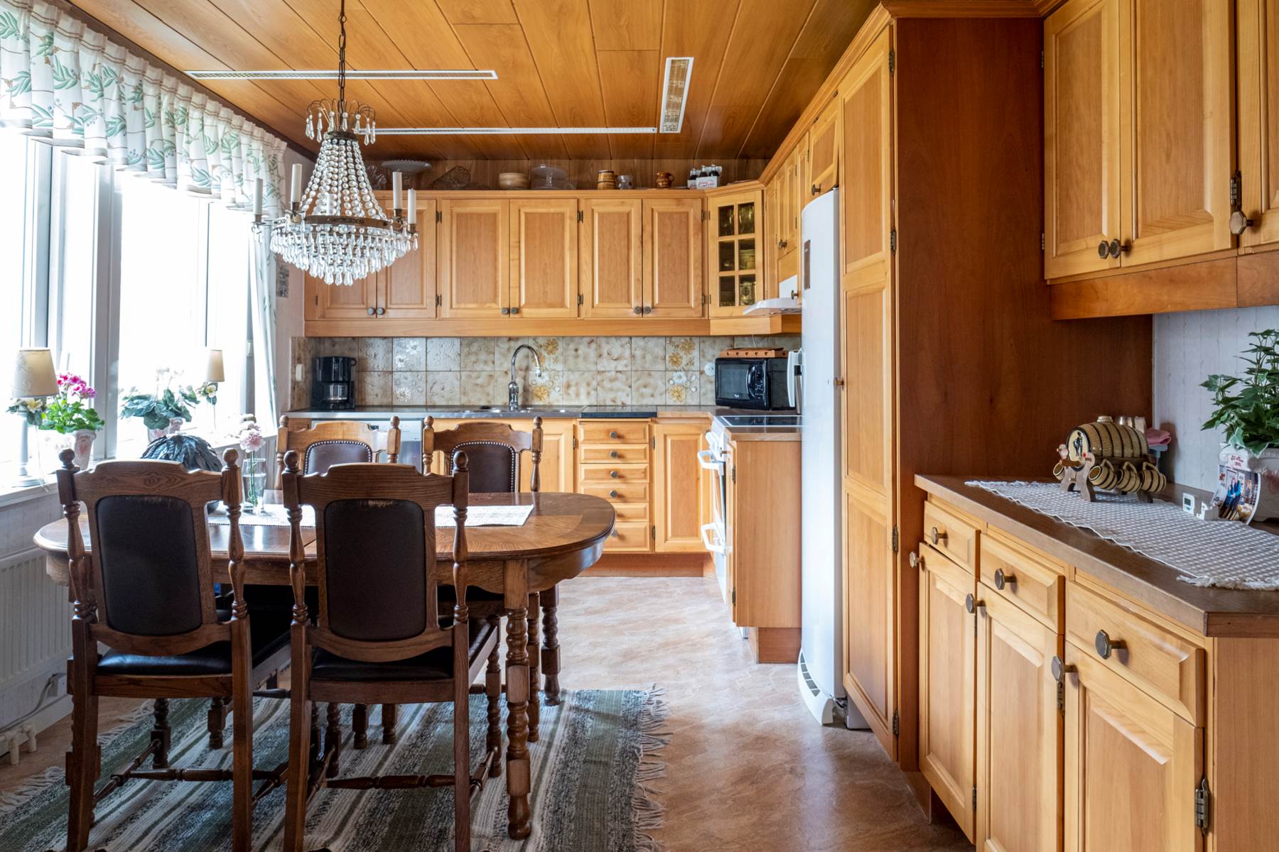 Ett välbevarat canadakök i massiv körsbär som erbjuder gott om förvaringsmöjligheter. Bra matplats för flertalet personer vid trevligt fönsterparti inbjuder till middagar med familjen eller goda vänner. Plastmatta. ljusa väggar samt mönstrat kakel ovanför arbetsbänkarna. Den maskinella utrustningen består av: spis med häll, fläkt, diskmaskin (2025) samt kyl i fullhöjd.