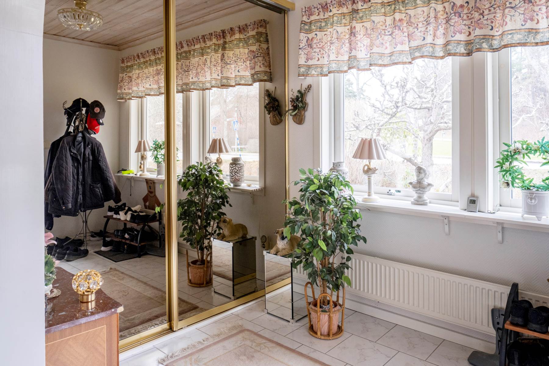 Välkomnande entréhall med praktiskt klinkergolv i en ljus ton samt ljusa väggar. Gott om avhängningsmöjligheter för ytterkläder och skor samt ytterligare förvaringsplats i platsbyggd garderob med fina spegelskjutdörrar. Stora fönsterpartier ger ett fint ljusinsläpp. Här finns behaglig golvvärme.