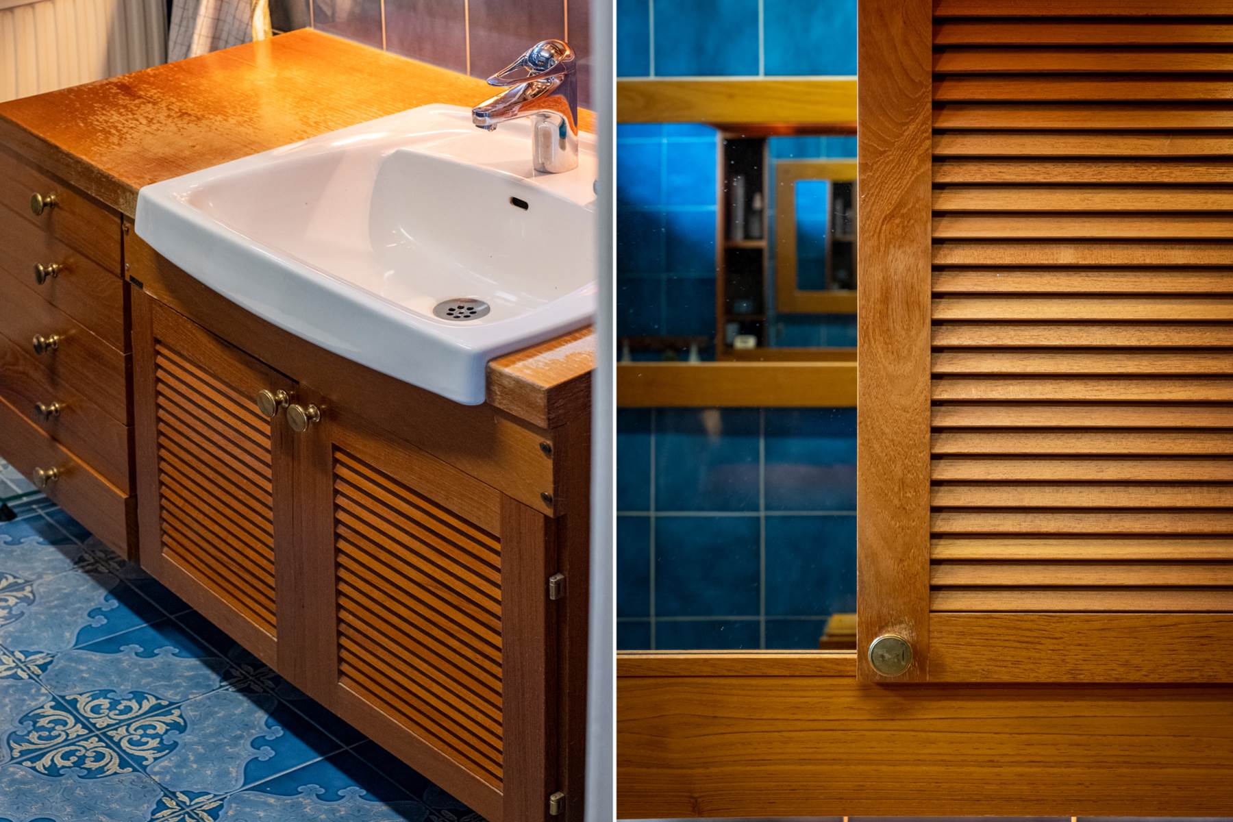 Helkaklat WC i klarblå toner med matchande bård. WC samt handfat i kommod. Om man önskar ett större badrum kan man enkelt integrera klädkammaren helt eller delvis för att utöka ytan.
