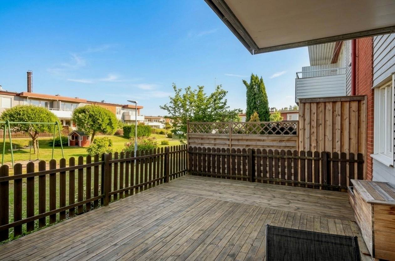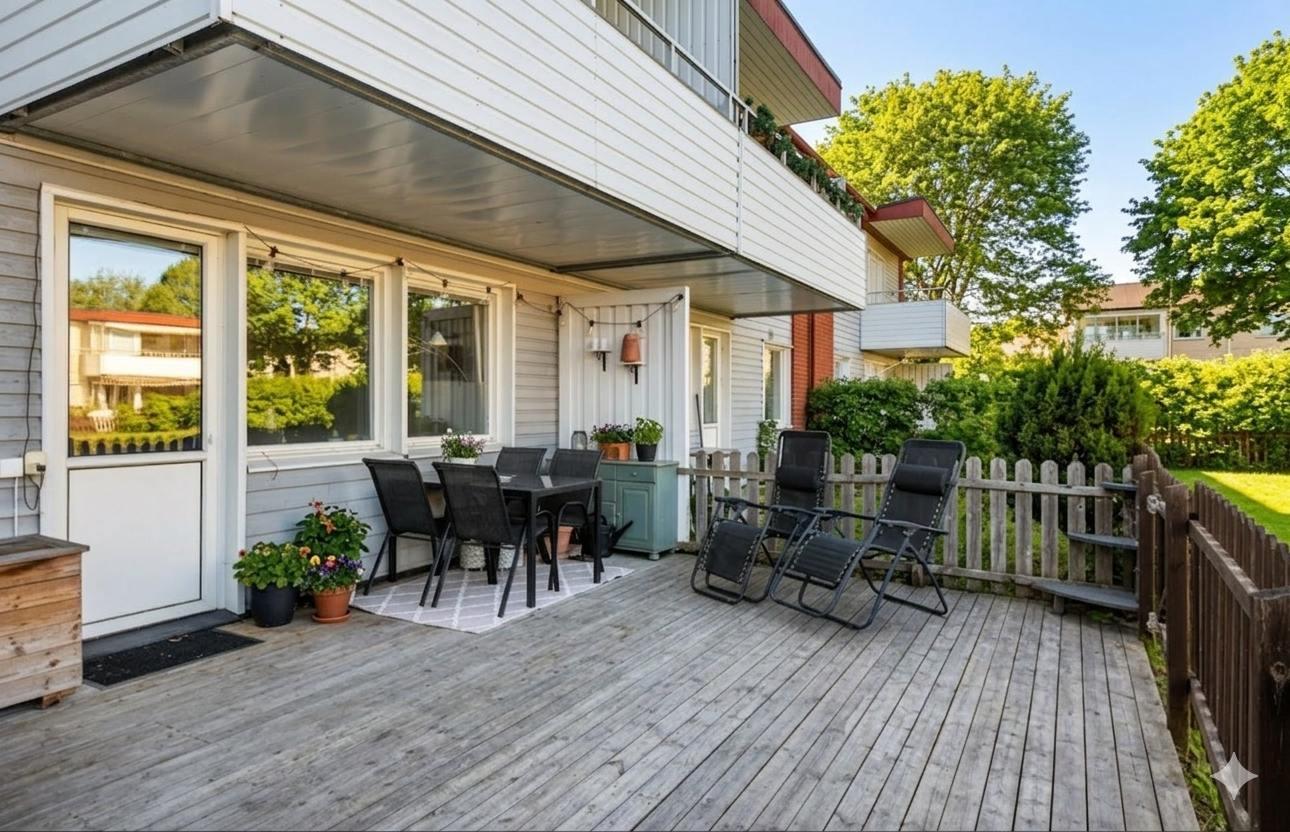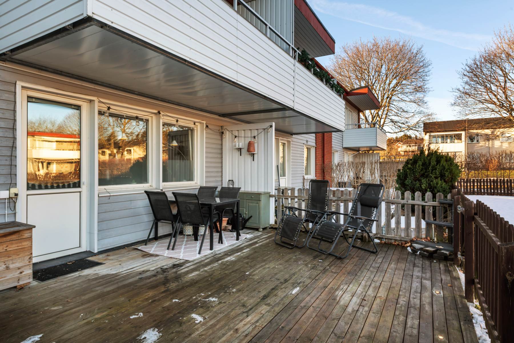 Den generösa terrassen, som vetter mot den rofyllda innergården, blir en naturlig förlängning av vardagsrummet. Här finns gott om plats för både loungemöbler och matgrupp, en praktisk och uppskattad yta för såväl vardag som sociala tillfällen.