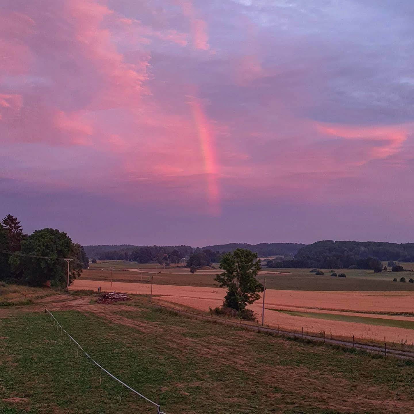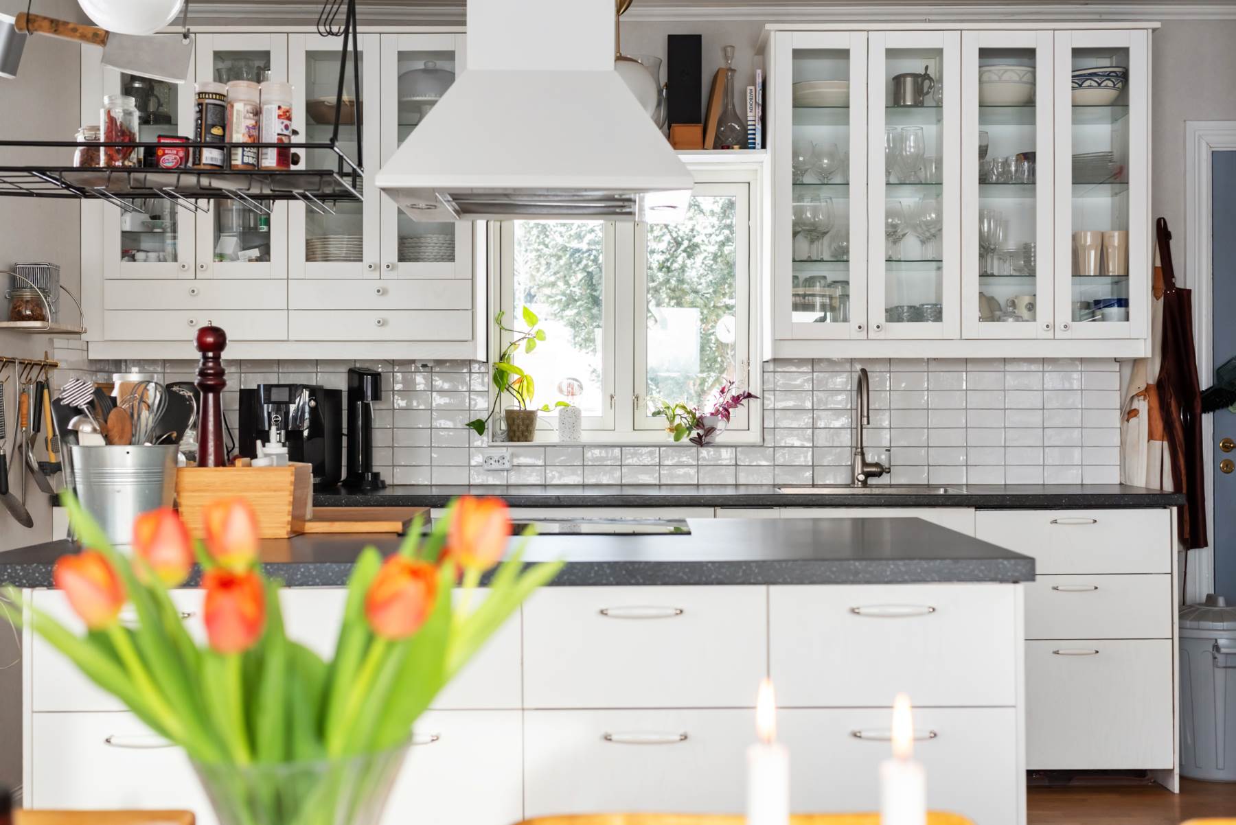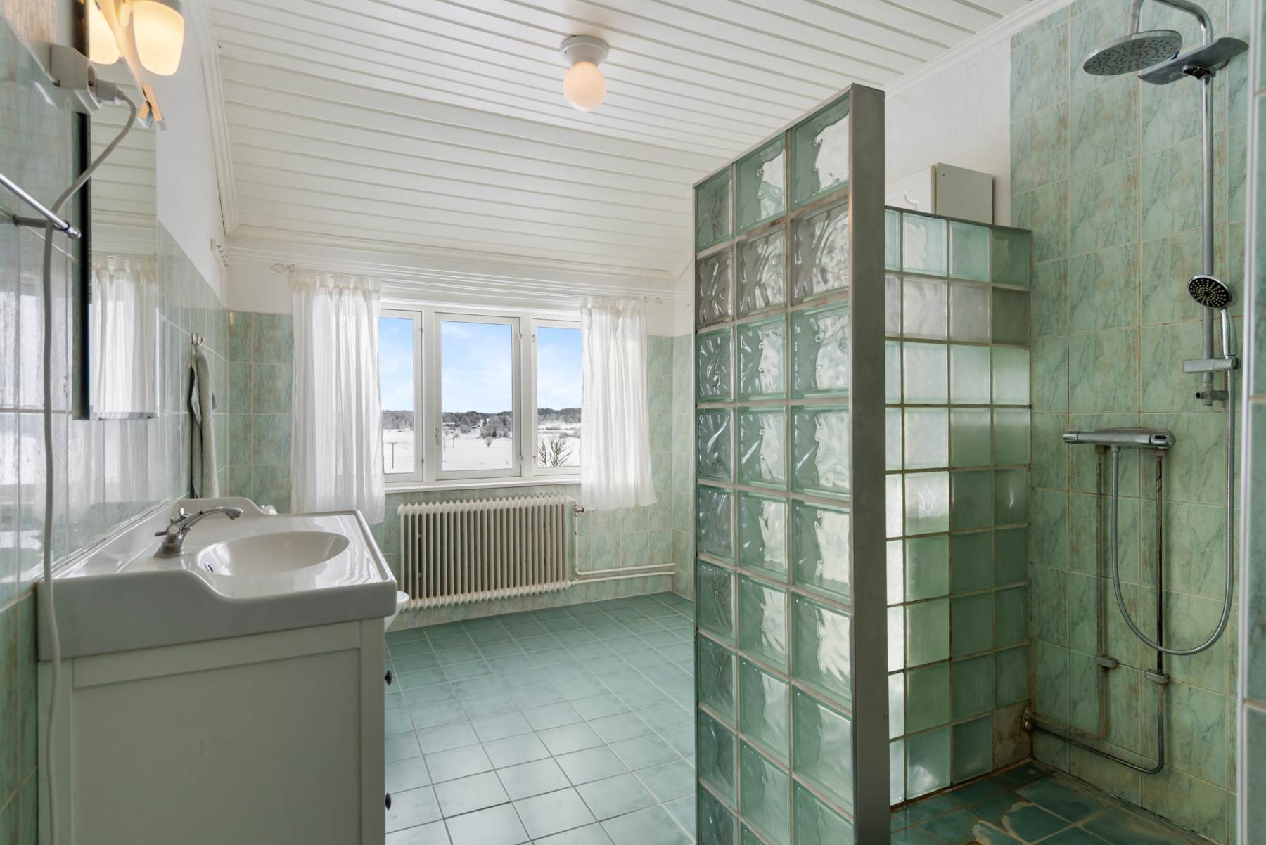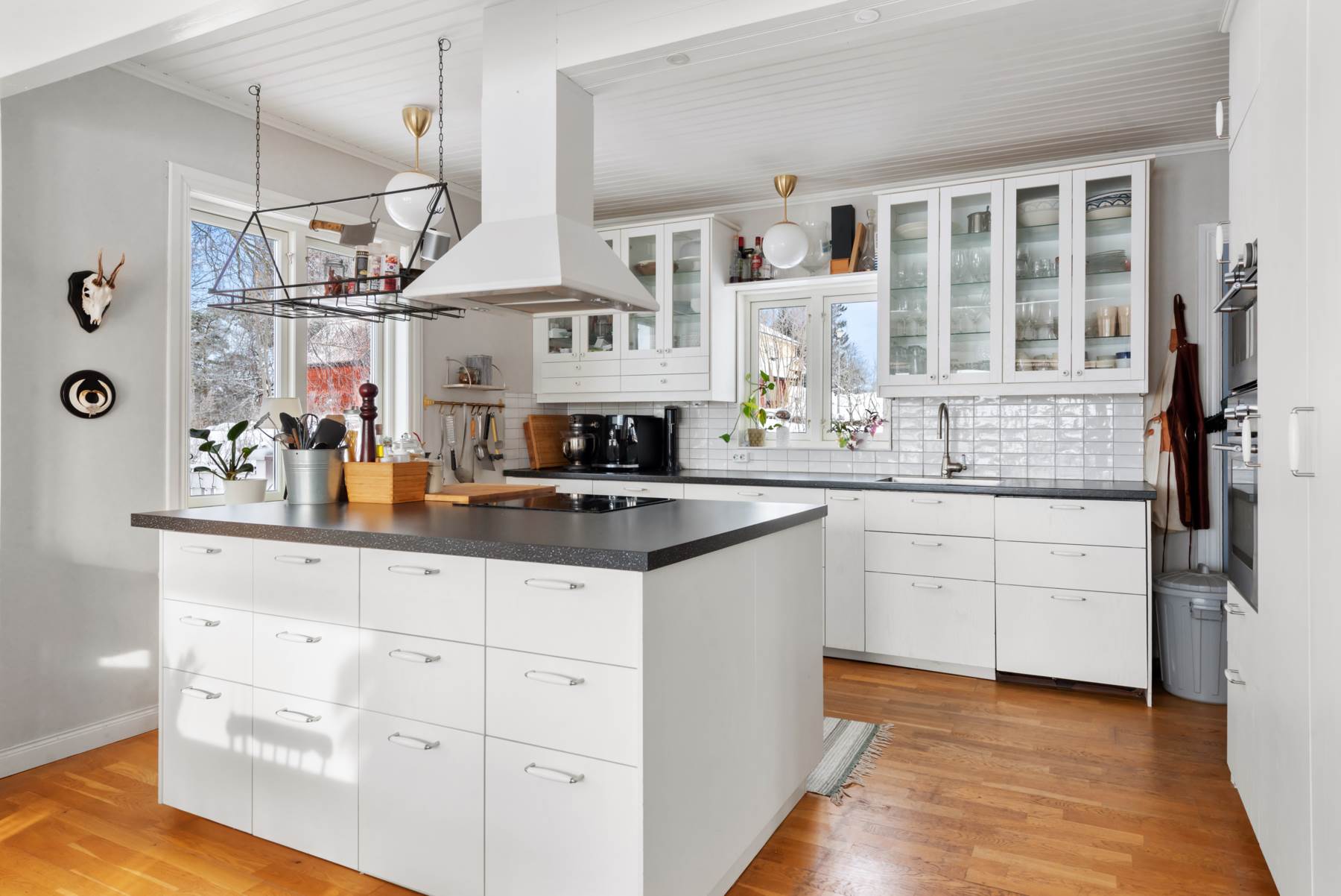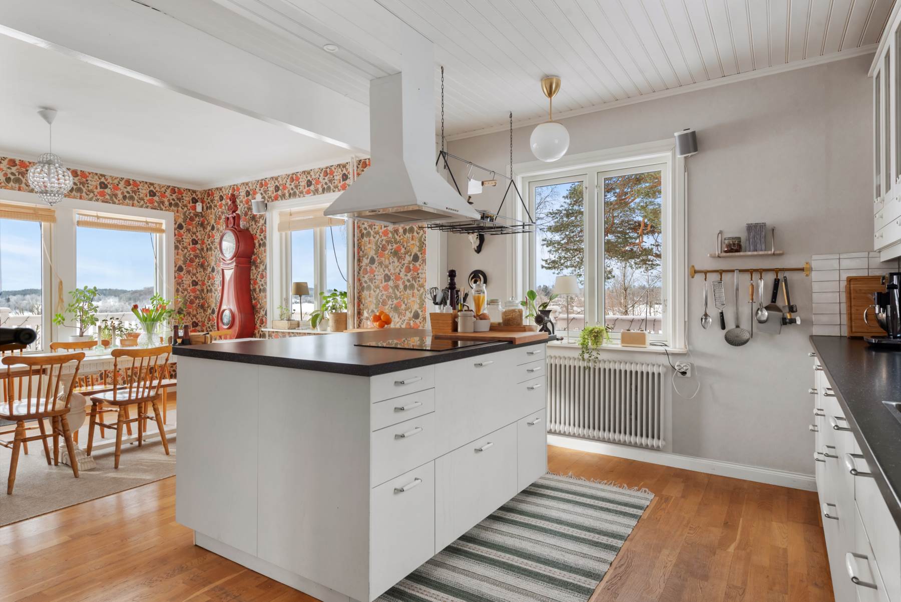 Vidare når du hjärtat i bostaden - familjens väl tilltagna kök. Här kan du laga mat och umgås med familj och vänner samtidigt. Vackra vitrinsskåp och gott om matlagningsytor. All maskinell utrustning du behöver finns här så som ugn, micro, kyl, frys och diskmaskin. En trevlig köksö med infälld spis och fläkt ovanför, står mitt i rummet. Matplats har du framför stora fönsterpartier och utsikten från matbordet tar nästan andan ur en! Ängar, hagar och åkrar ligger i ett böljande landskap utanför.