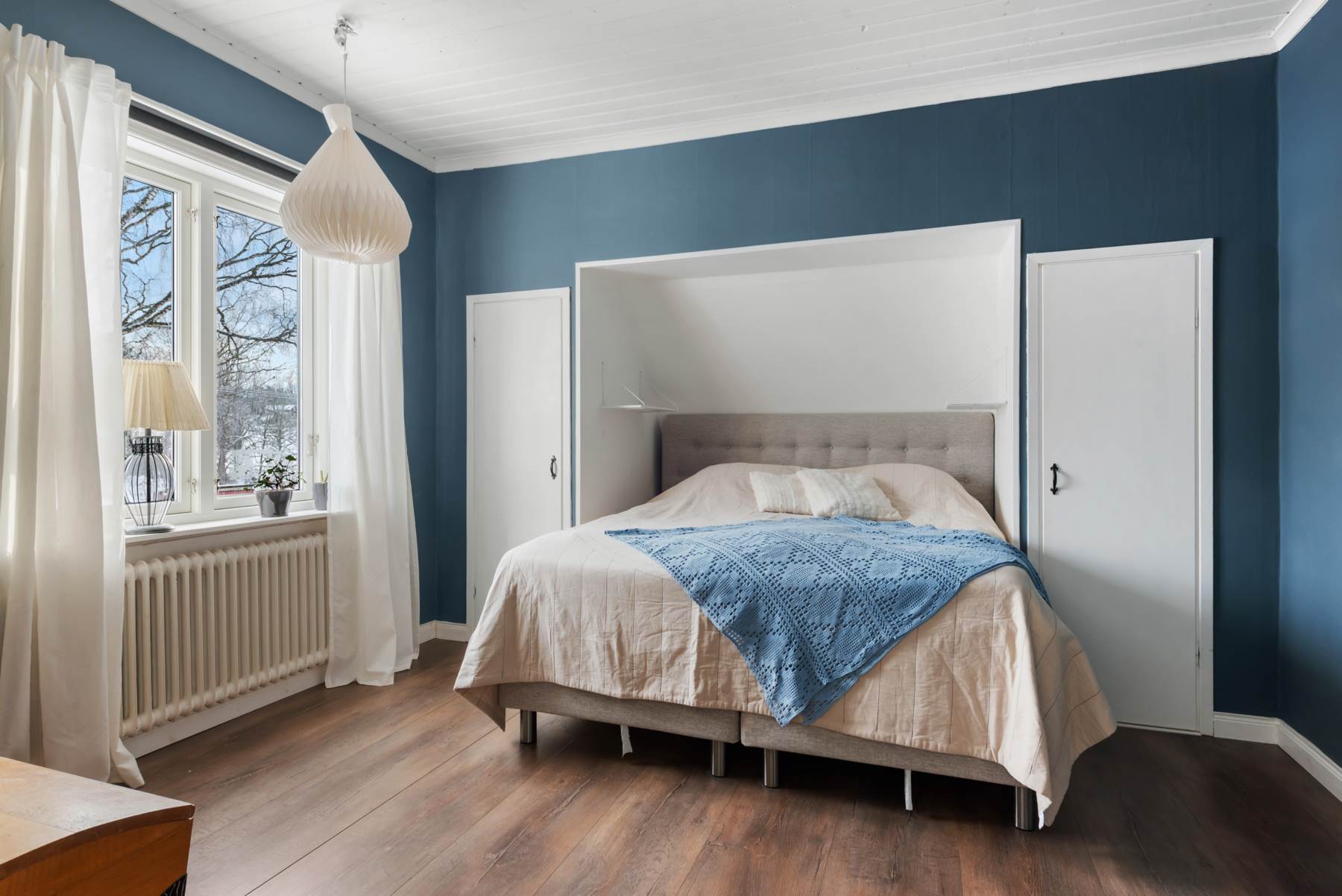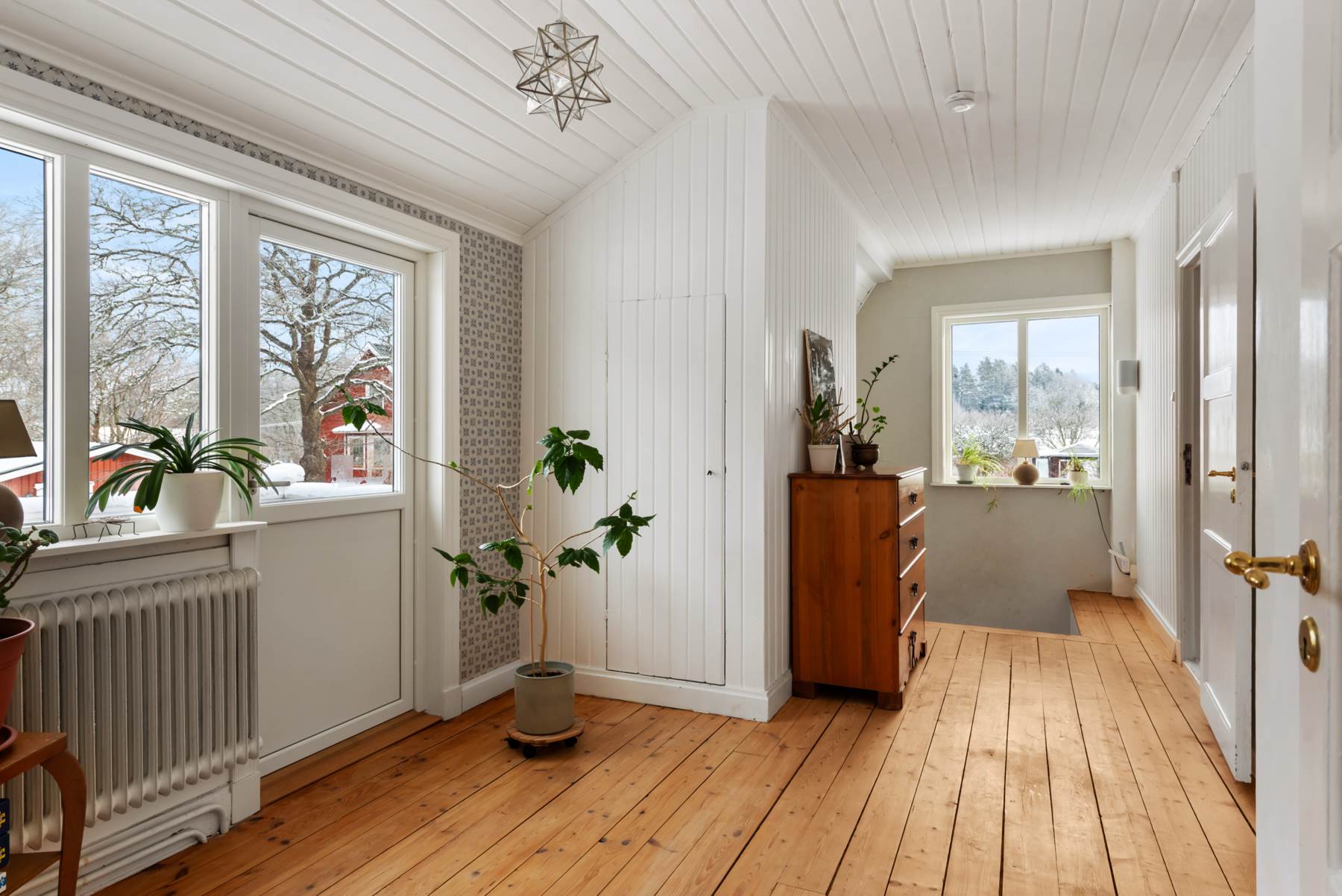 Intill trappan så har du ett WC-rum. Trappan tar dig upp på det övre planet. Här har du en övre hall, tre tilltagna sovrum och ett rymligt duschrum. Även här har har du en balkong denna i norrläge.