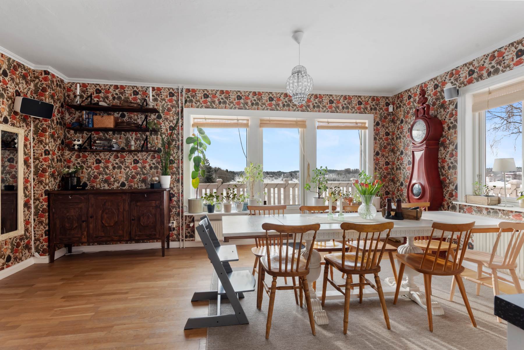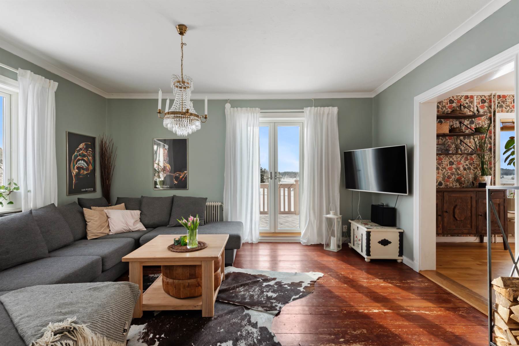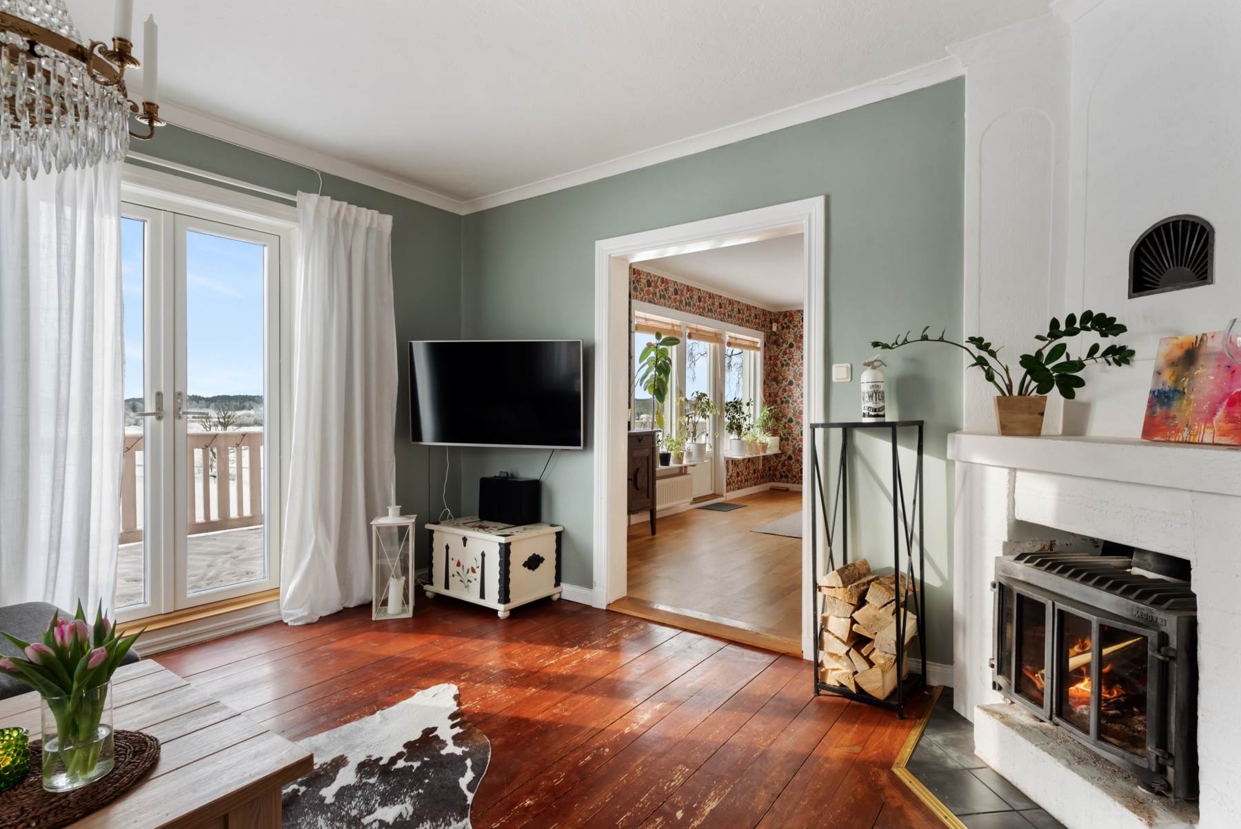 Från matrummet når du husets vardagsrum. En värmande braskamin finns i rummets ena hörn och ger extra värme under kallare årstider. Här har du utgång via dubbeldörrar till den stora balkongen som ligger i härligt söderläge. Perfekt att duka upp för sommarens måltider.