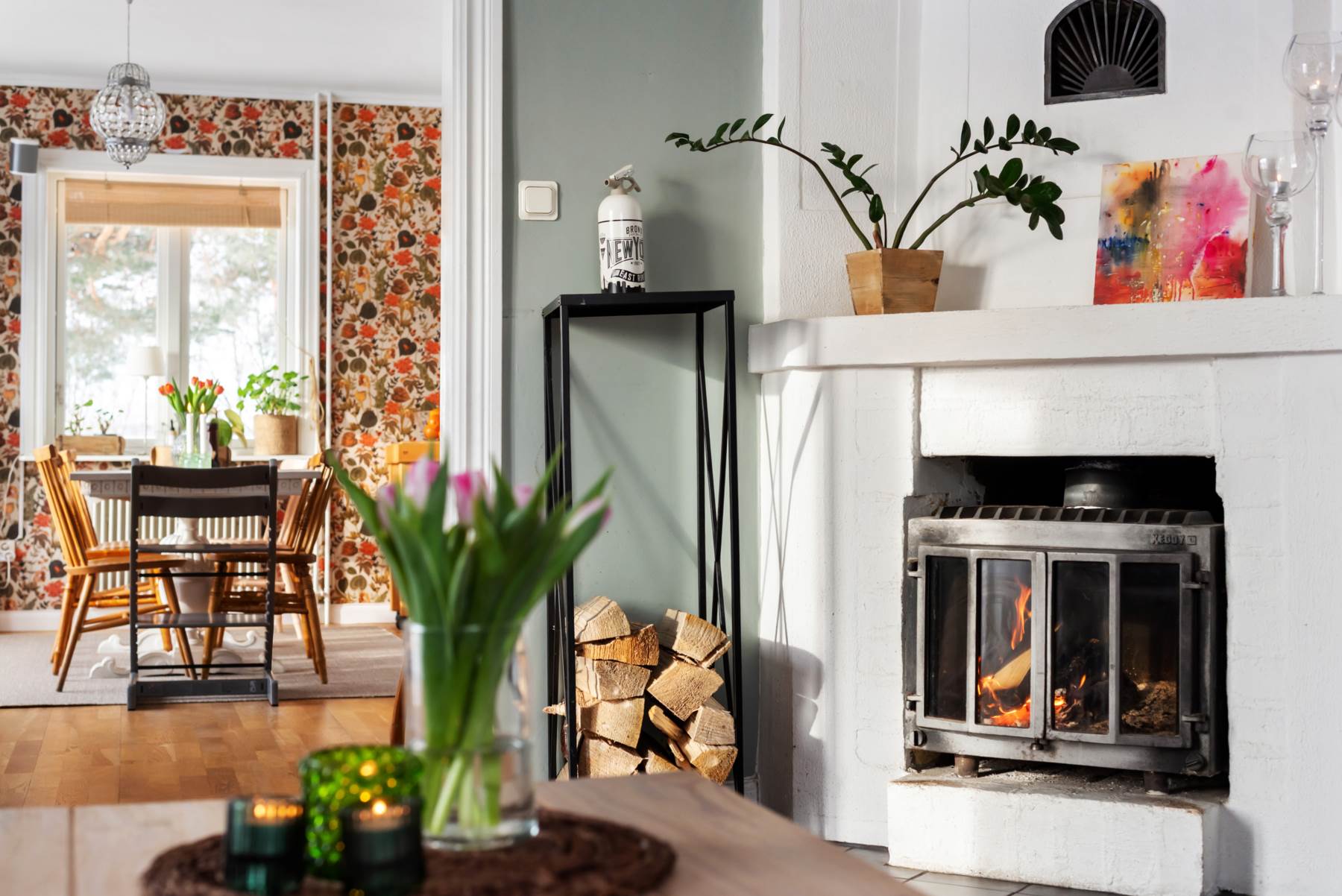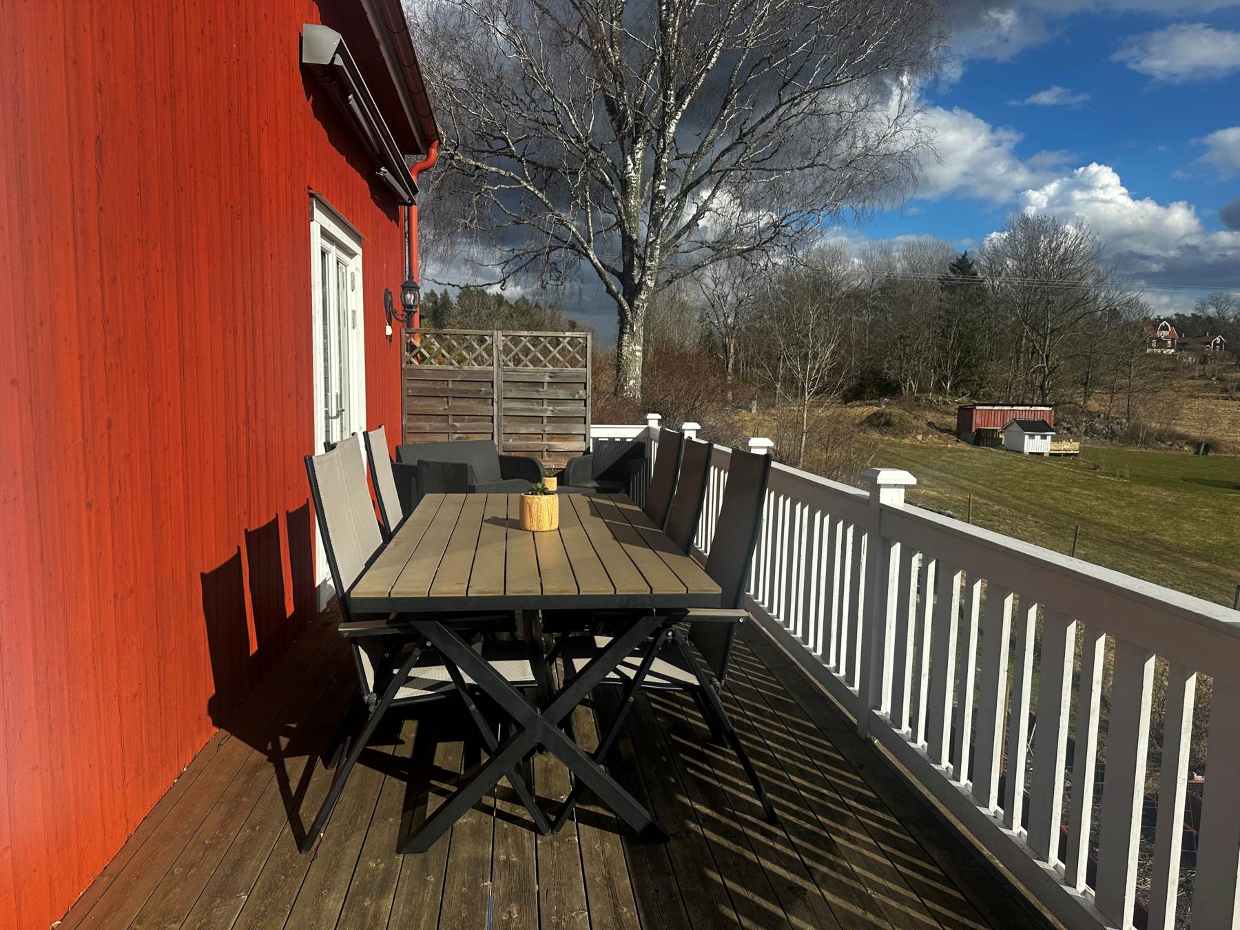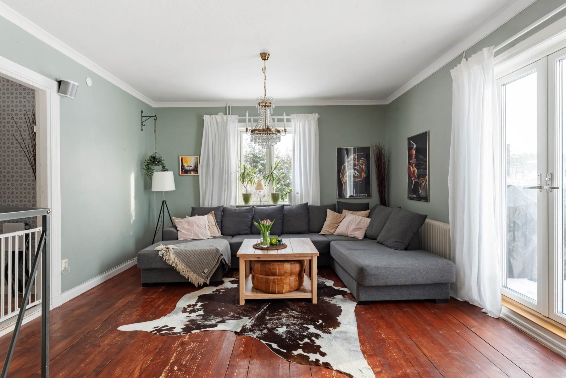Från matrummet når du husets vardagsrum. En värmande braskamin finns i rummets ena hörn och ger extra värme under kallare årstider. Här har du utgång via dubbeldörrar till den stora balkongen som ligger i härligt söderläge. Perfekt att duka upp för sommarens måltider.