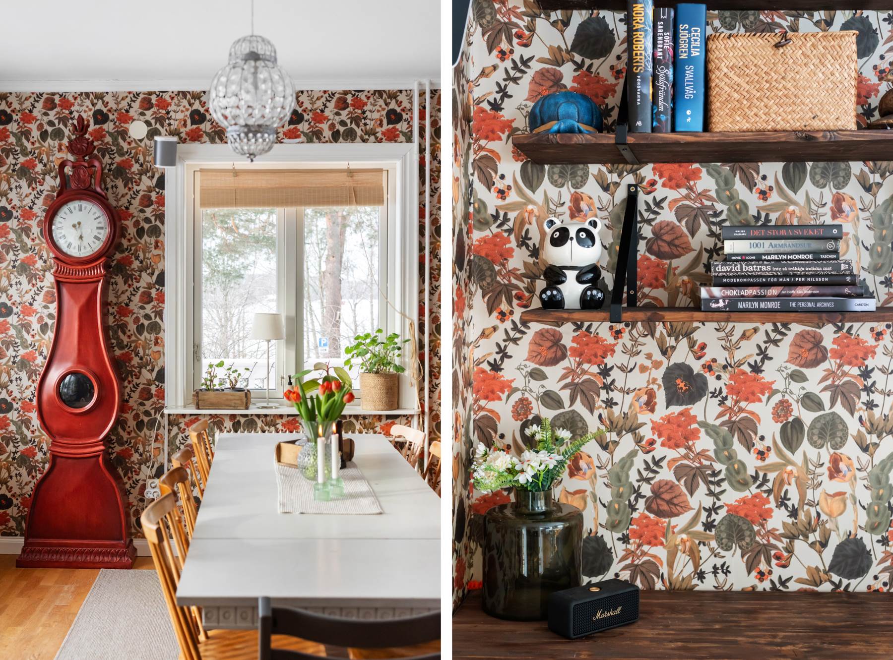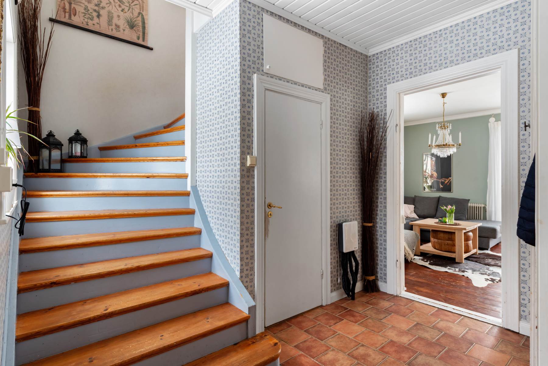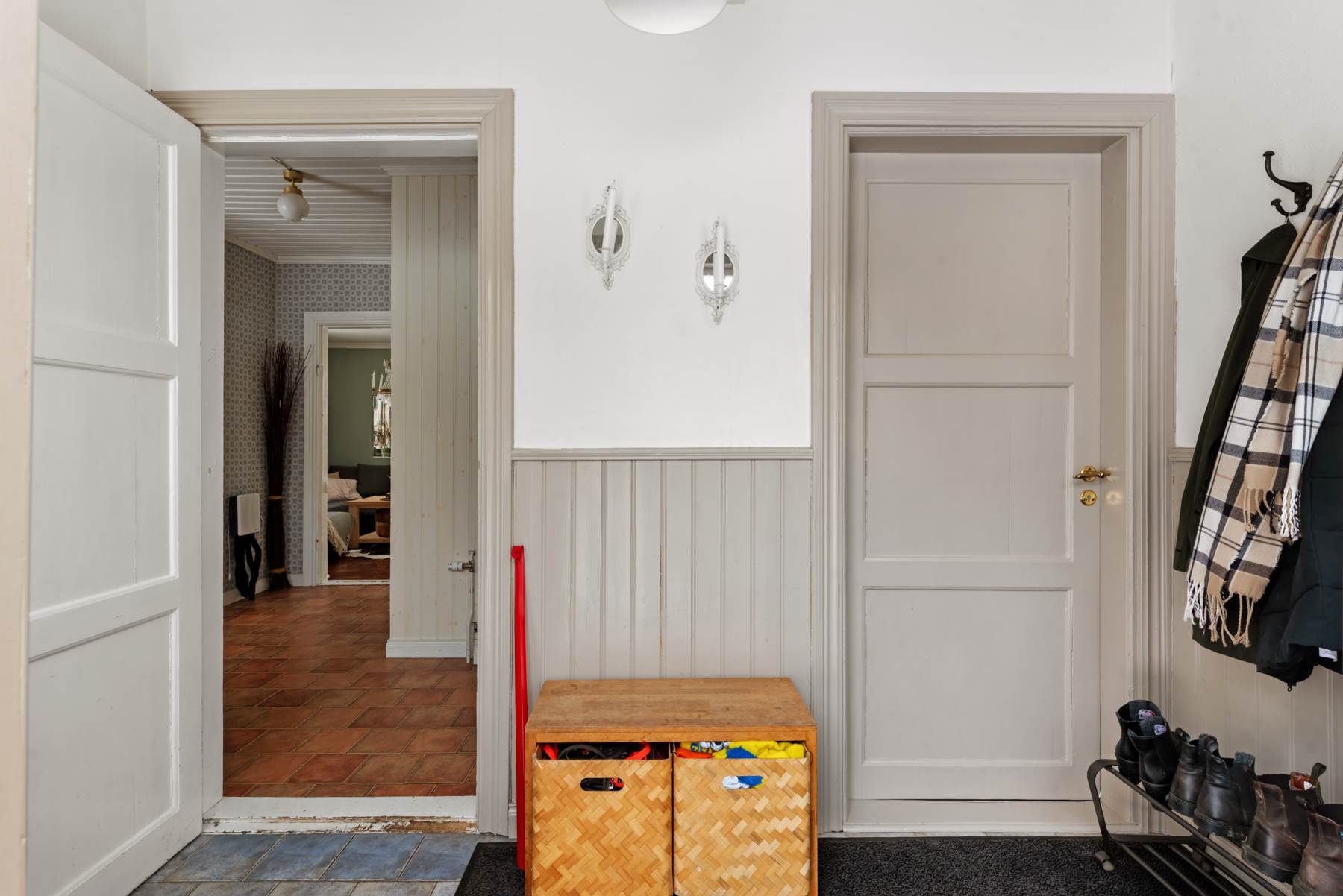 Byggnaden ligger högt placerad på tomten och här kliver du in i familjens hall med plats för att hänga av dig dina ytterkläder och skor.