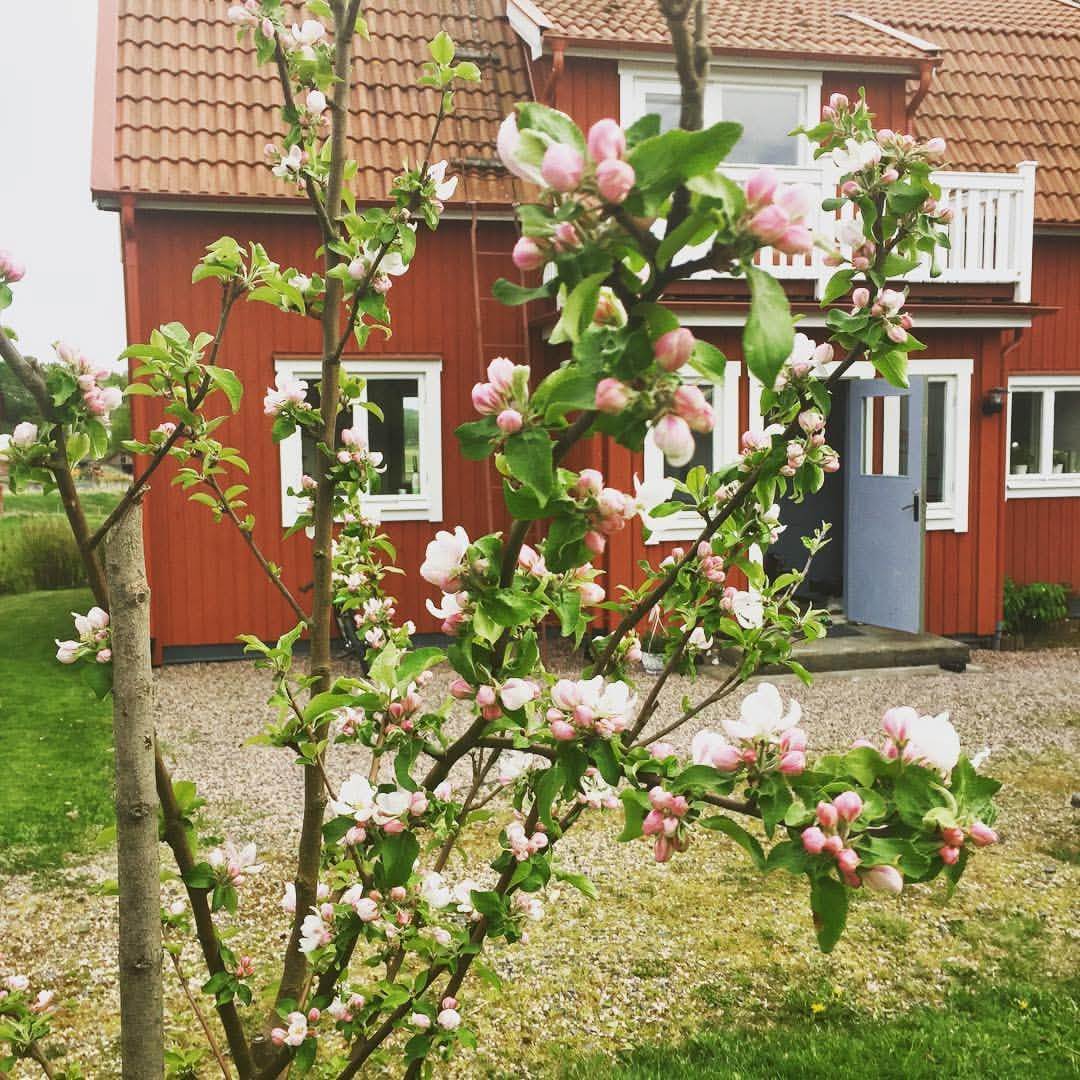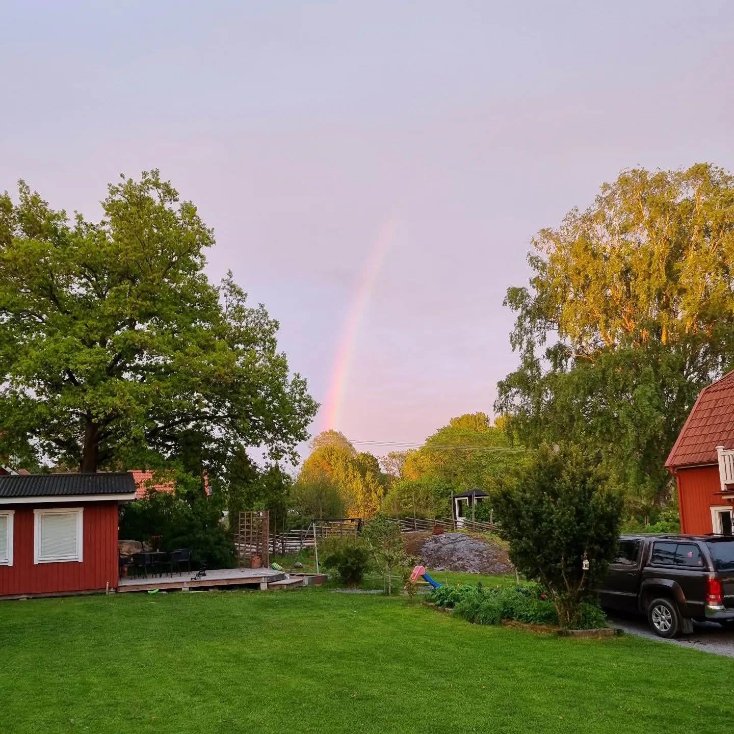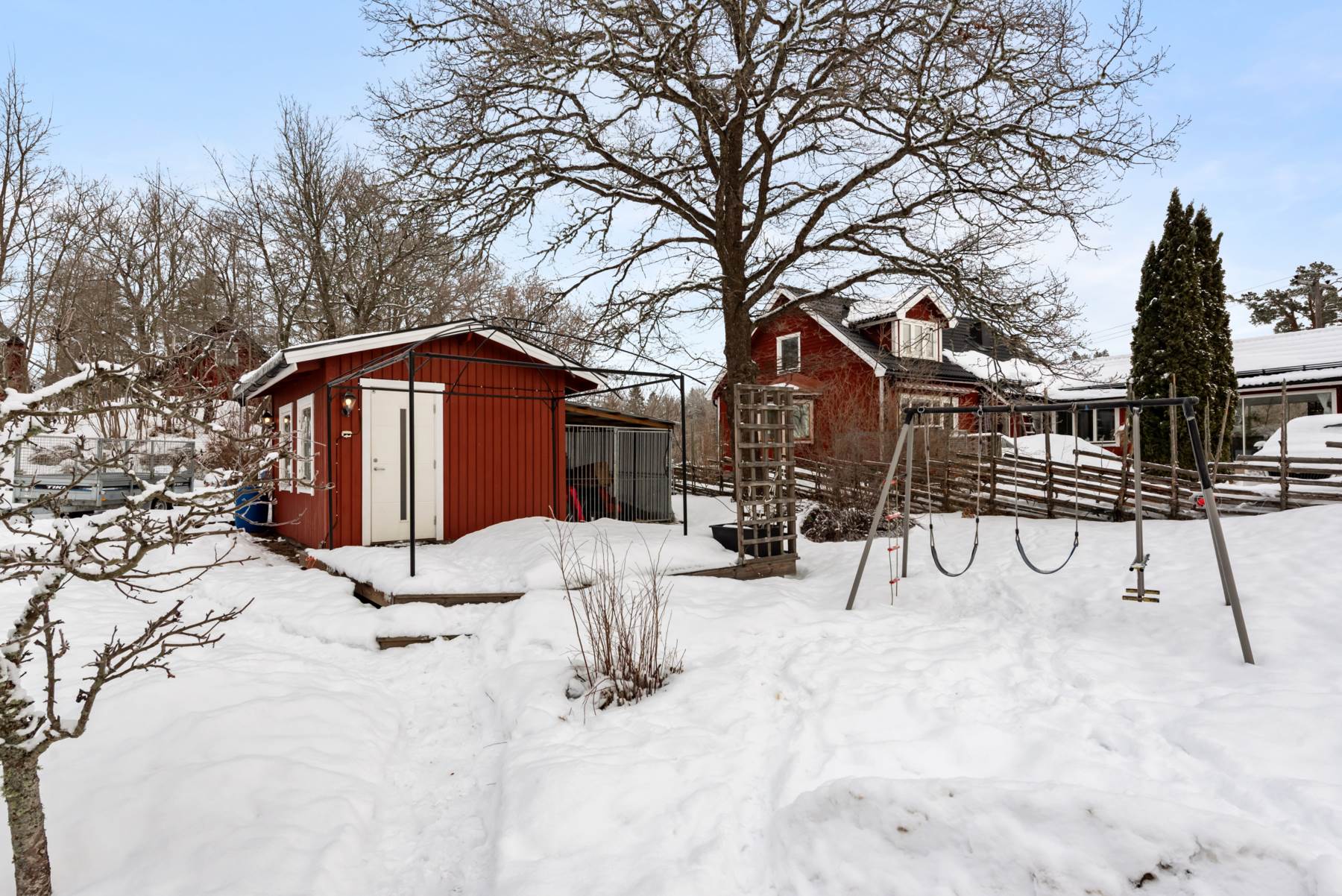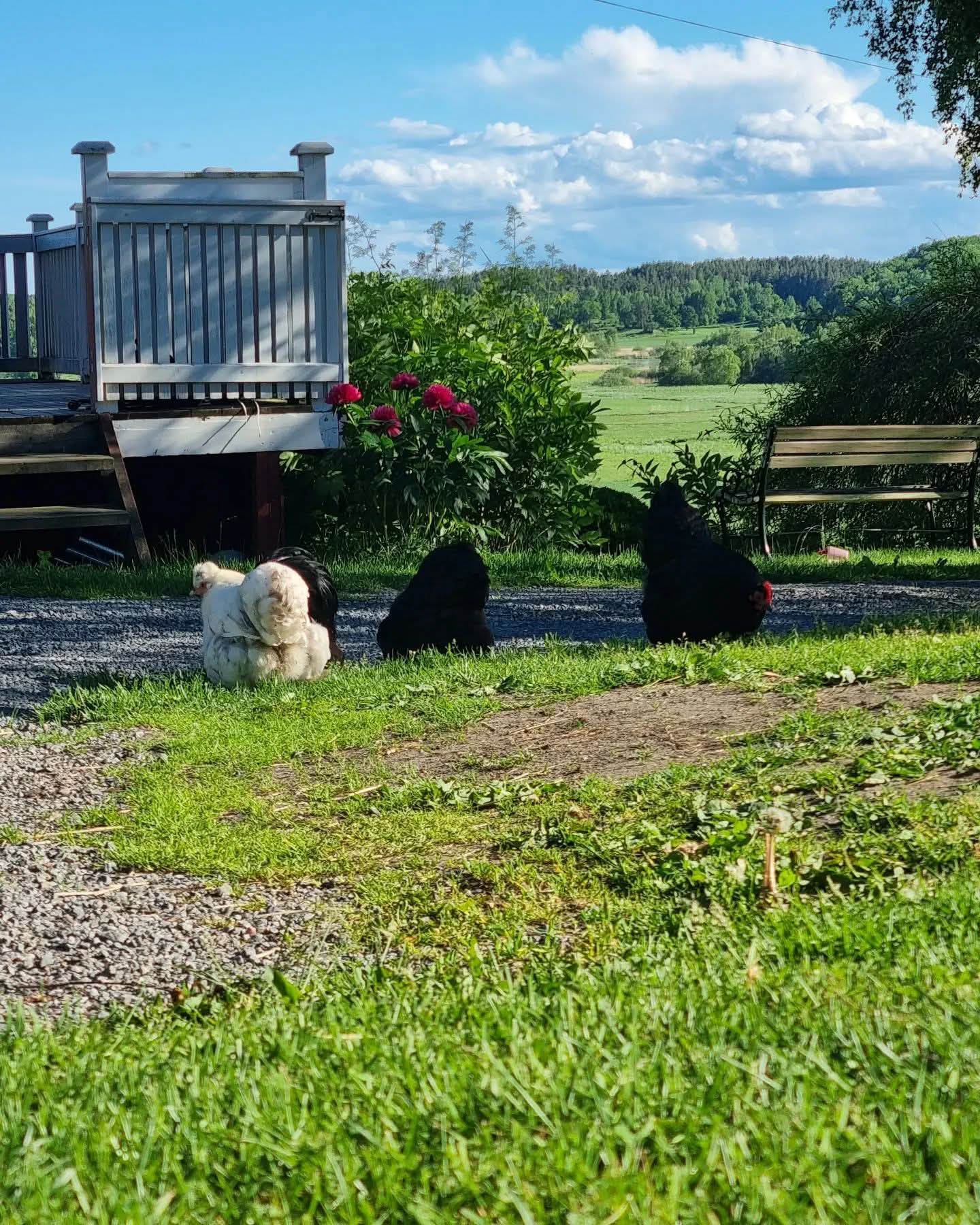 Den fina tomten är uppvuxen med knotiga äppelträd, fina planteringar, stenmurar och bra odlingsmöjligheter. Attefallshuset ligger mitt emot entrén och självklart finns ett hönshus också!