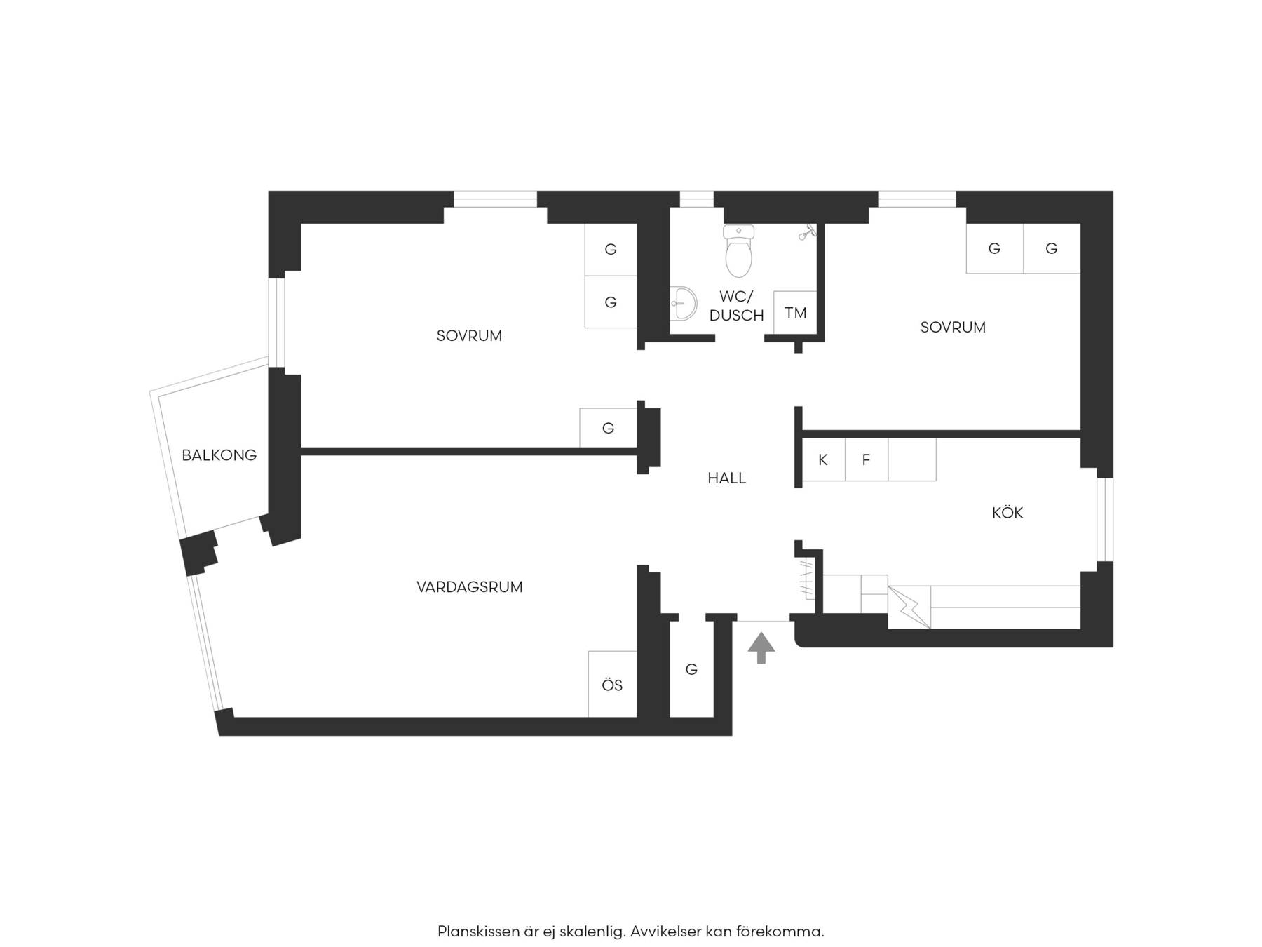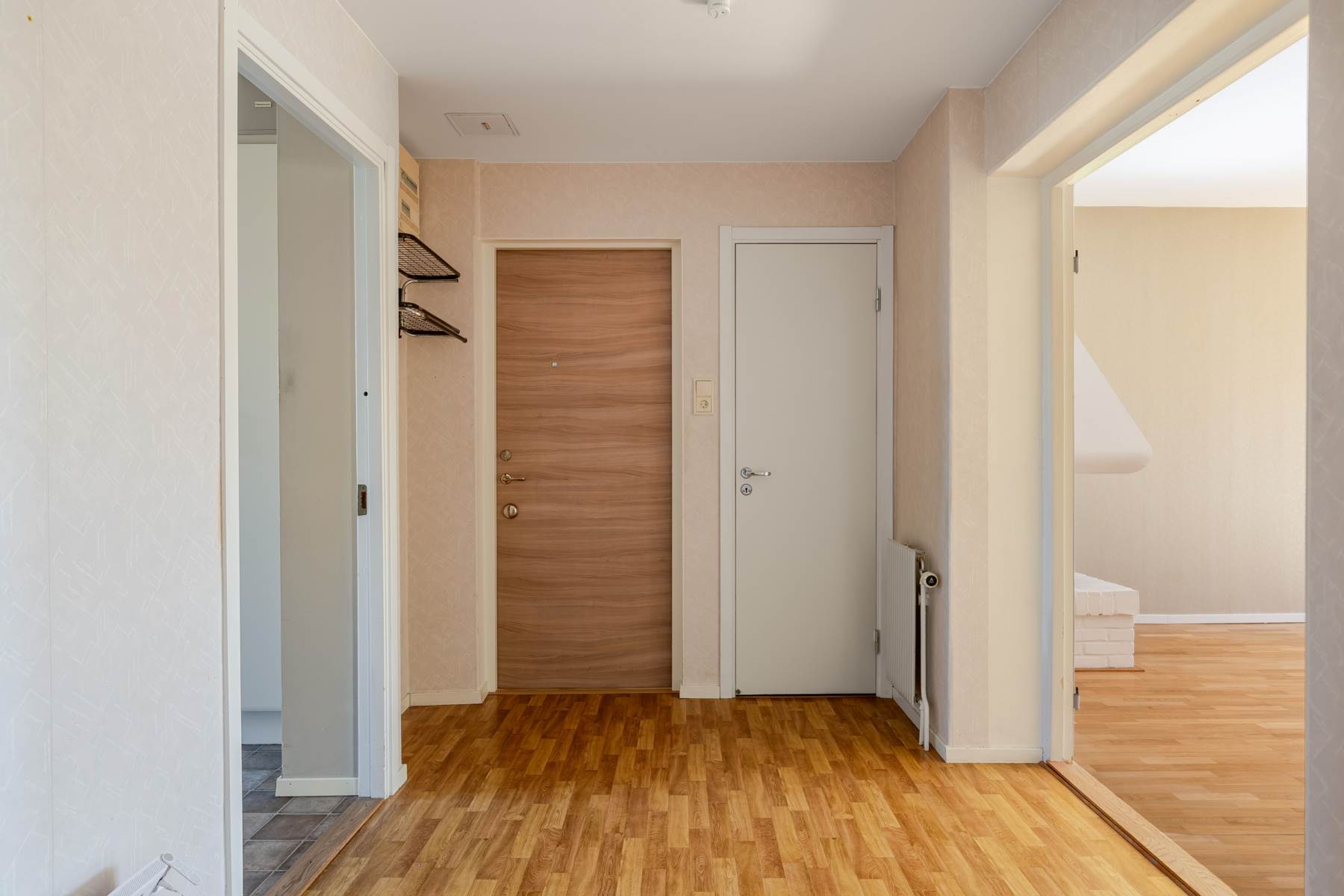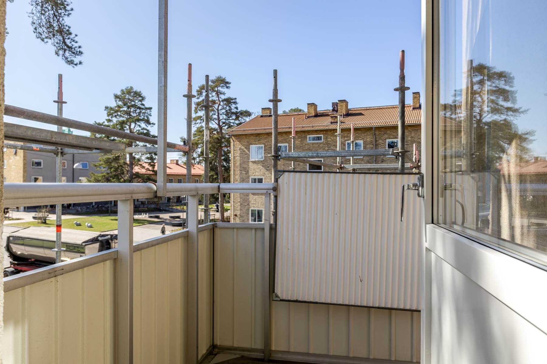 Lägenheten erbjuder ett fullutrustat kök med ljus skåpsinredning och matplats, vardagsrum braskamin med utgång ut på balkongen, två sovrum samt ett duschrum med tvättmaskin.