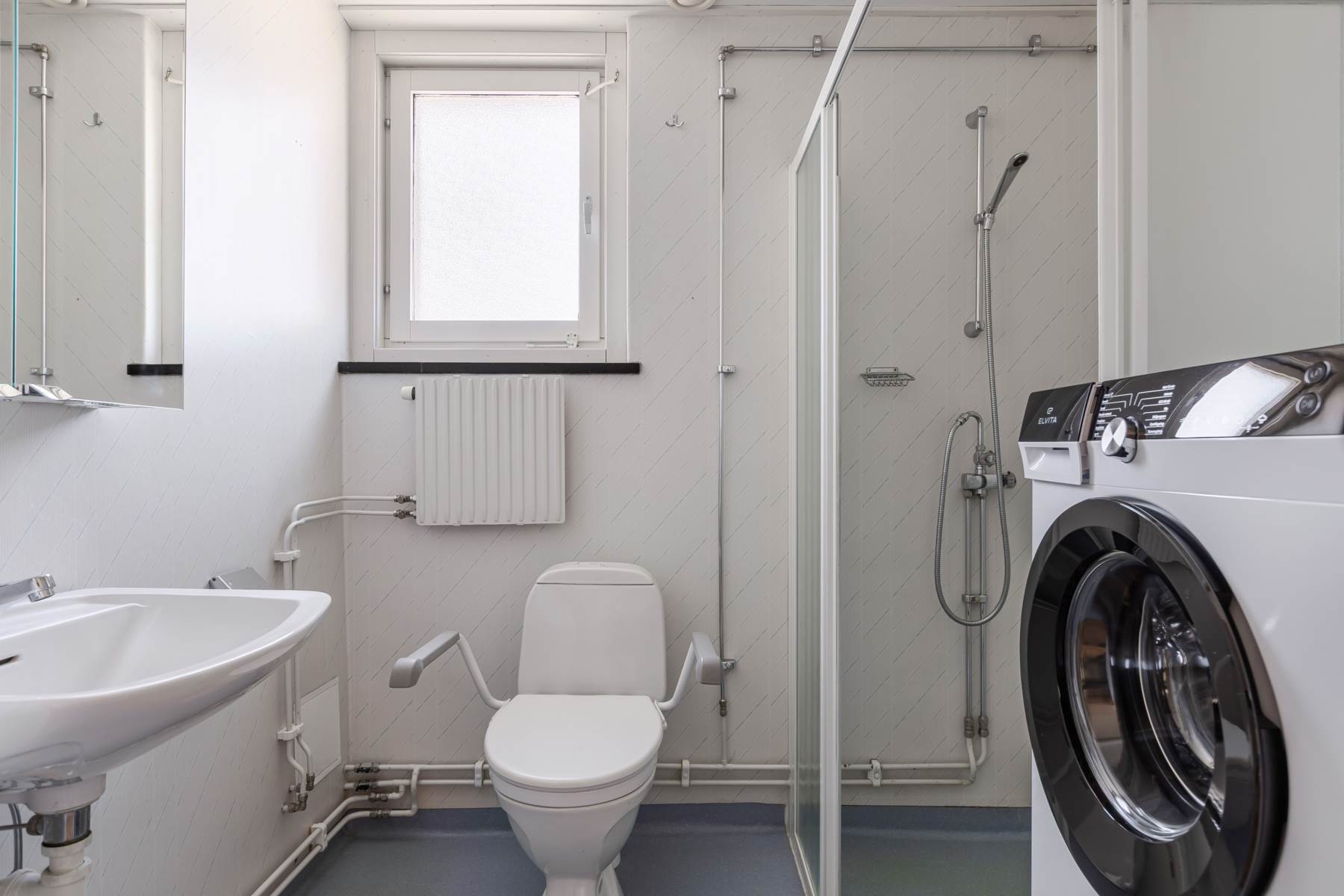 Plastmatta, våtrumstapet, duschhörna med skjutdörrar i glas, handfat, toalett och en tvättmaskin (2024)