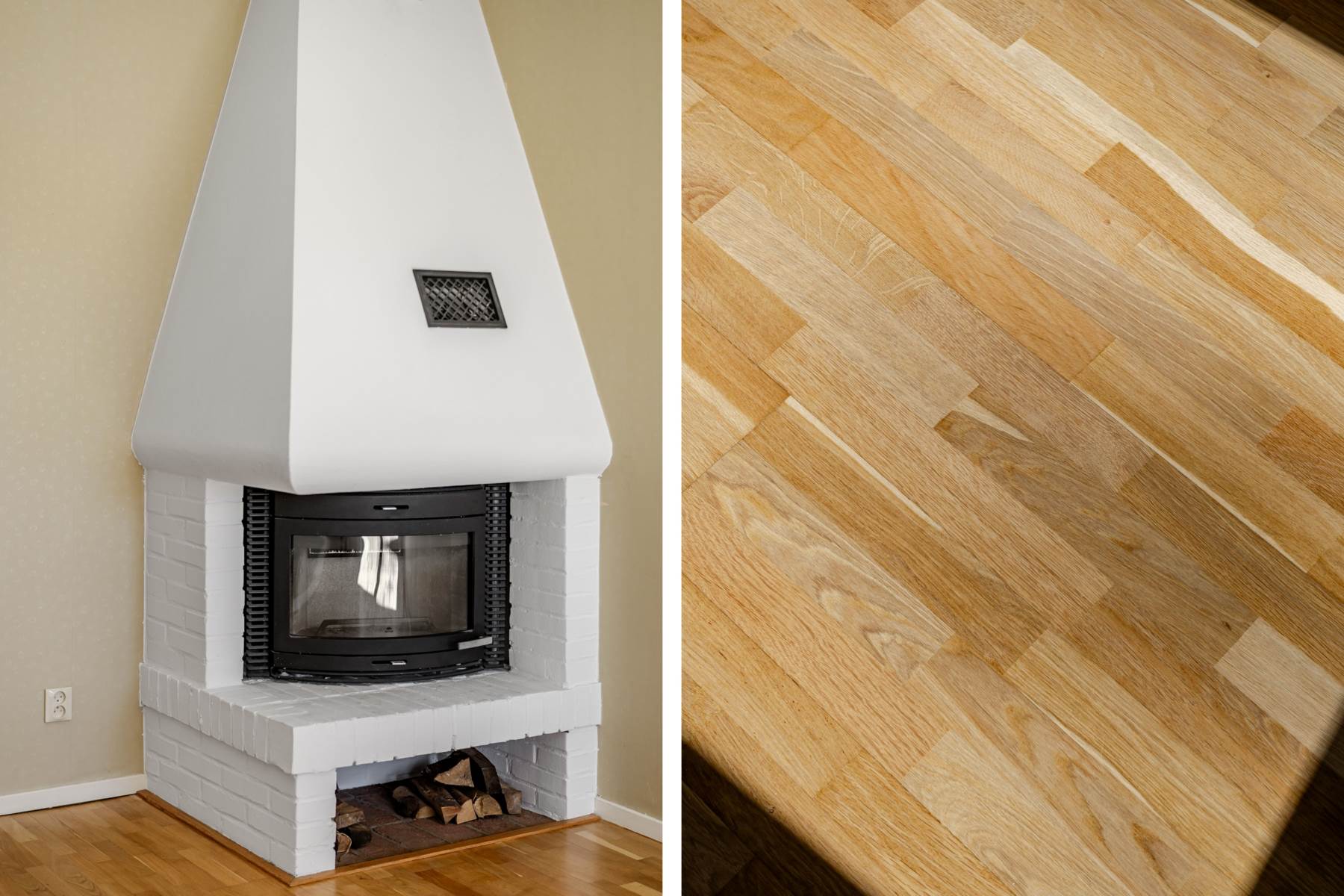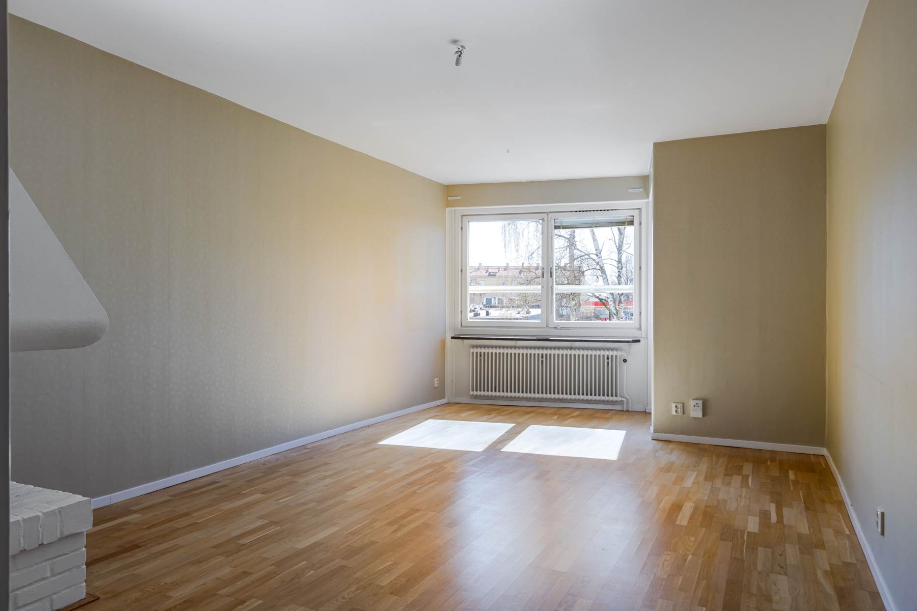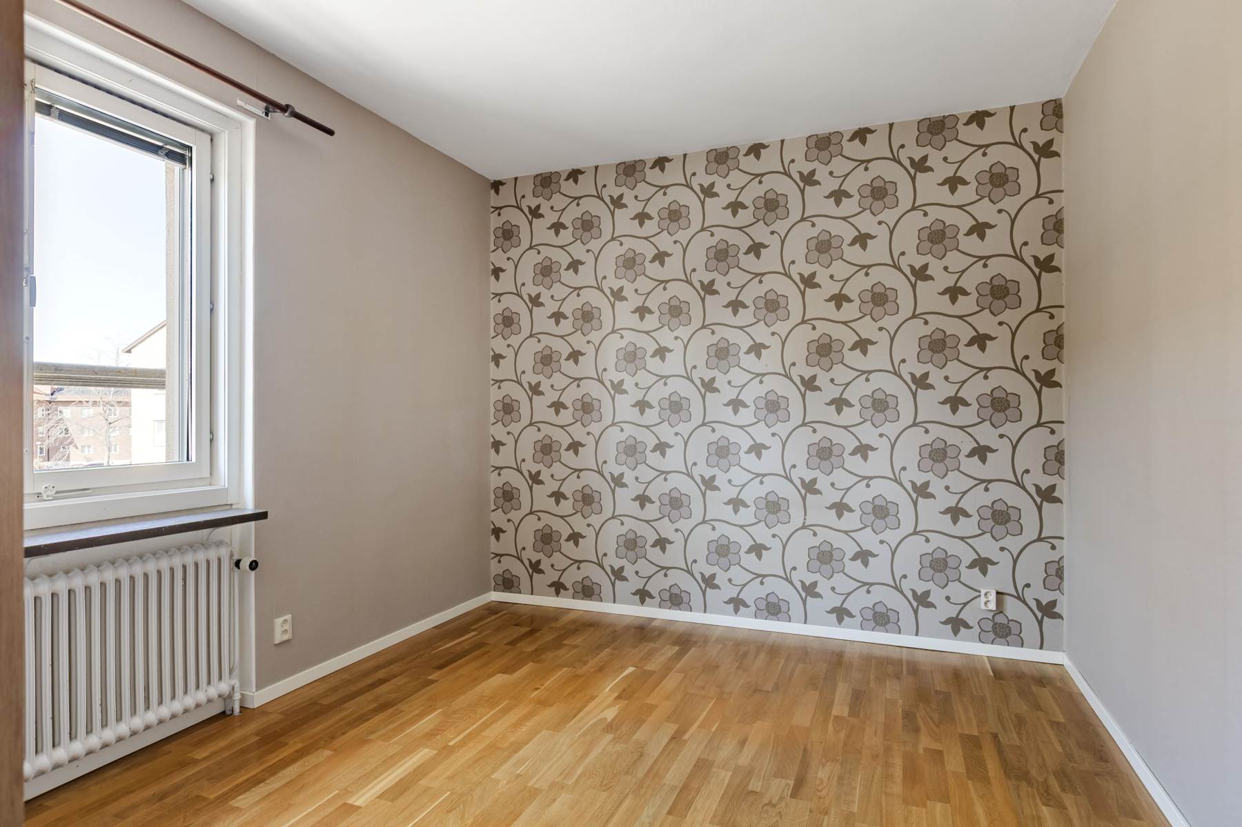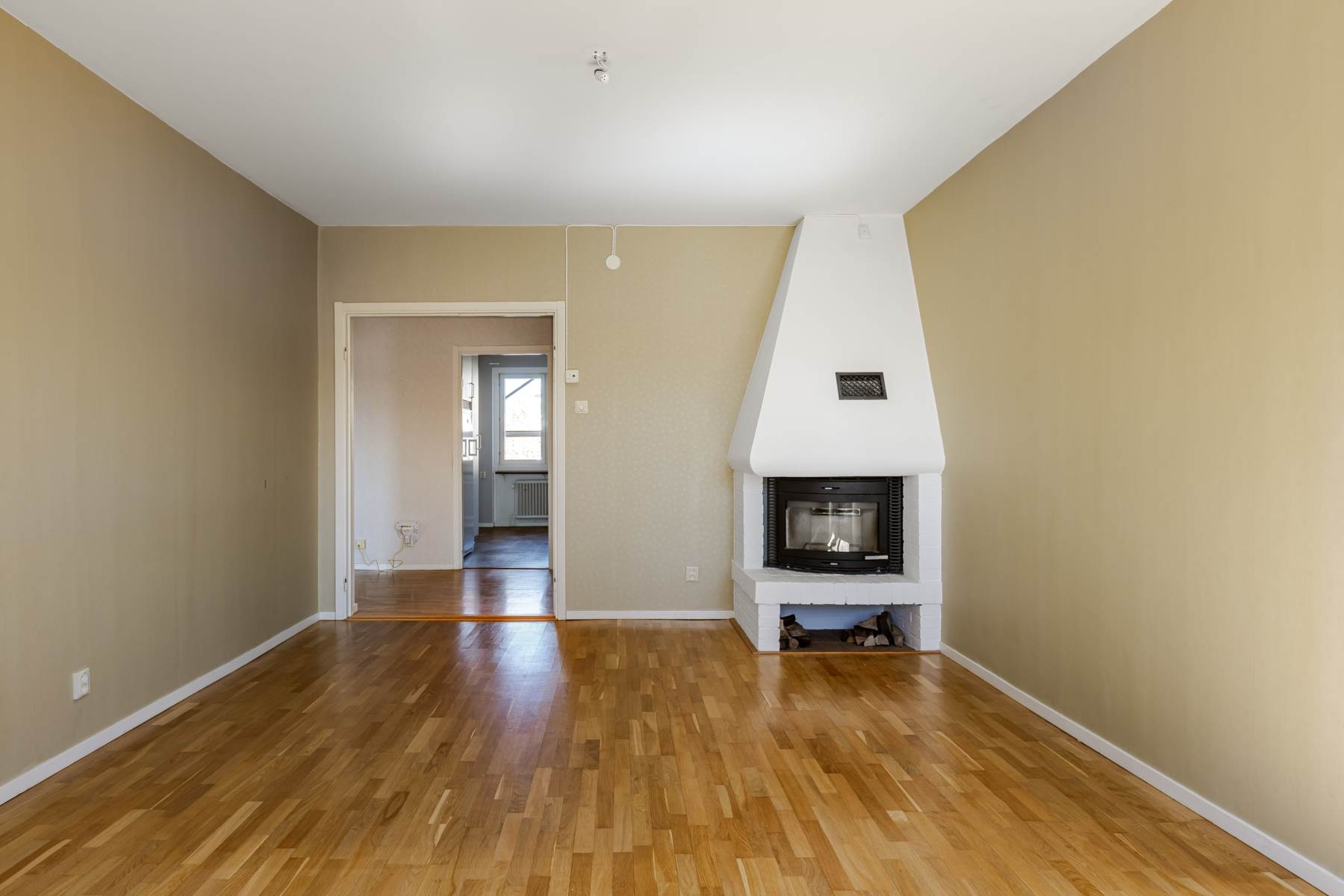 Ekparkettgolv, tapetserade väggar, fungerande braskamin (2023) och utgång till balkongen med plats för både ett litet bord och en solstol.