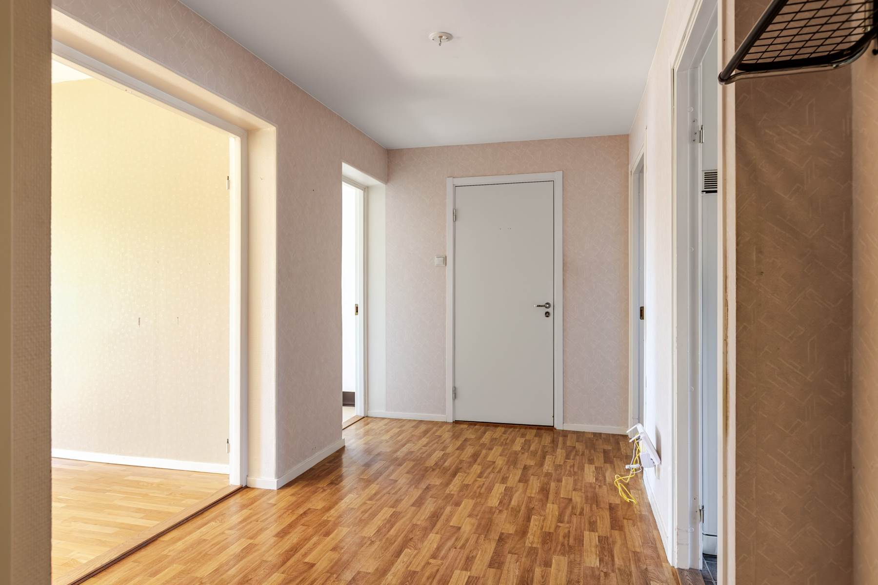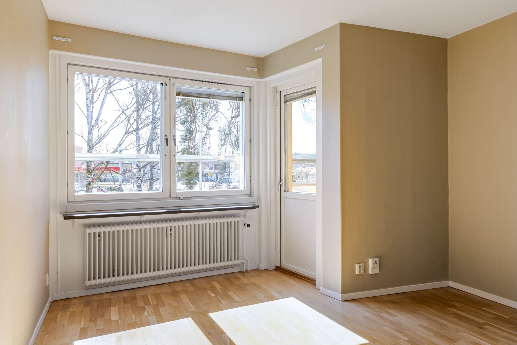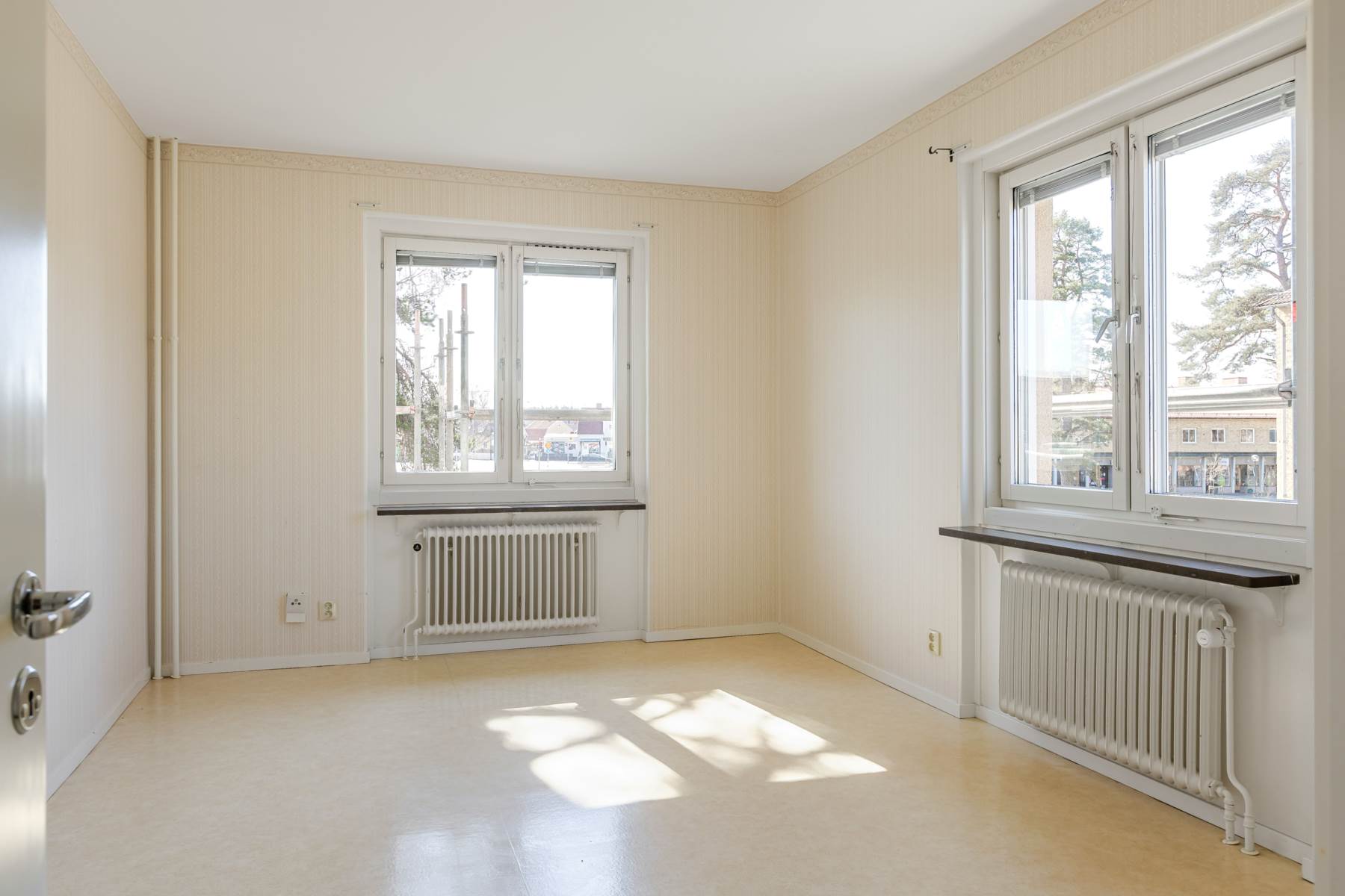 Plastmatta, tapetserade väggar, flertalet garderober och fönster i två väderstreck.
