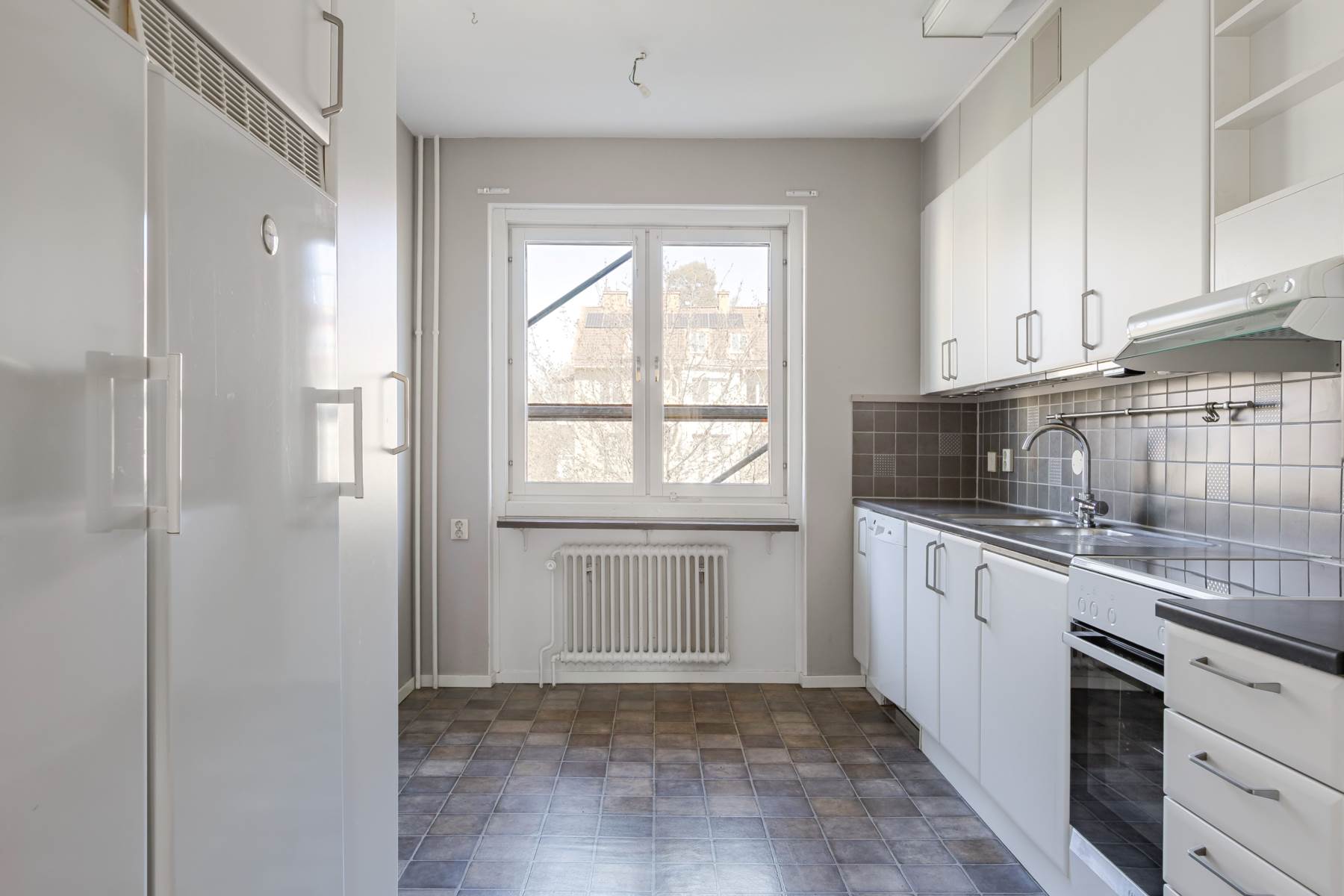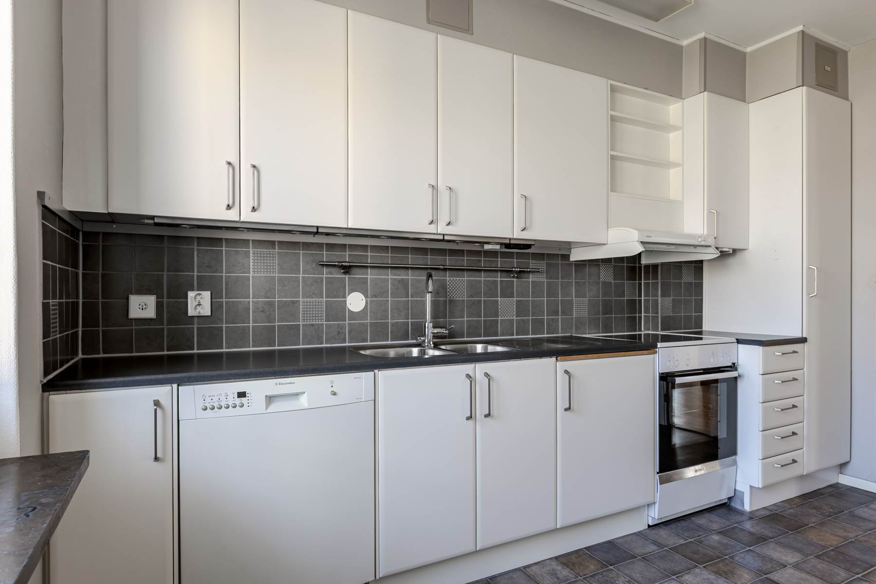 Plastmatta, tapetserade väggar, ljusa skåpsluckor och grått väggkakel. Den maskinella utrustningen består av spis och ugn (2023), fläkt, kylskåp, frysskåp och diskmaskin.