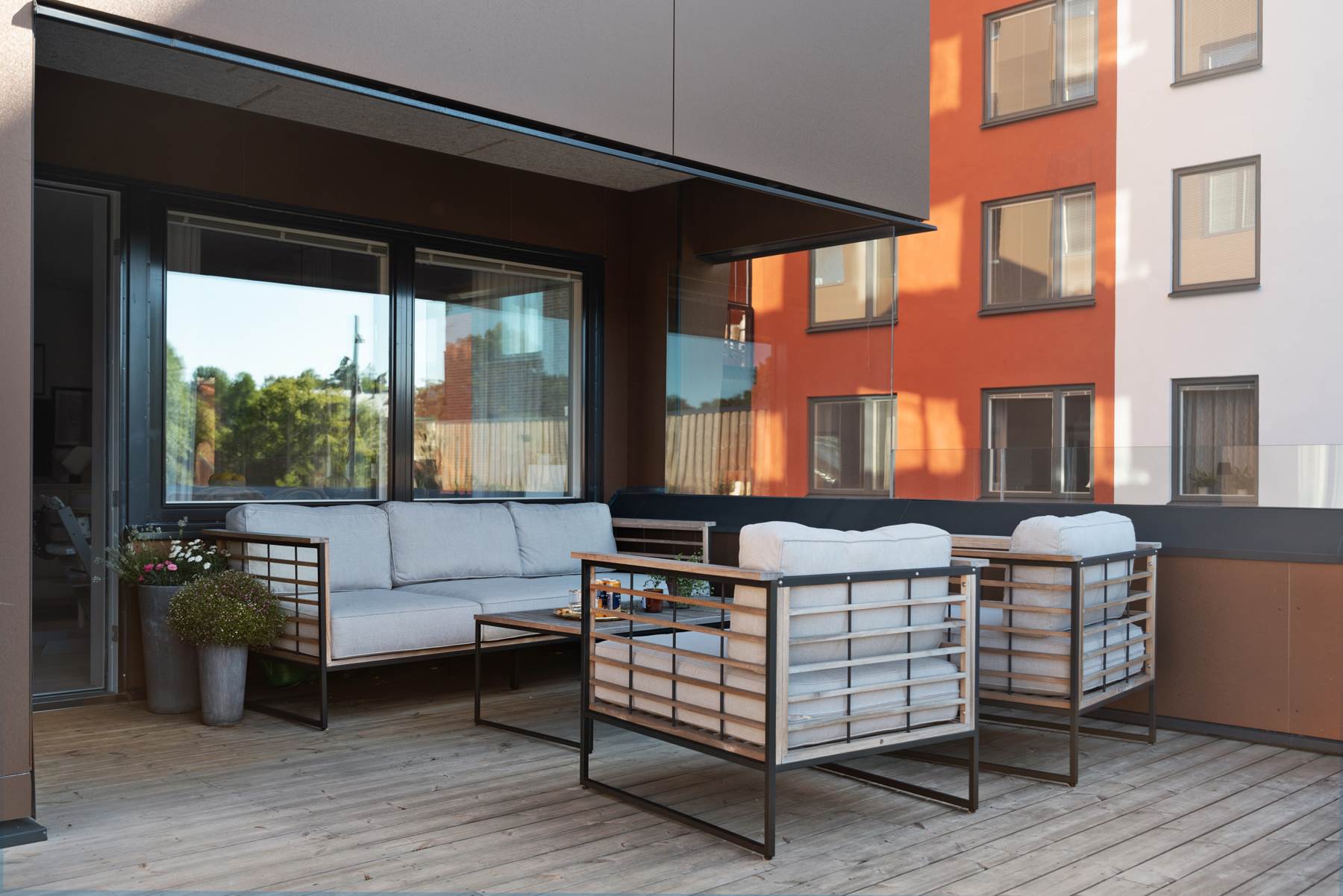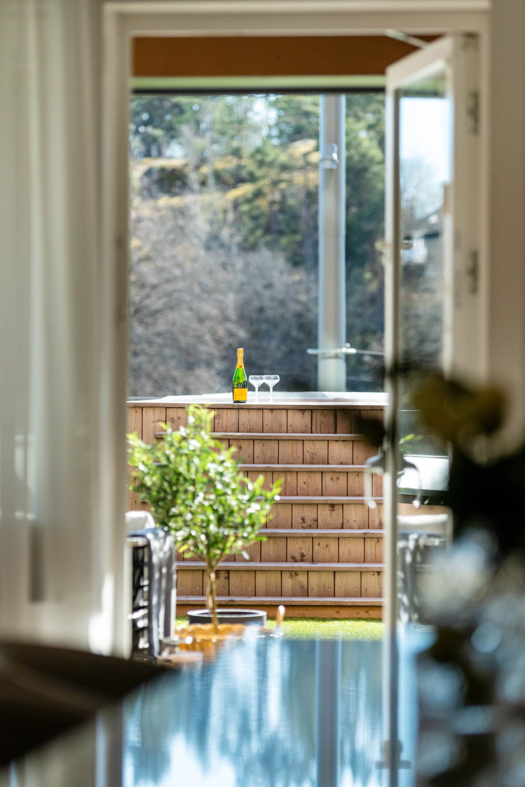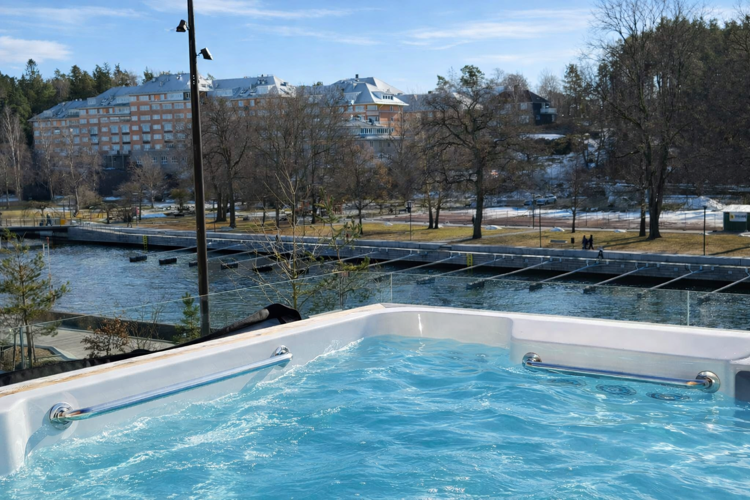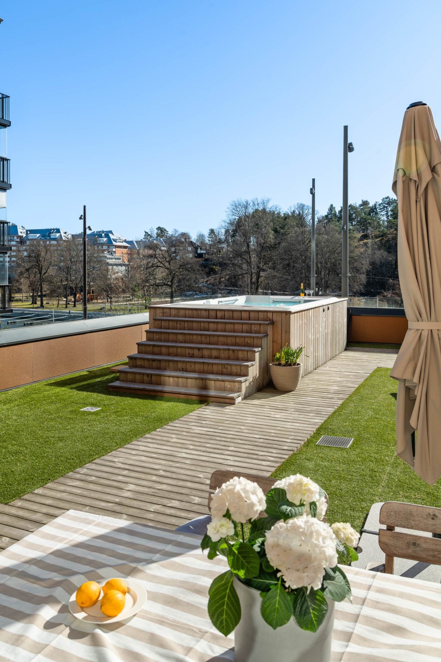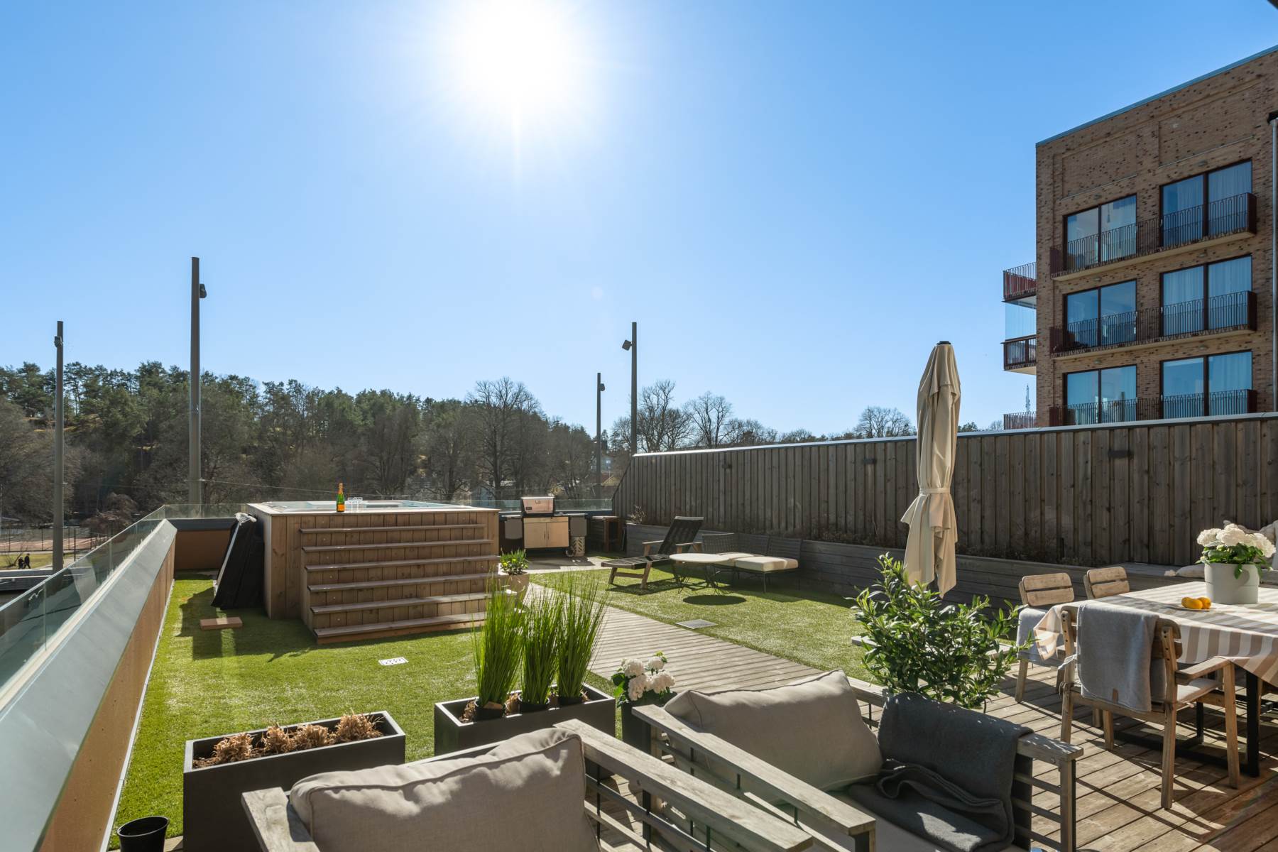 Den privata terrassen om över 100 kvm är bostadens signum, en svårslagen utomhusmiljö med sol från morgon till kväll och fri utsikt över småbåtshamn och vatten. Här samsas generösa sällskapsytor med trätrall och konstgräs som skapar en mjuk, inbjudande känsla. Det exklusiva swimspat med jetstråle är strategiskt placerat med frontläge mot kanalen, en perfekt kombination av avkoppling och träning, med en vy få kan matcha. Gott om plats för loungemöbler, matgrupp, odlingar eller lek, här skapar du enkelt flera rum i rummet.