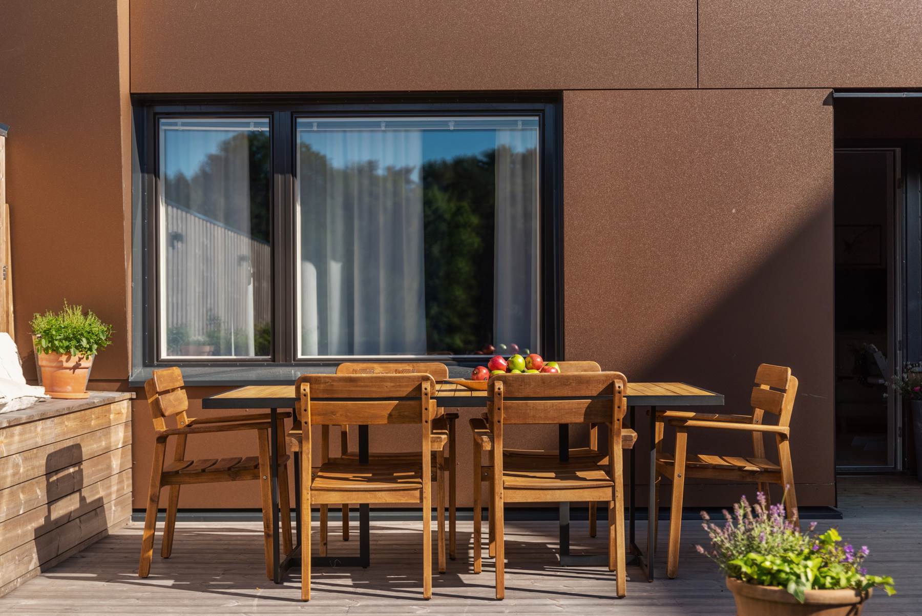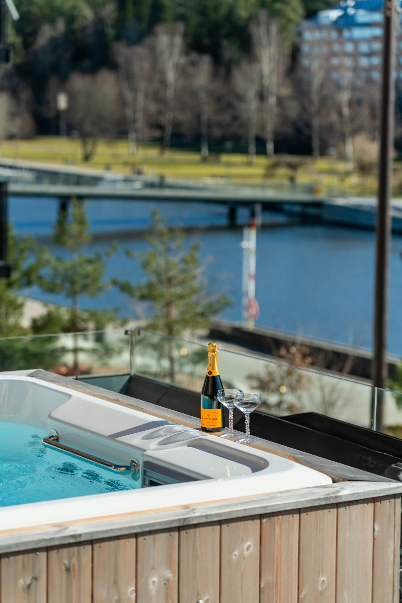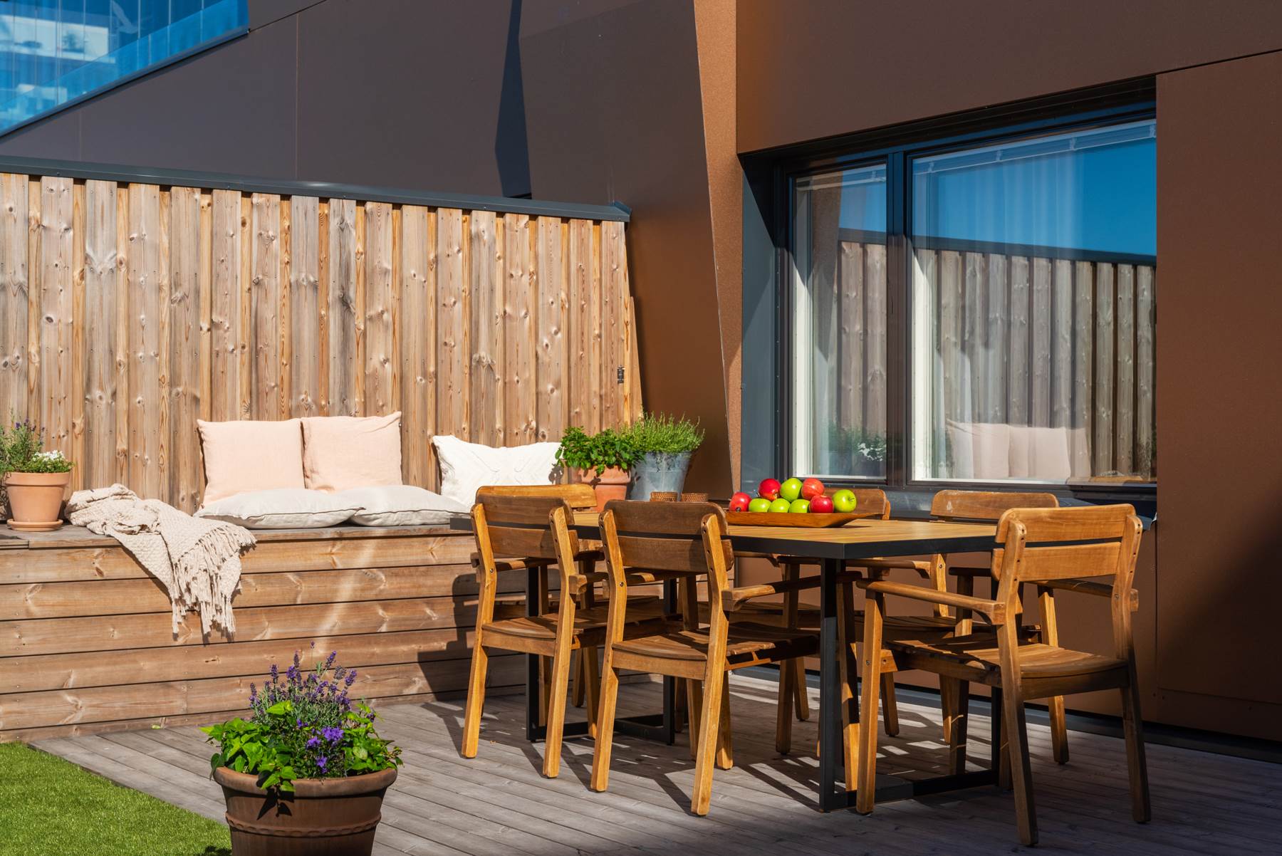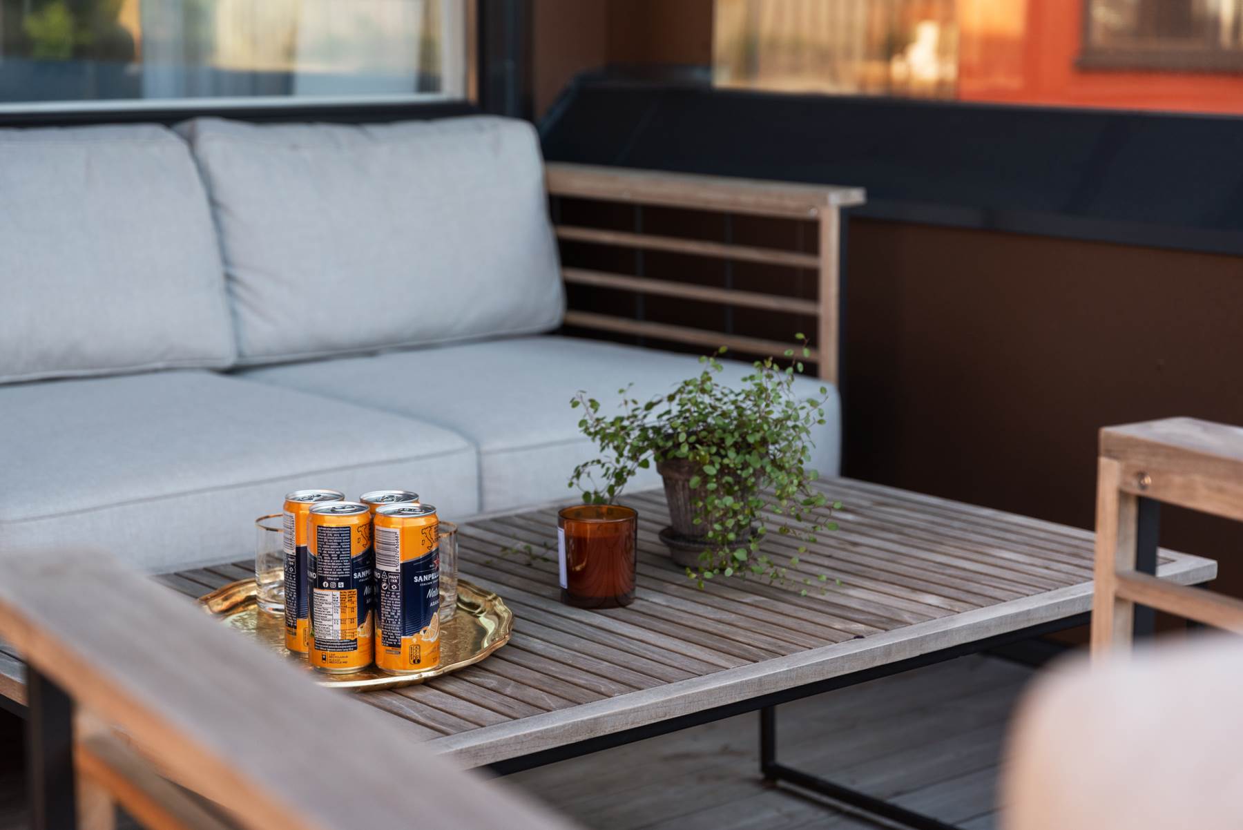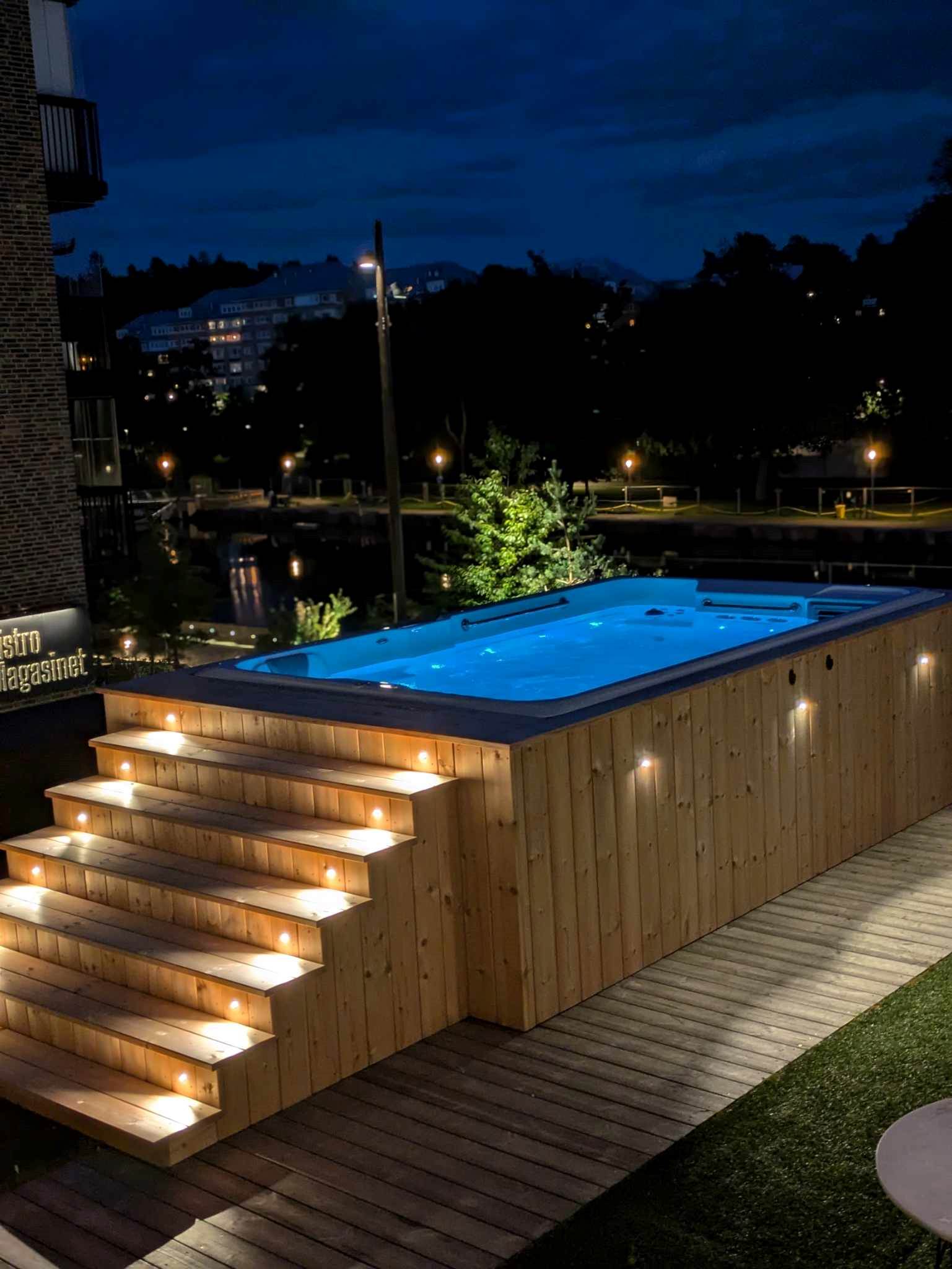 Den privata terrassen om över 100 kvm är bostadens signum, en svårslagen utomhusmiljö med sol från morgon till kväll och fri utsikt över småbåtshamn och vatten. Här samsas generösa sällskapsytor med trätrall och konstgräs som skapar en mjuk, inbjudande känsla. Det exklusiva swimspat med jetstråle är strategiskt placerat med frontläge mot kanalen, en perfekt kombination av avkoppling och träning, med en vy få kan matcha. Gott om plats för loungemöbler, matgrupp, odlingar eller lek, här skapar du enkelt flera rum i rummet.