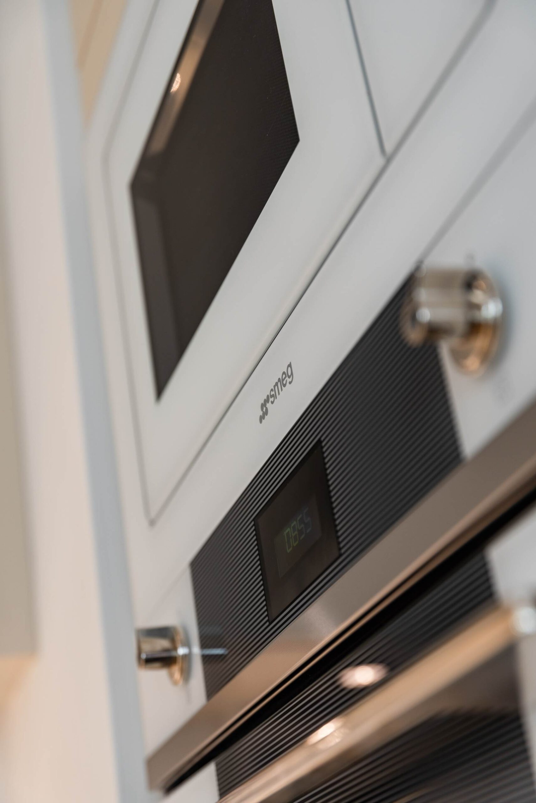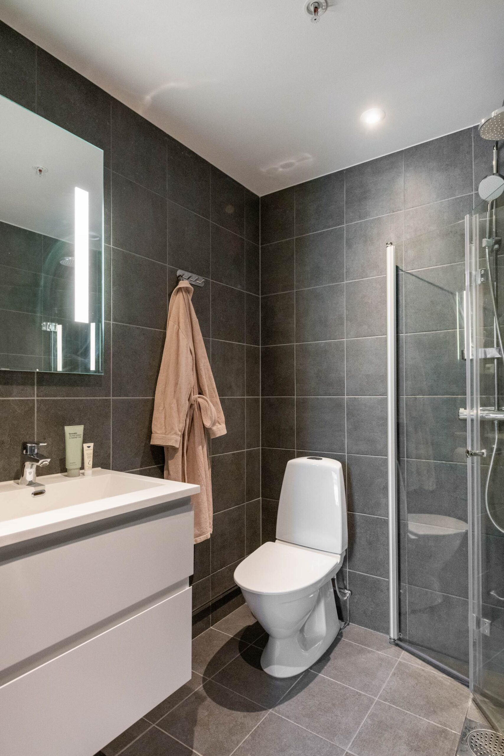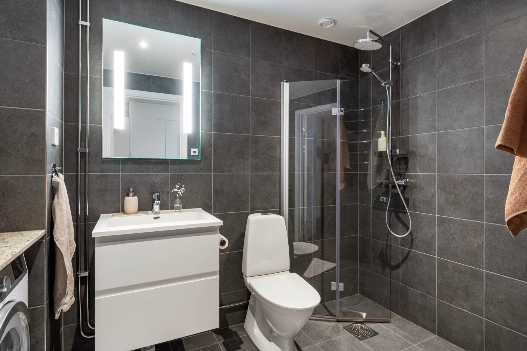 Det andra badrummet är smakfullt inrett med dusch, WC och kommod samt tvättmaskin och torktumlare från SMEG, en kombination av design och kvalitet.