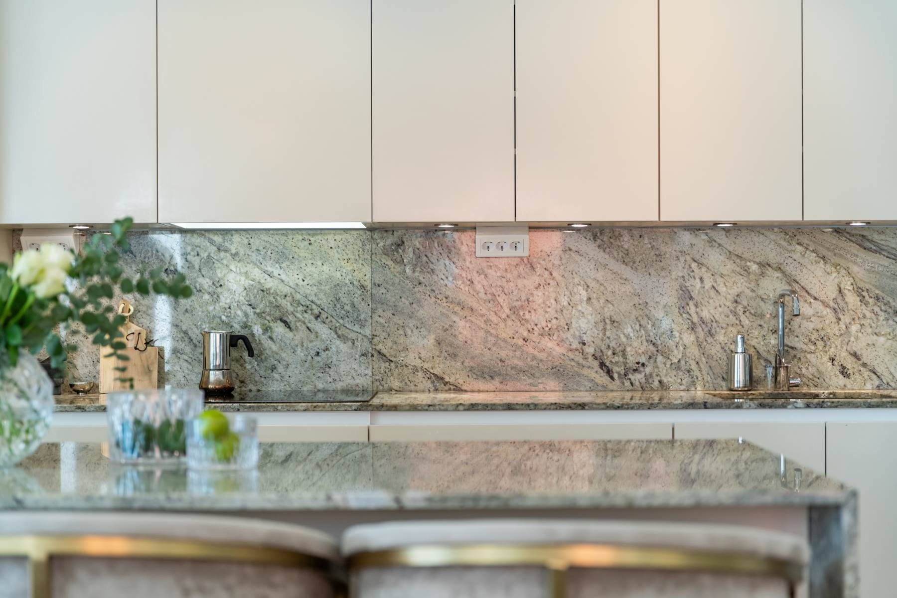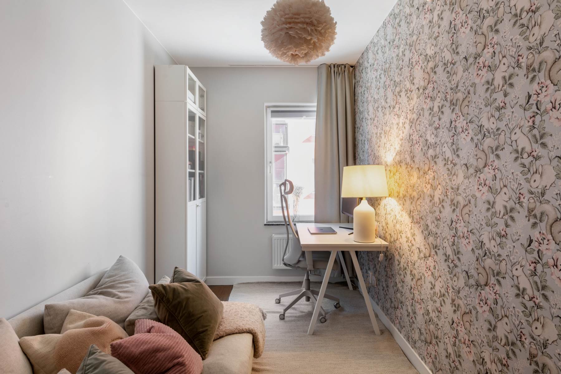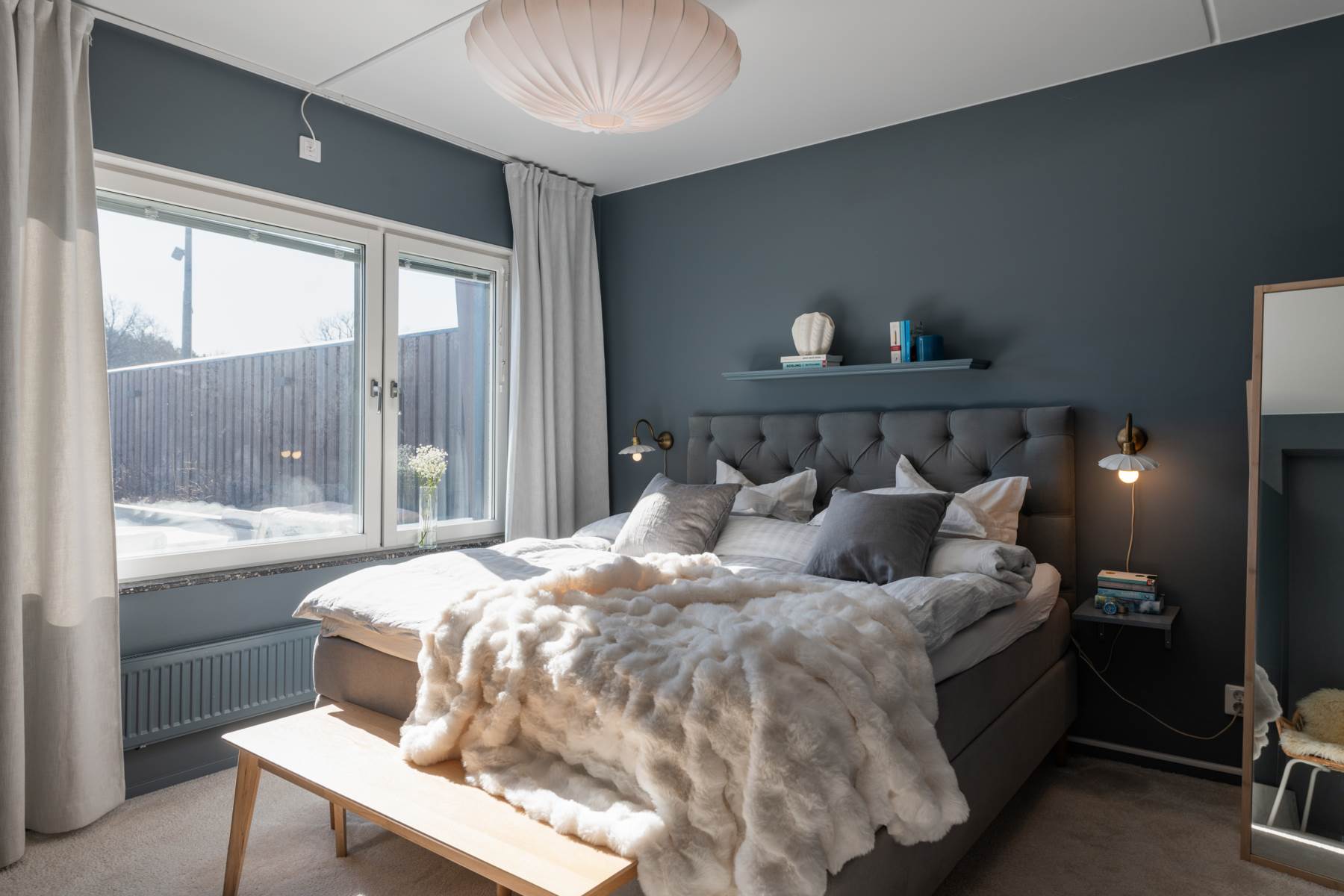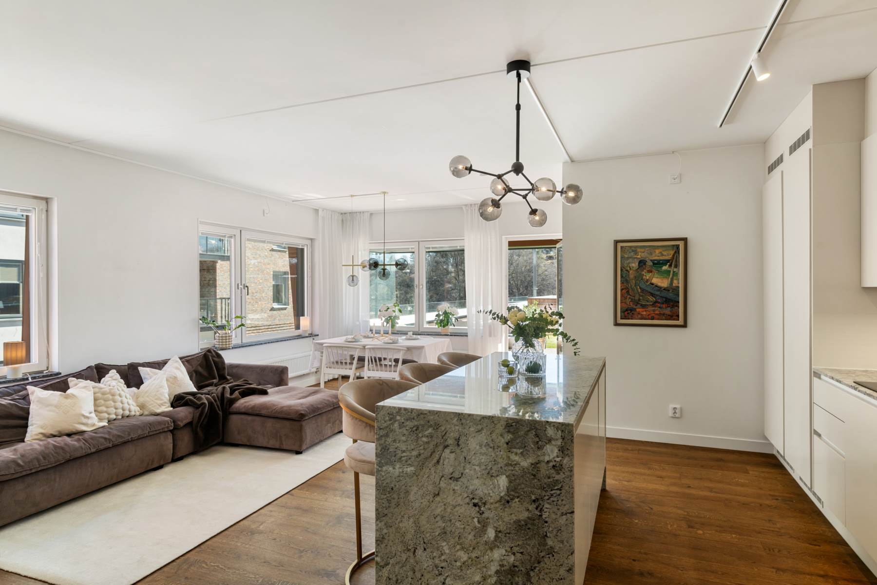 Invändigt löper ett vackert valnötsfärgat trägolv enhetligt genom hela bostaden och skapar en varm, exklusiv helhet. Köket har uppgraderats med nya stenskivor och erbjuder generösa arbetsytor samt en centralt placerad köksö som bjuder in till sociala tillställningar. Här förenas funktion och estetik, en naturlig samlingspunkt för både vardag och fest.