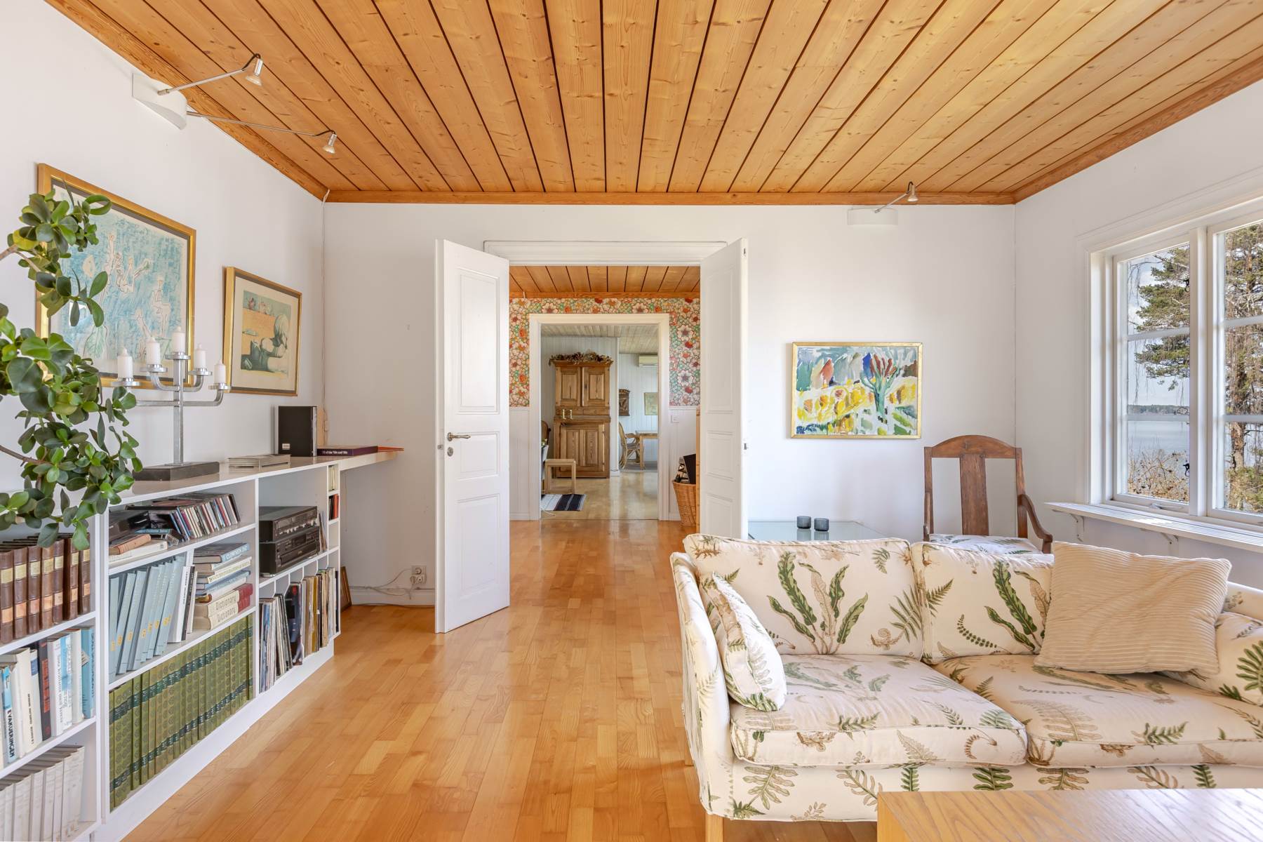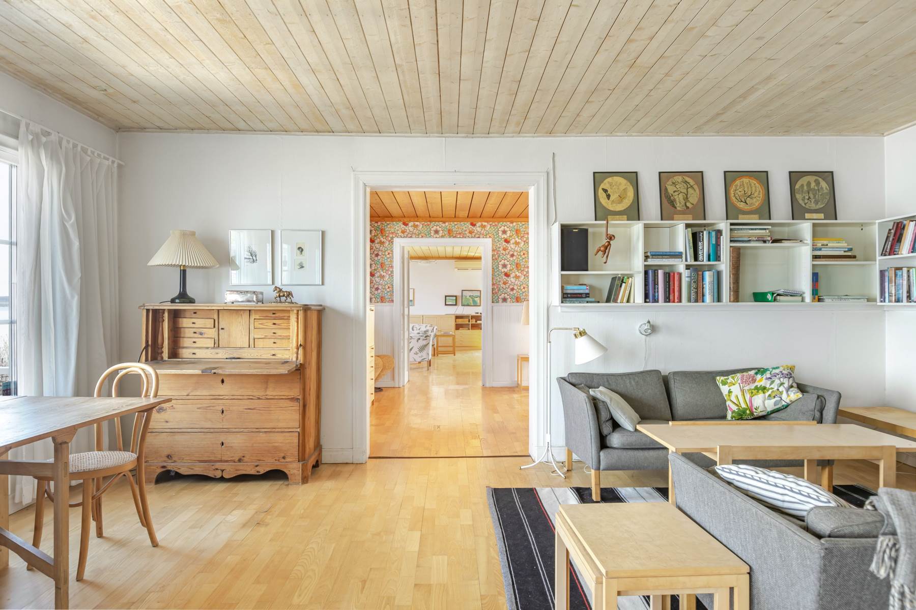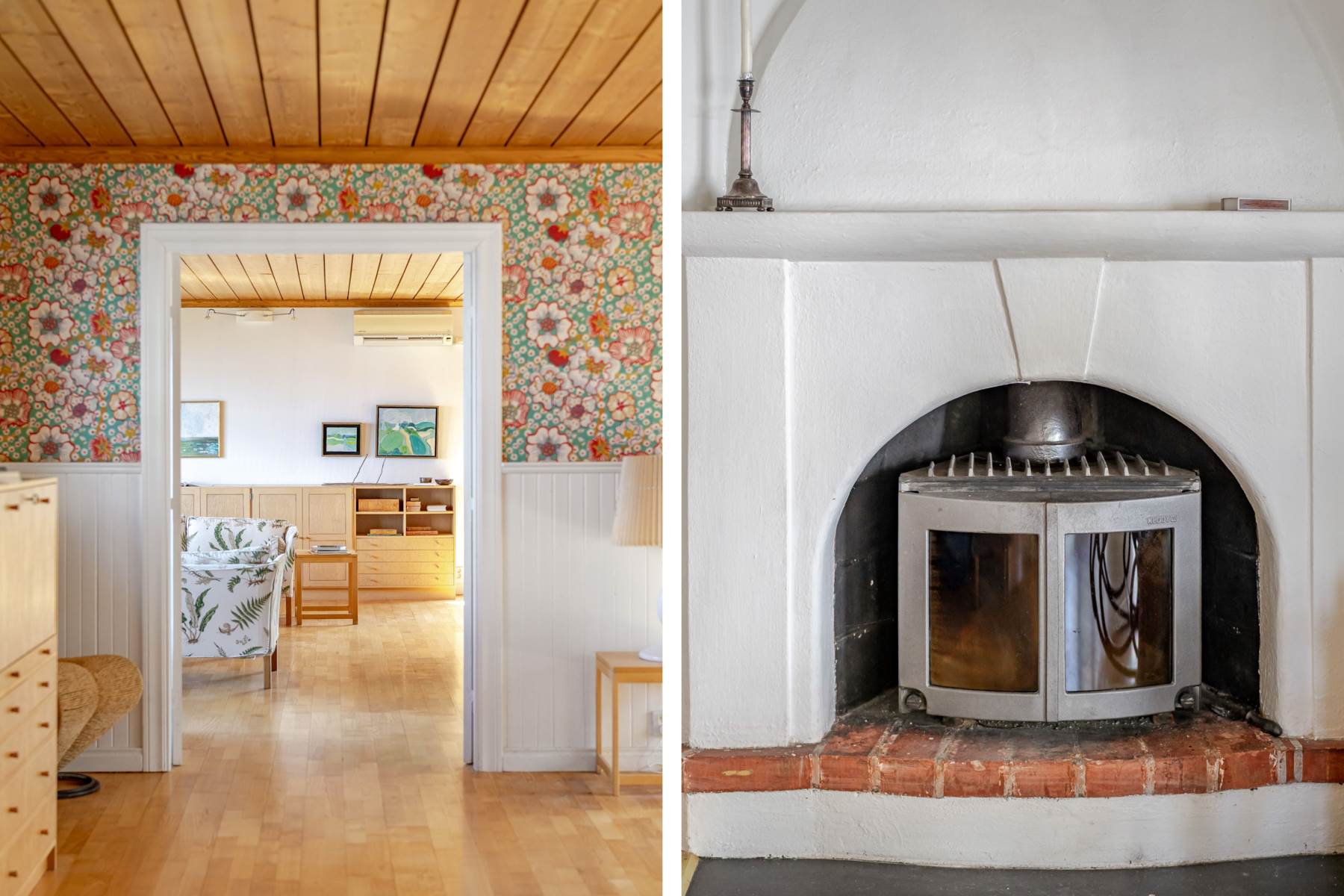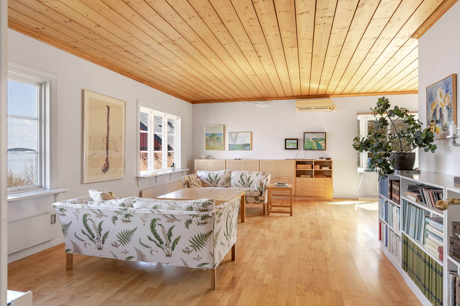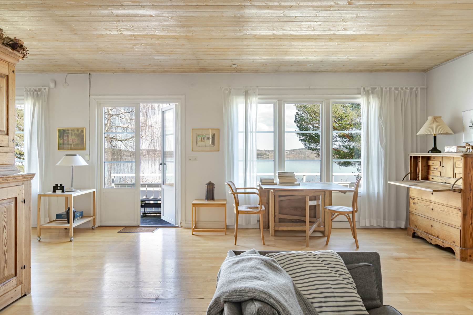 Parkettgolv, målade väggar, braskamin och utgång till uteplatsen mot sjön.