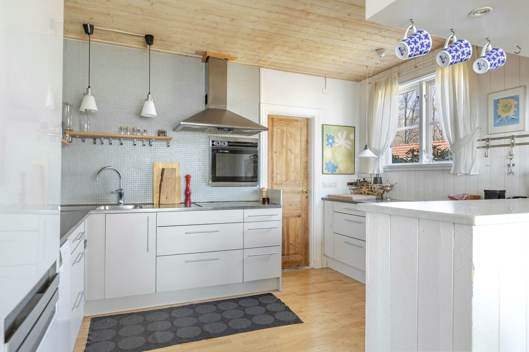 Parkettgolv, väggmosaik, väggpanel och ljus modern köksinredning. Den maskinella utrustningen består av spishäll, fläktkåpa, inbyggd varmluftsugn, kombinerad kyl-och frys och diskmaskin.