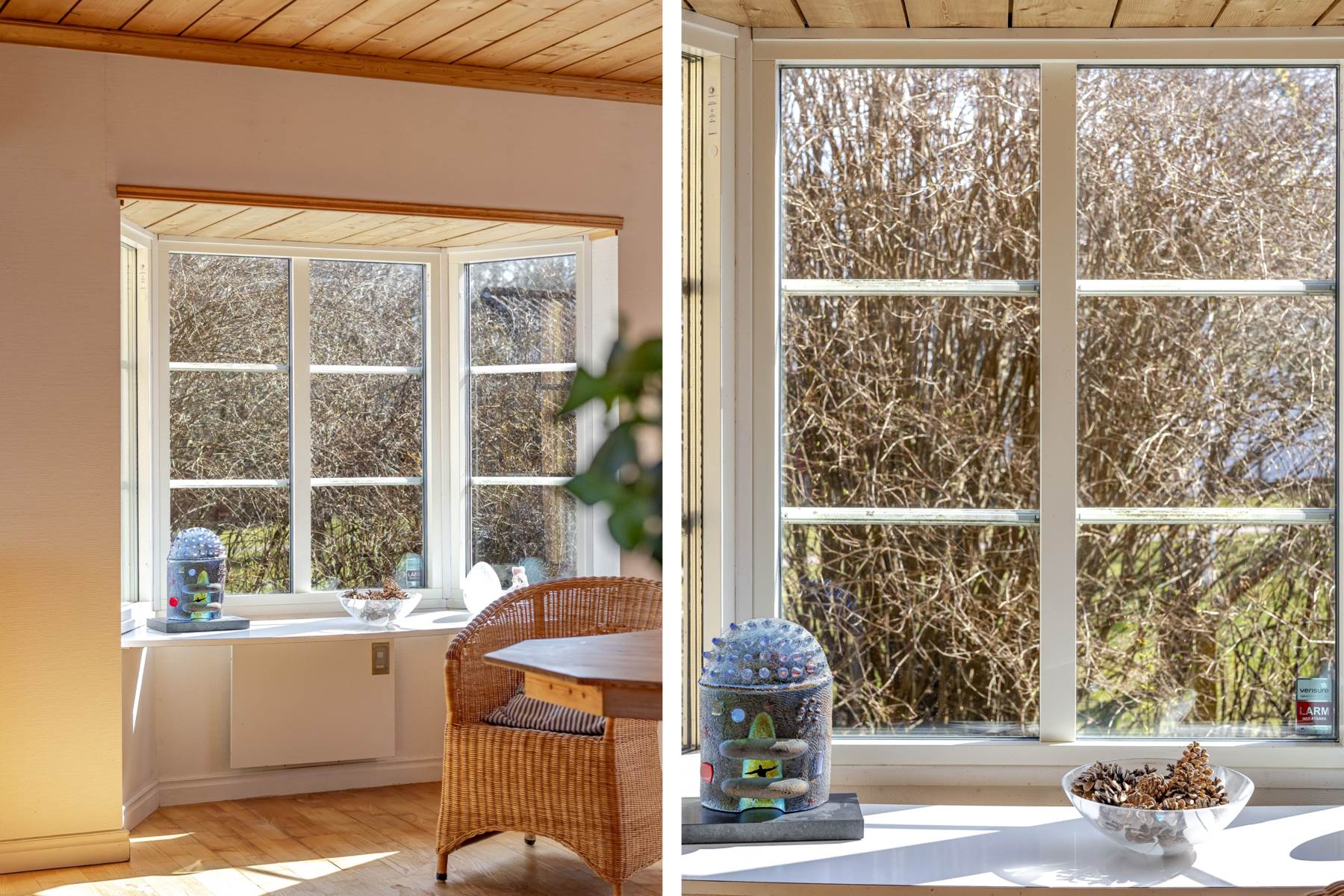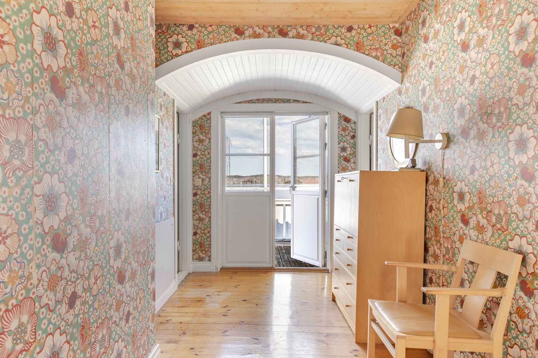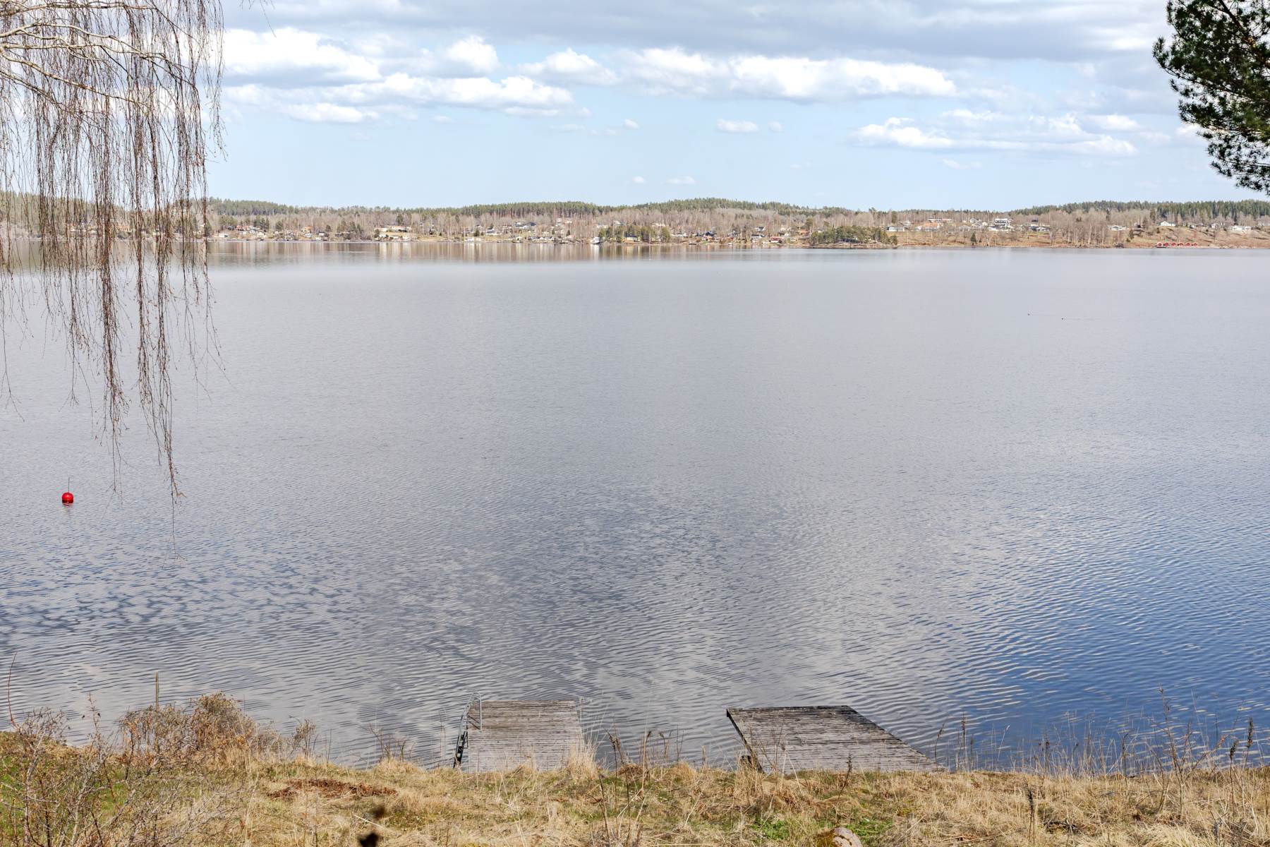 Parkettgolv, målade väggar och vacker utsikt över sjön.