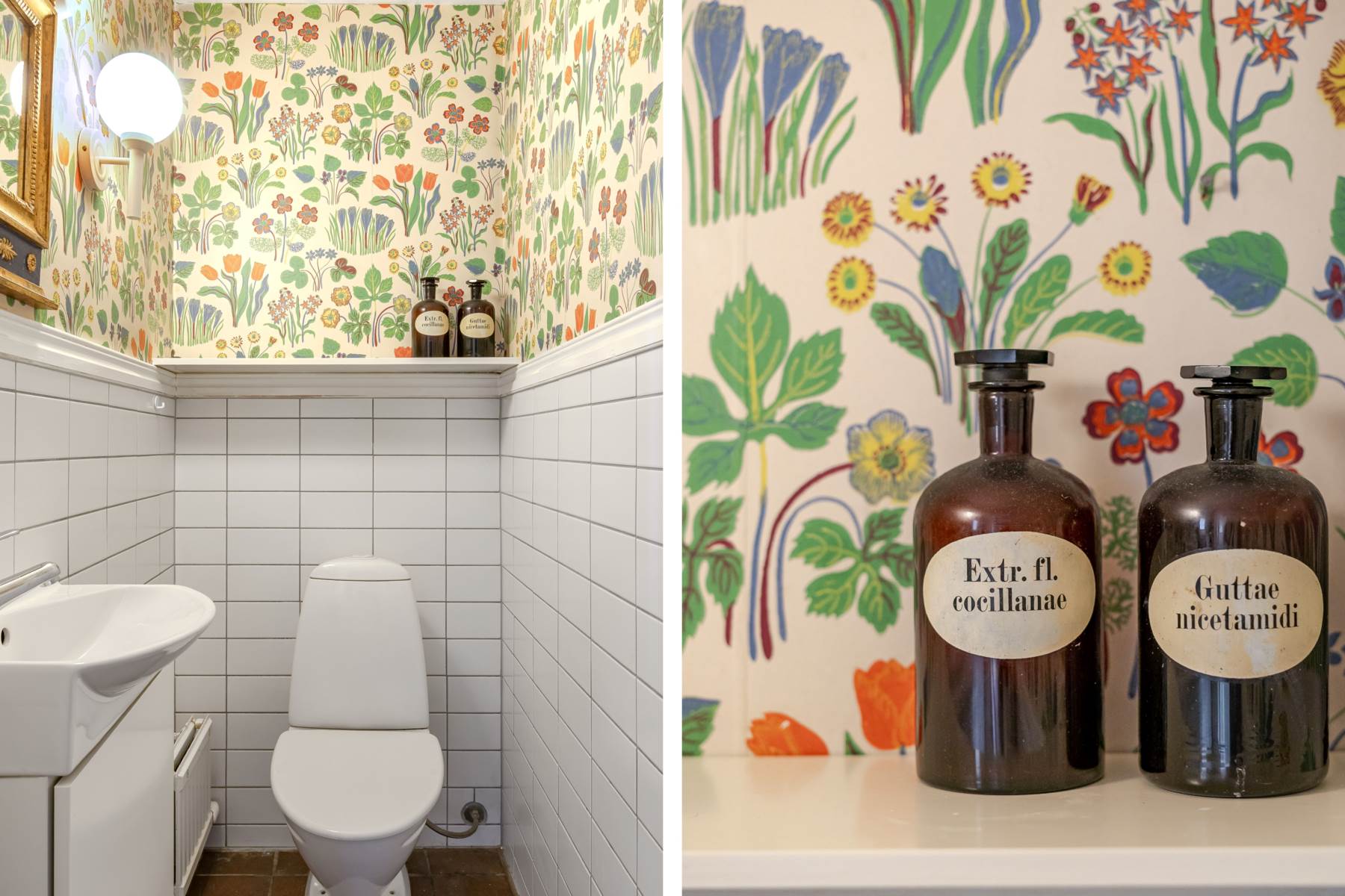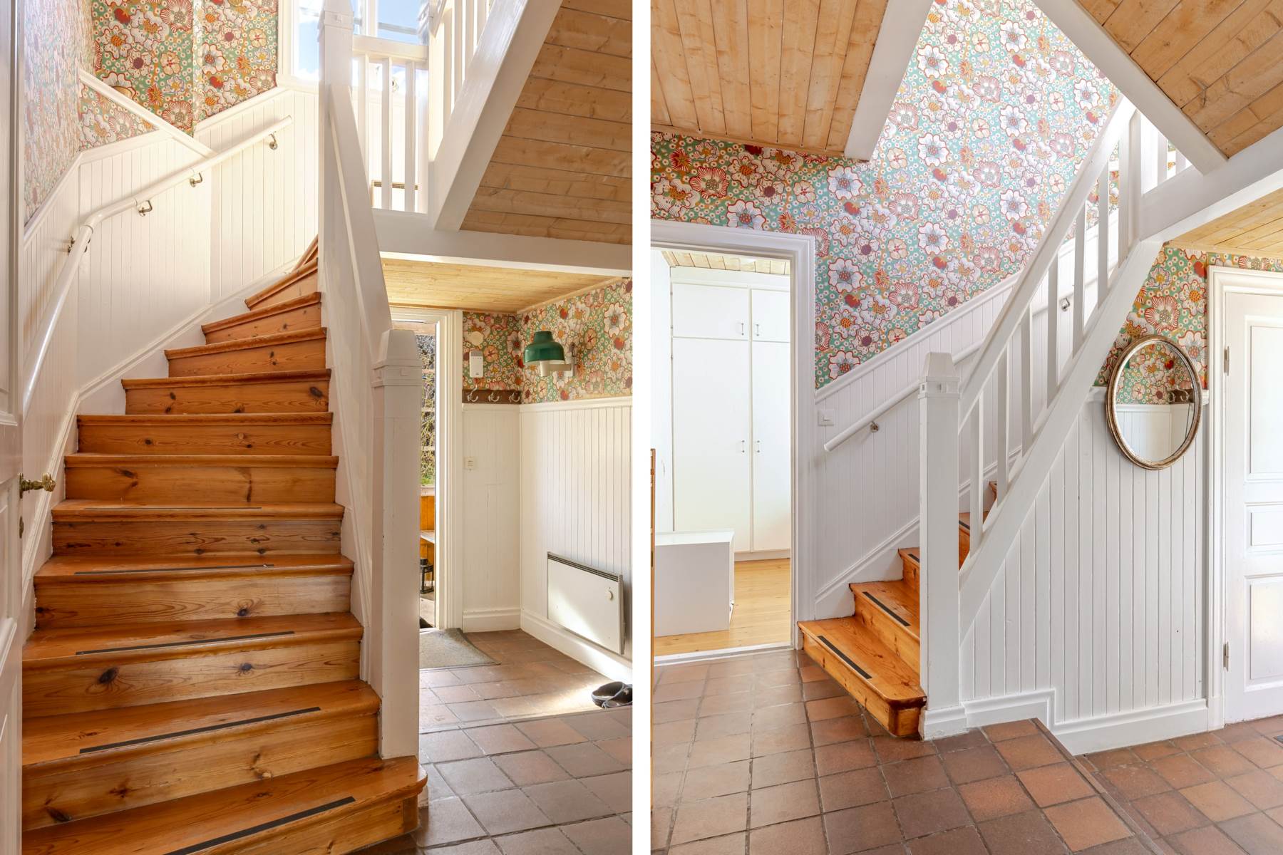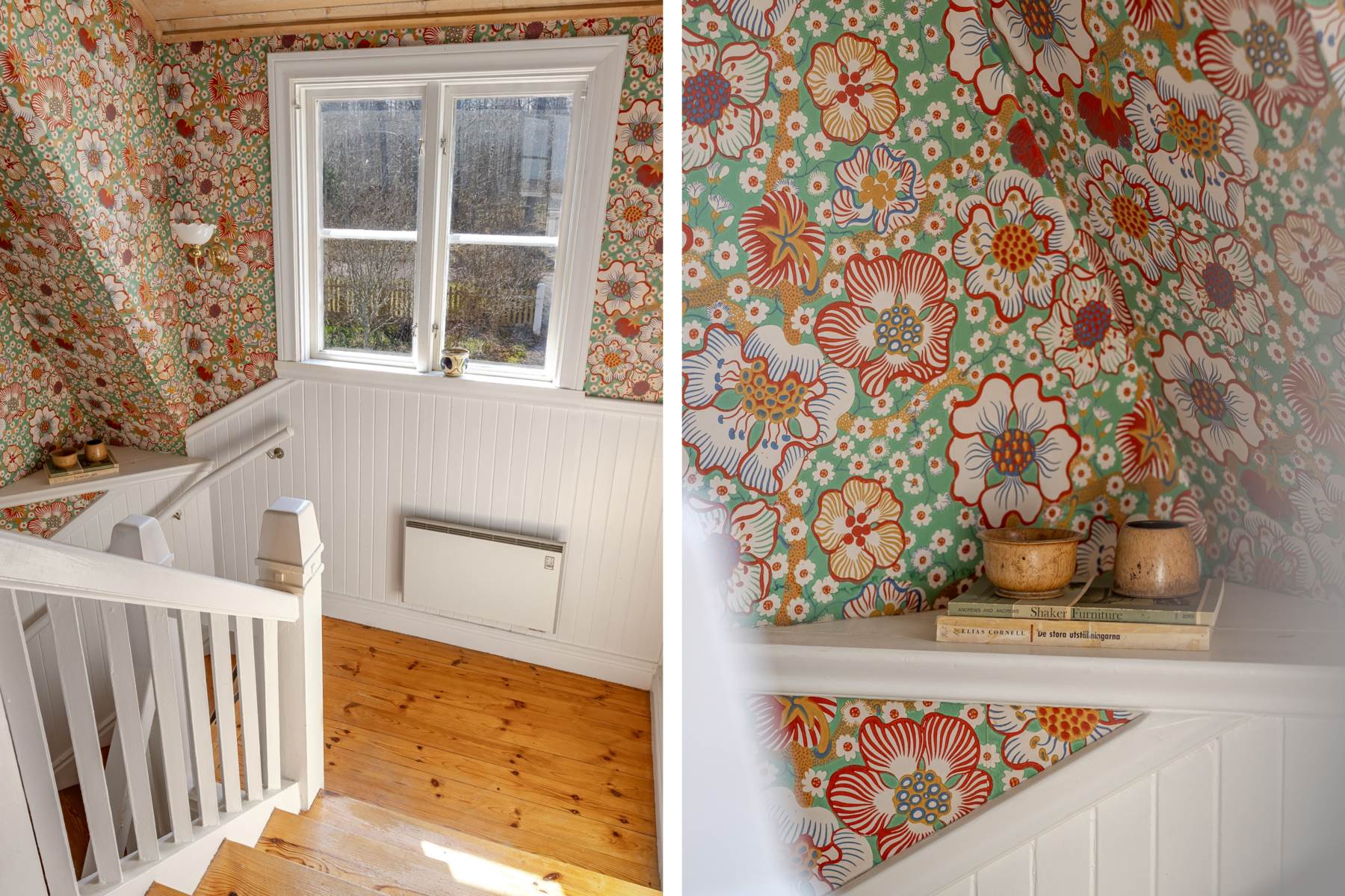 Klinkergolv, bröstpanel, tapetserade väggar och plats för avhängning.