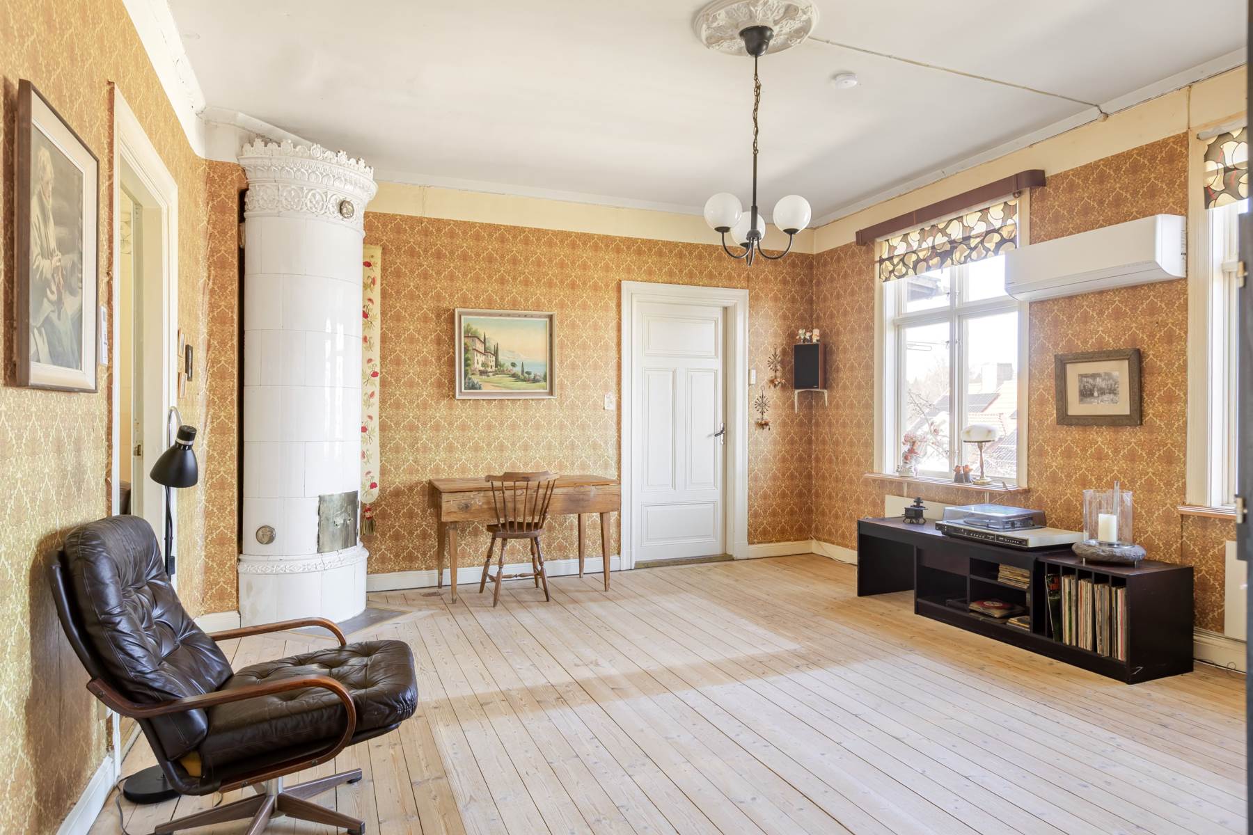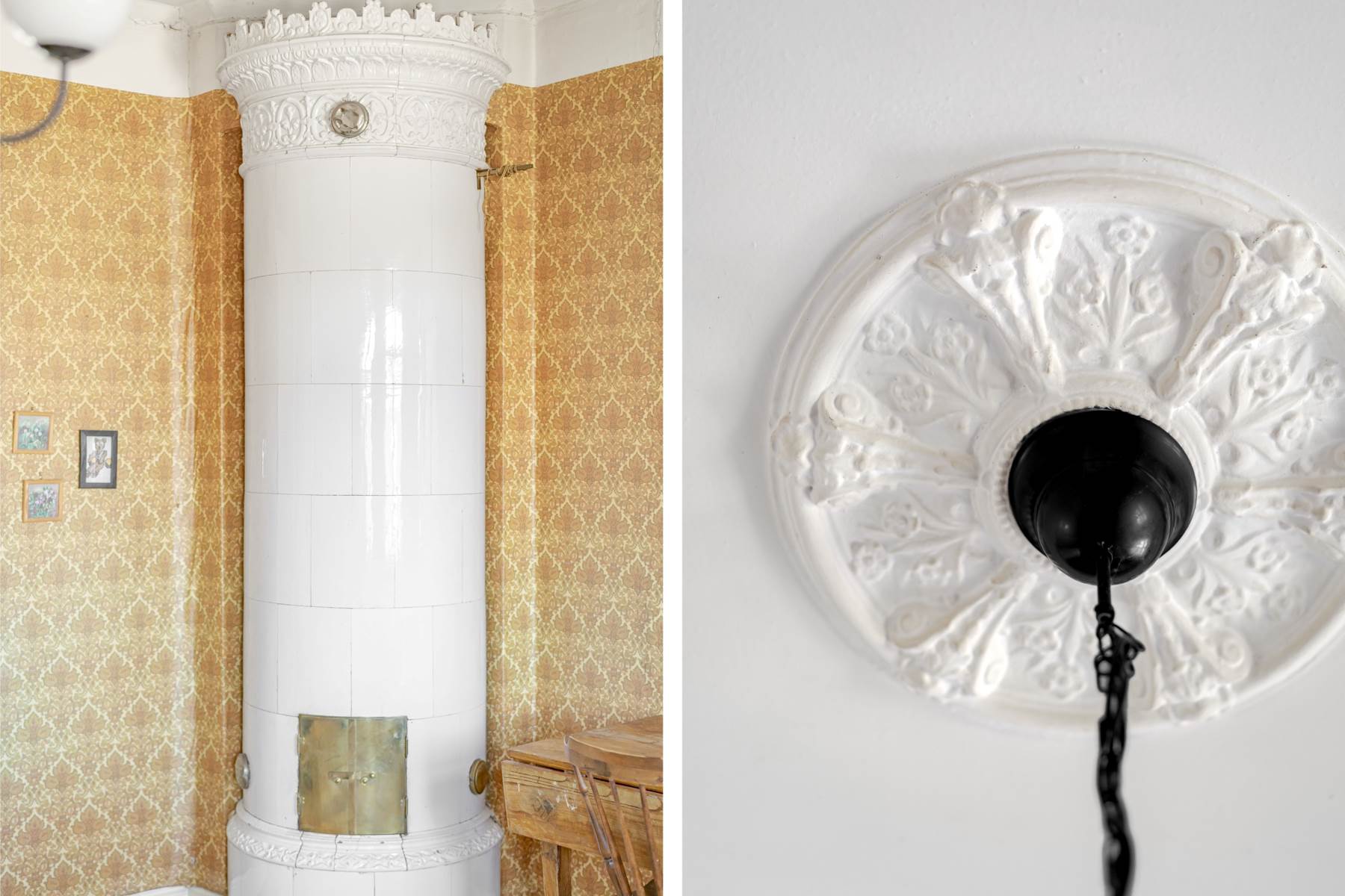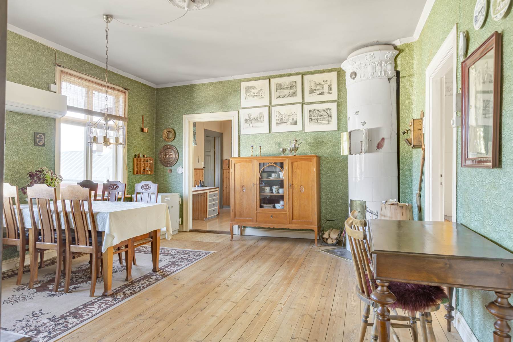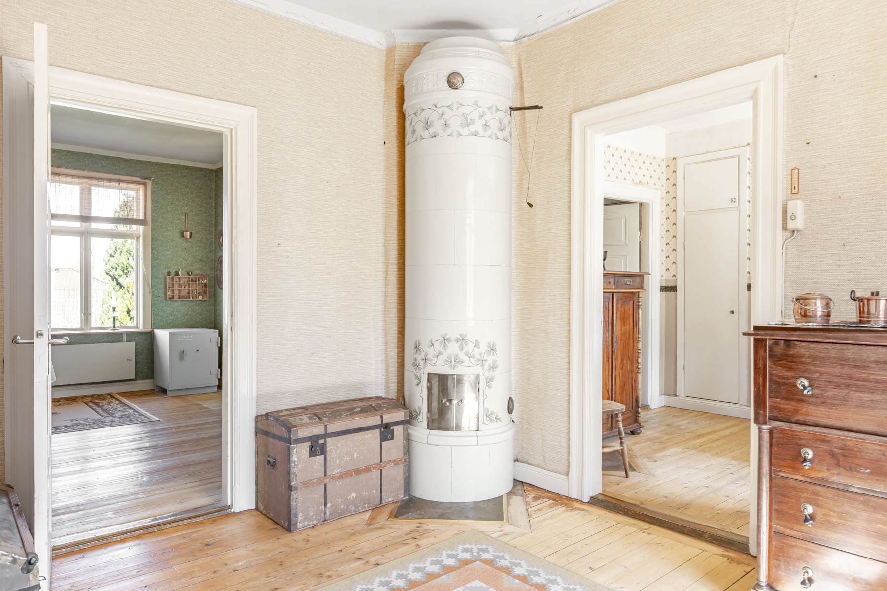 Fastigheten präglas av vackra tidstypiska detaljer från sekelskiftet – högt i tak, stuckaturer, gedigna trägolv, höga golvlister samt vackra innerdörrar med breda dörrposter som ger hemmet en genuin och exklusiv karaktär, till detta finns kakelugnar i nästan varje rum. Du möts av en känsla av rymd och ljus, med stora sällskapsytor som kan anpassas efter behov, även vinden är inredningsbar och har redan idag två befintliga sovrum.
