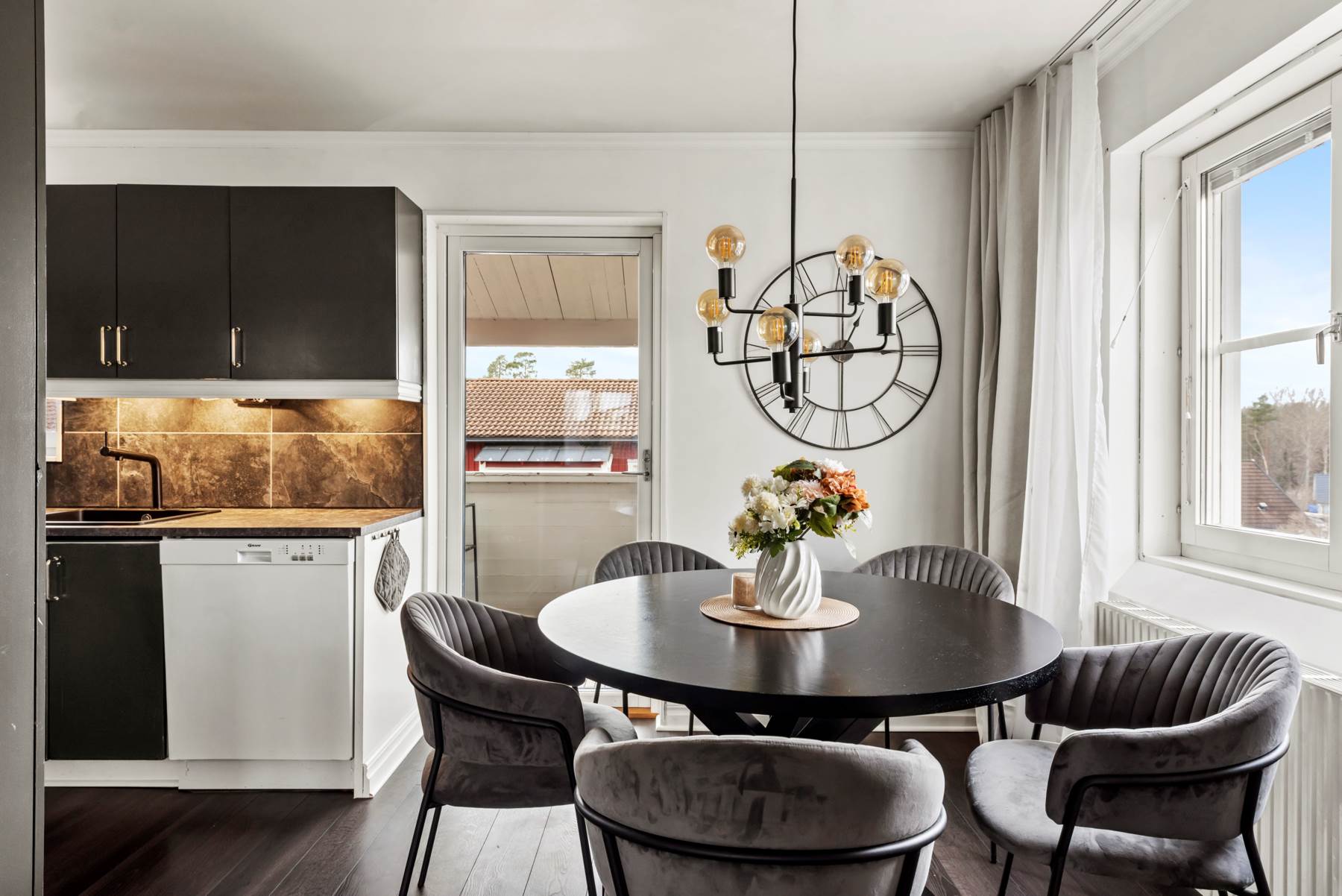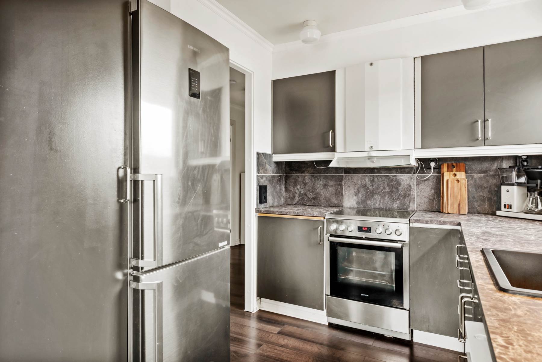 I det fina vardagsrummet ligger ett mörkt golv och på ena väggen sitter valnötsfärgad akustikpanel. Här finns plats för soffgruppen och tv-hörnan. Det mörka golvet ligger genomgående på ett stilrent sätt i hela lägenheten. Sovrummet har generösa förvaringsmöjligheter i garderoberna och det finns en stor walk-in-closet som du med enkla medel kan göra till ett litet barnrum eller kanske ett kontor. Köket är utrustat med kyl, frys, diskmaskin och ugn samt spis. Köksluckorna går i svart och bänkskivorna är gråmelerade. Här når man balkongen, som ligger under tak, där du kan möblera upp och avnjuta dina sommarmåltider!