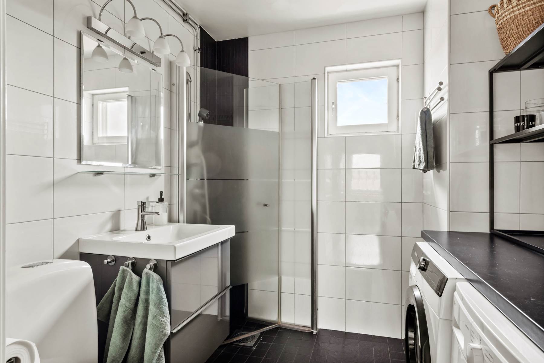Toaletten är helkaklad med vitt kakel på väggarna som möter mörkt klinker på golvet med tillhörande golvvärme.
