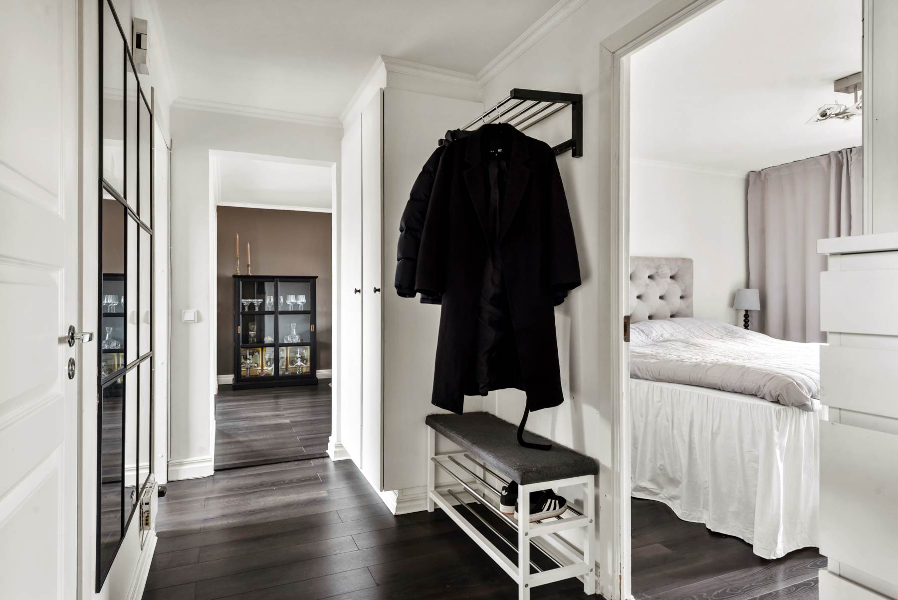 Du når bostaden en trappa upp i huset. I hallen finns det plats för dina ytterkläder och skor med både hatthylla och garderober.