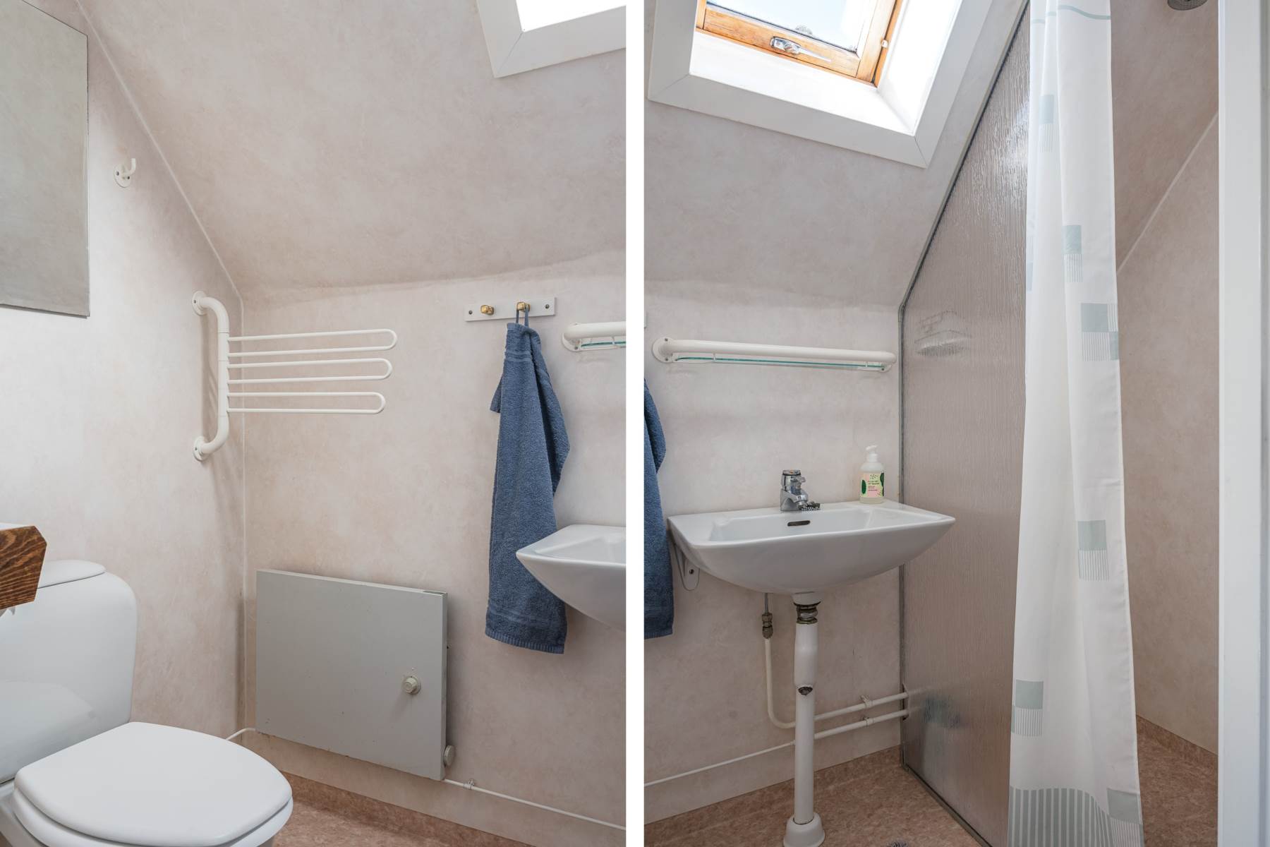 Badrum (övervåning) Badrum med plastmatta på både golv och väggar. Utrustat med toalett, handfat, dusch med glasväggar samt takfönster som ger naturligt ljusinsläpp.