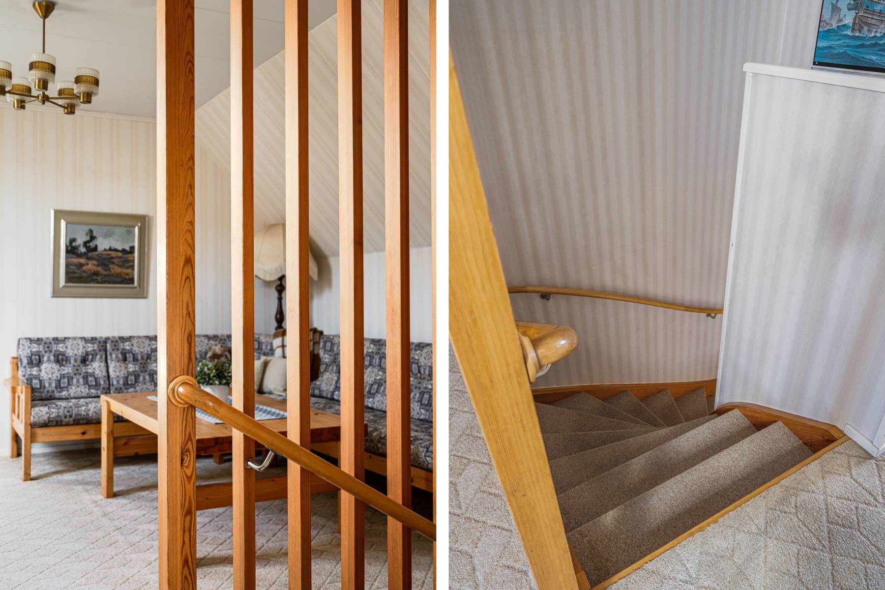 Trappa Trappan är klädd med heltäckningsmatta och har ledstång samt tapetserade väggar längs uppgången.