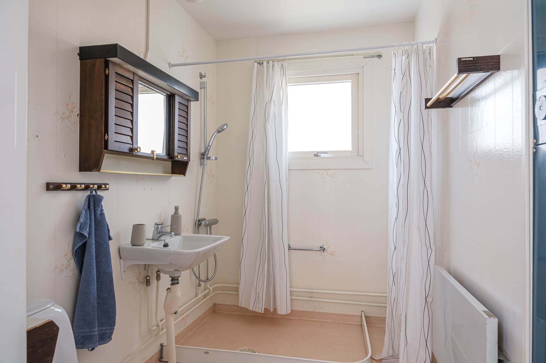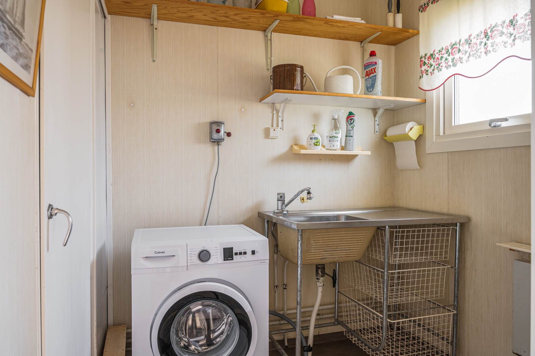 Tvättstuga Belägen direkt till höger från entrén. Utrustad med tvättställ, tvättmaskin och ett äldre torkskåp.