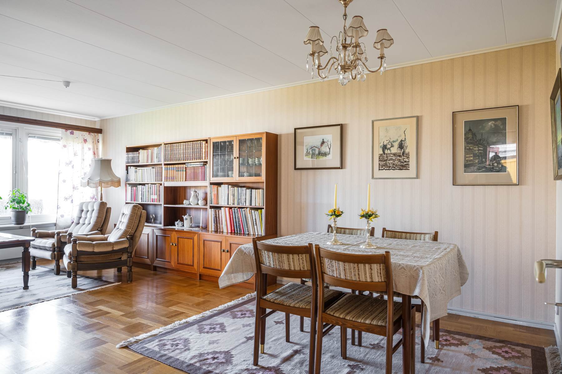 Finrum / Vardagsrum Stort och representativt rum med vackert parkettgolv, tapetserade väggar och rikligt ljusinsläpp som skapar en ljus och luftig känsla.