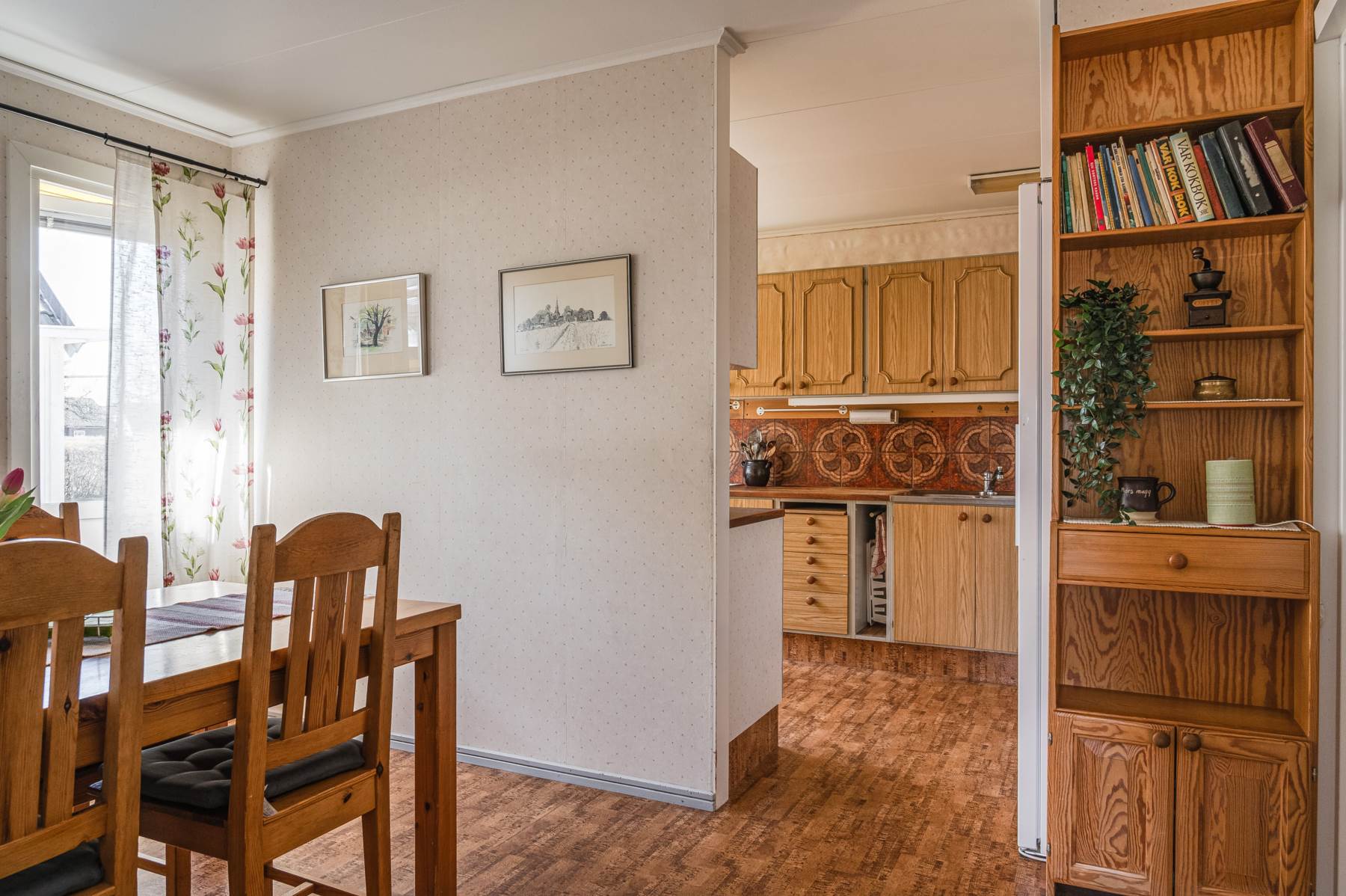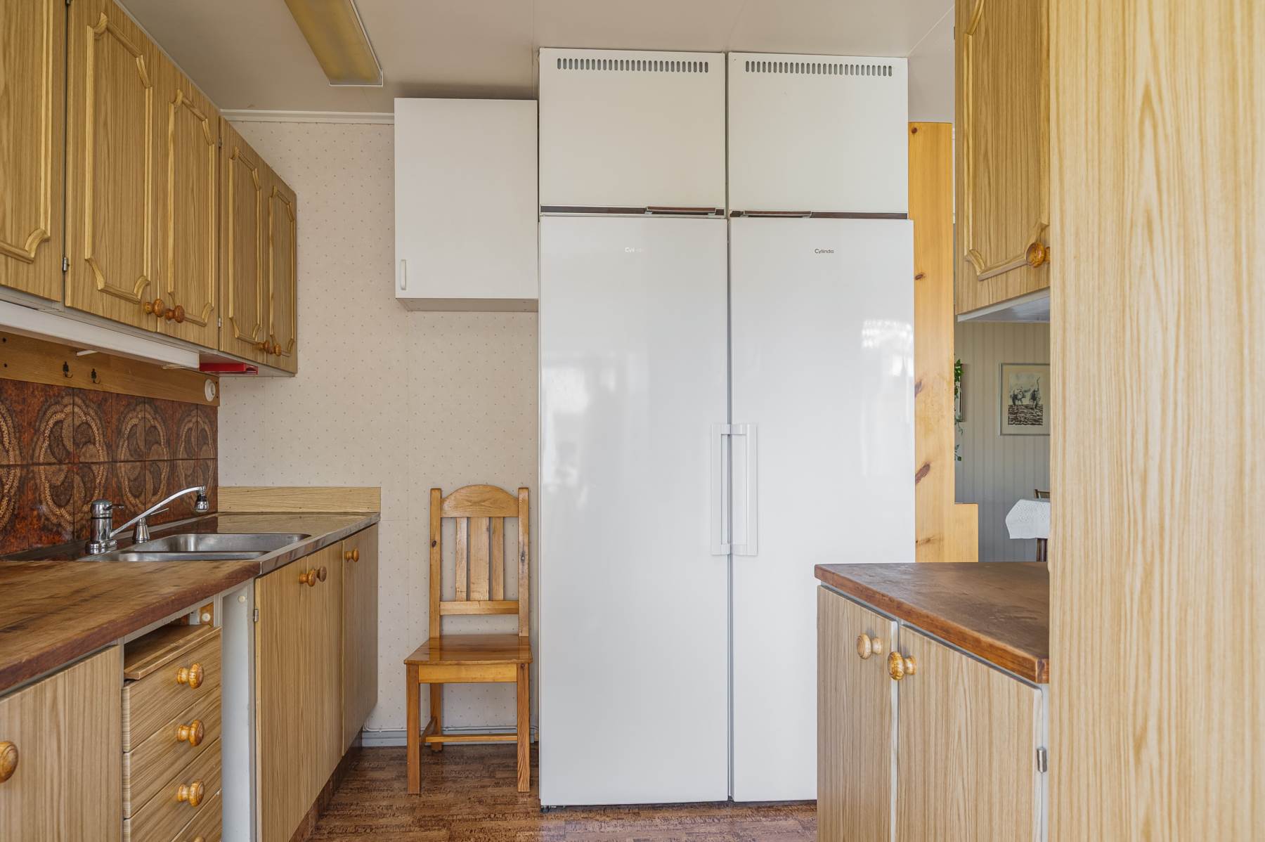 Kök Ligger direkt till vänster från entrén. Kök med matplats för cirka sex personer. Utrustat med äldre snickerier samt spis, kyl och frys i nyare fullhöjdsmodell.