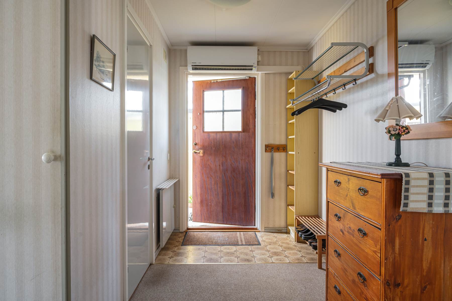 Entréhall Hall med plastmatta och inslag av heltäckningsmatta. Luft/luft pump sitter här.