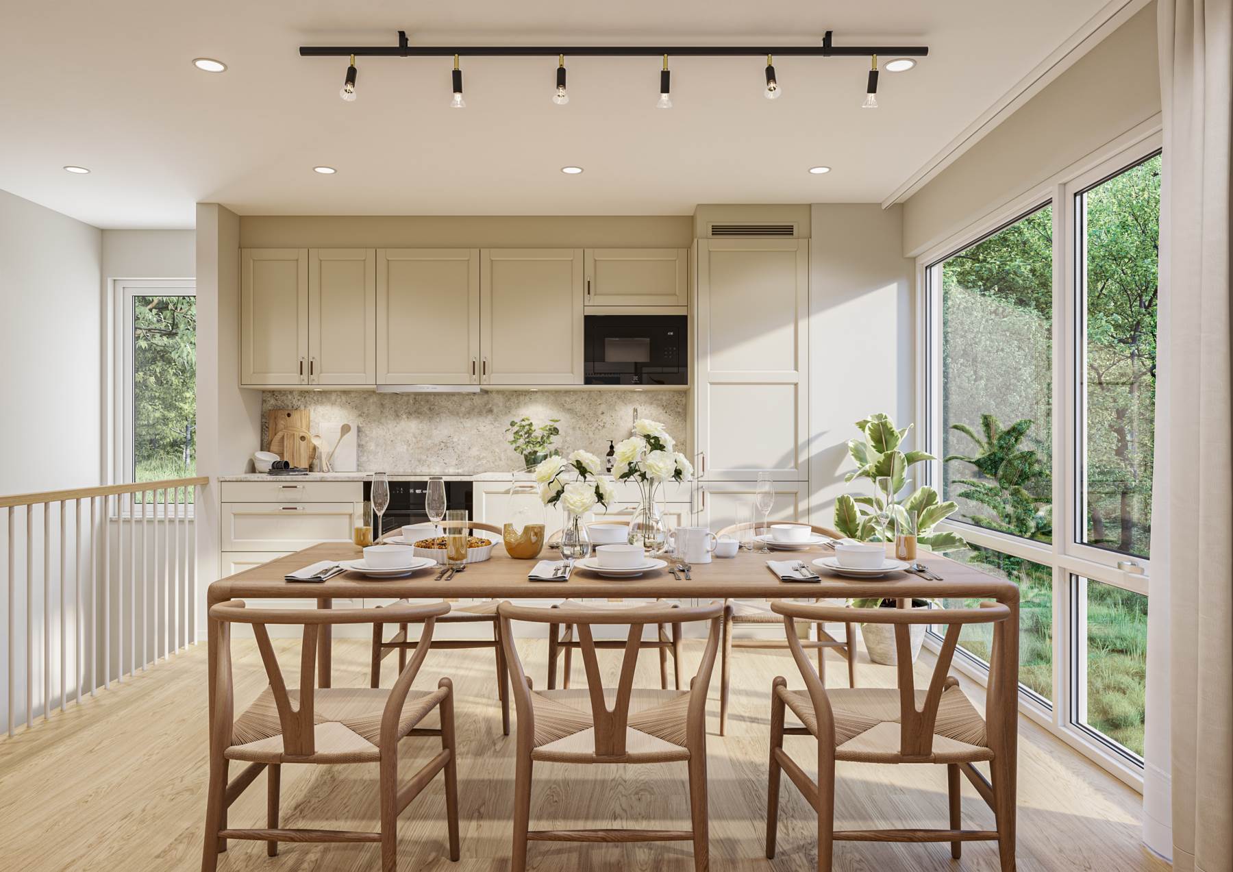 Bostäderna i Brf Danderyd Park präglas av ett tydligt kvalitetsfokus – här är material och utförande lika genomtänkta som arkitekturen. Köken är byggda med snickerier från Ballingslöv med stenskivor från Cosentino och kromade detaljer med läderinfattning för en exklusiv finish. Vitvaror kommer från Electrolux och integreras stilrent i inredningen för ett sammanhållande uttryck. I badrummen återkommer samma premiumkänsla med kakel och klinker från Bricmate, armaturer från Tapwell. Golvmaterialen är valda med omsorg. Parhusen har exklusiv fiskbensparkett från Bjelin vilket ger en varm och tidlös bas. Trappor i massiv ek, målade snickerier och harmoniska kulörer knyter samman helheten och ger en lugn och elegant atmosfär. Belysningen är integrerad med spotlights och dimmer i samtliga rum, vilket förstärker ljuset från de stora fönsterpartierna och bidrar till den exklusiva känslan.