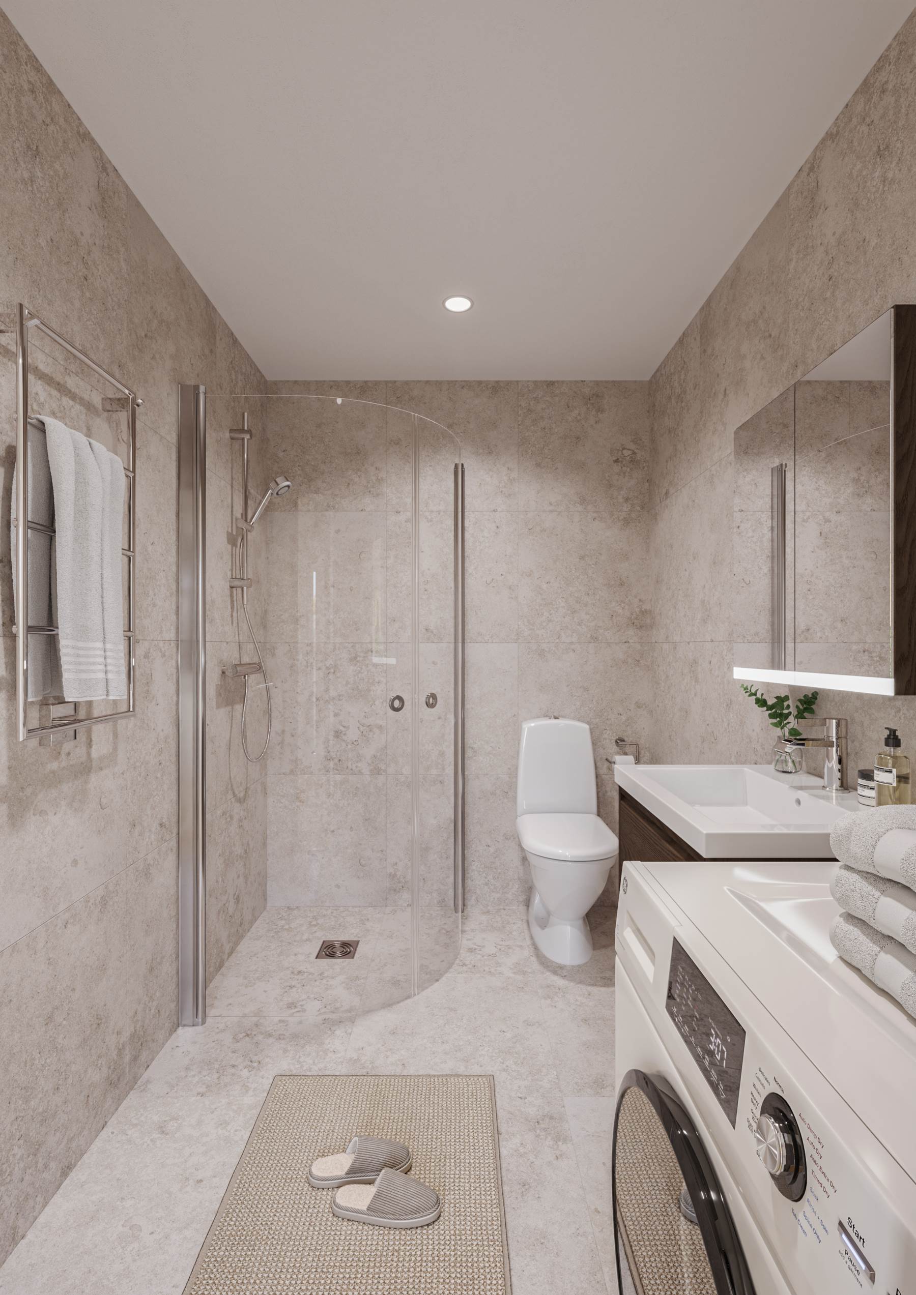 Bostäderna i Brf Danderyd Park präglas av ett tydligt kvalitetsfokus – här är material och utförande lika genomtänkta som arkitekturen. Köken är byggda med snickerier från Ballingslöv med stenskivor från Cosentino och kromade detaljer med läderinfattning för en exklusiv finish. Vitvaror kommer från Electrolux och integreras stilrent i inredningen för ett sammanhållande uttryck. I badrummen återkommer samma premiumkänsla med kakel och klinker från Bricmate, armaturer från Tapwell. Golvmaterialen är valda med omsorg. Parhusen har exklusiv fiskbensparkett från Bjelin vilket ger en varm och tidlös bas. Trappor i massiv ek, målade snickerier och harmoniska kulörer knyter samman helheten och ger en lugn och elegant atmosfär. Belysningen är integrerad med spotlights och dimmer i samtliga rum, vilket förstärker ljuset från de stora fönsterpartierna och bidrar till den exklusiva känslan.