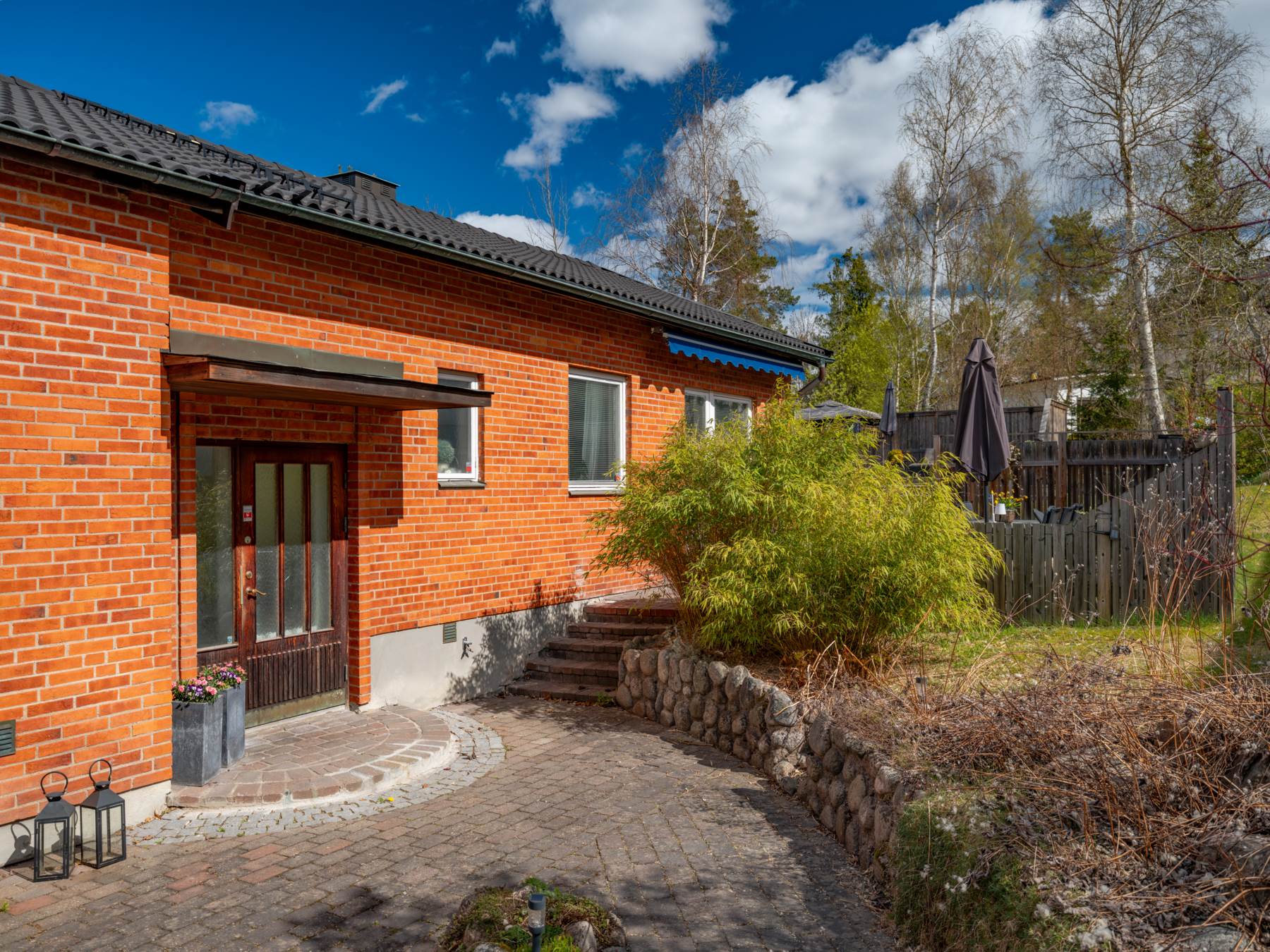 Tomten är något alldeles extra – en superfin och lättskött trädgård med fantastiskt solläge. Den stora terrassen bjuder på sol hela dagen och blir en naturlig samlingsplats under sommarhalvåret. Här finns även gräsmatta för lek och spel samt uppställningsplats för två bilar på uppfarten.
