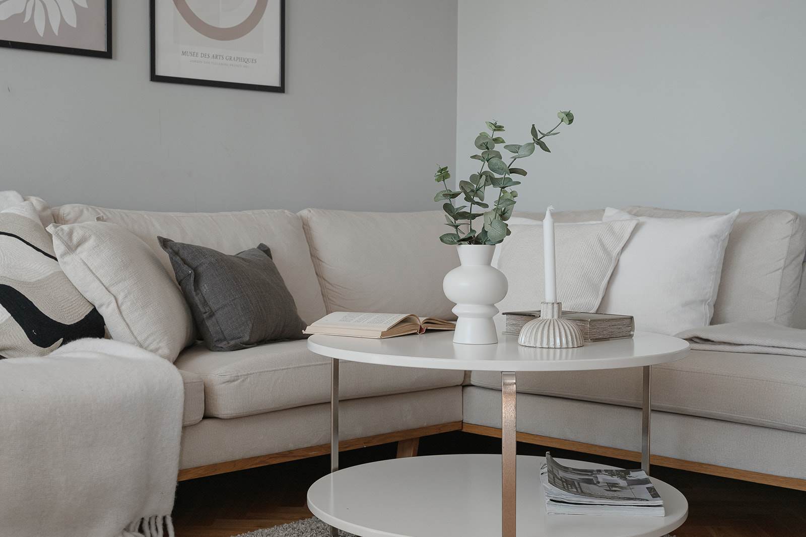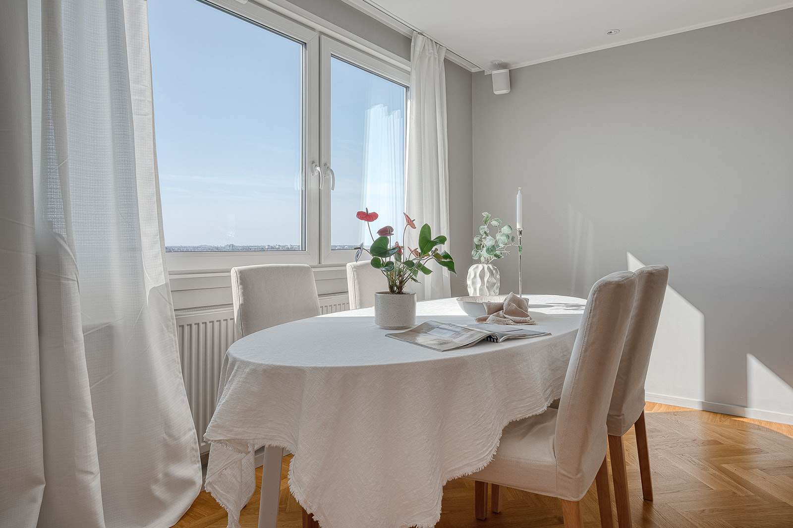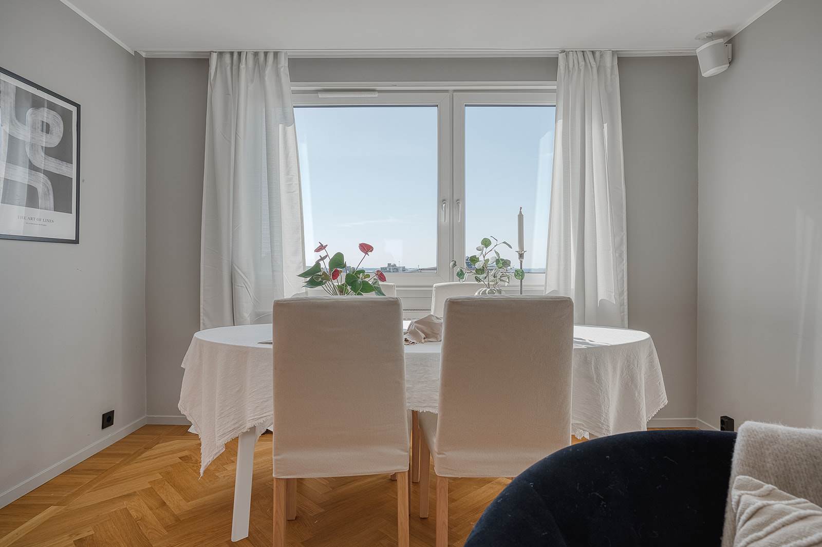 Ett luftigt och elegant vardagsrum som samspelar fint med köket. Ljusa, nymålade väggar och klassisk fiskbensparkett ger en exklusiv känsla. De stora fönsterpartierna bjuder på ett fantastiskt ljusinsläpp och en magisk utsikt.