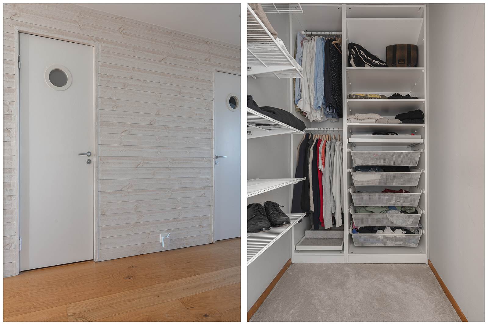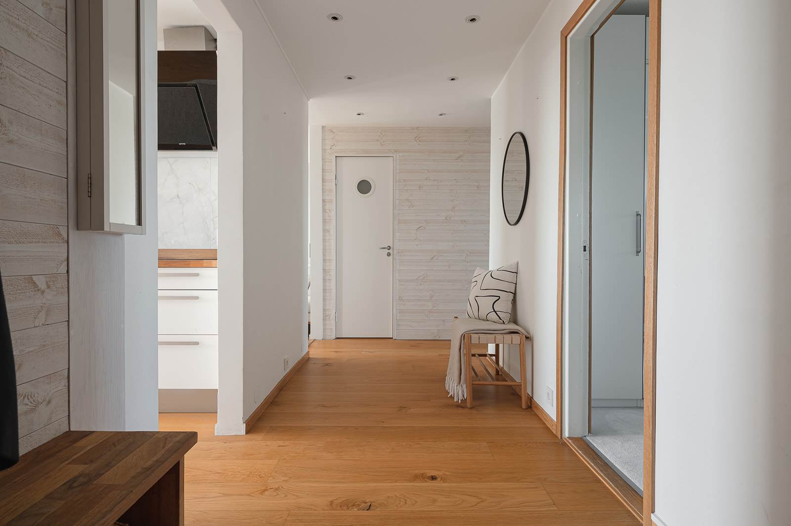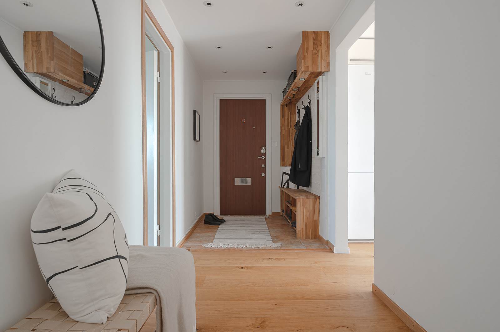 Välkomnande entré med sittbänk i trä och goda avhängningsmöjligheter. Här finns även en rymlig klädkammare som förenklar vardagen.