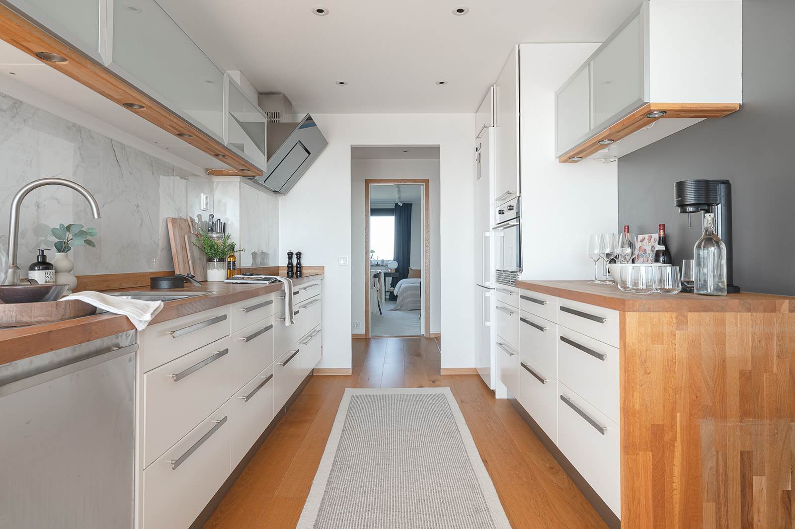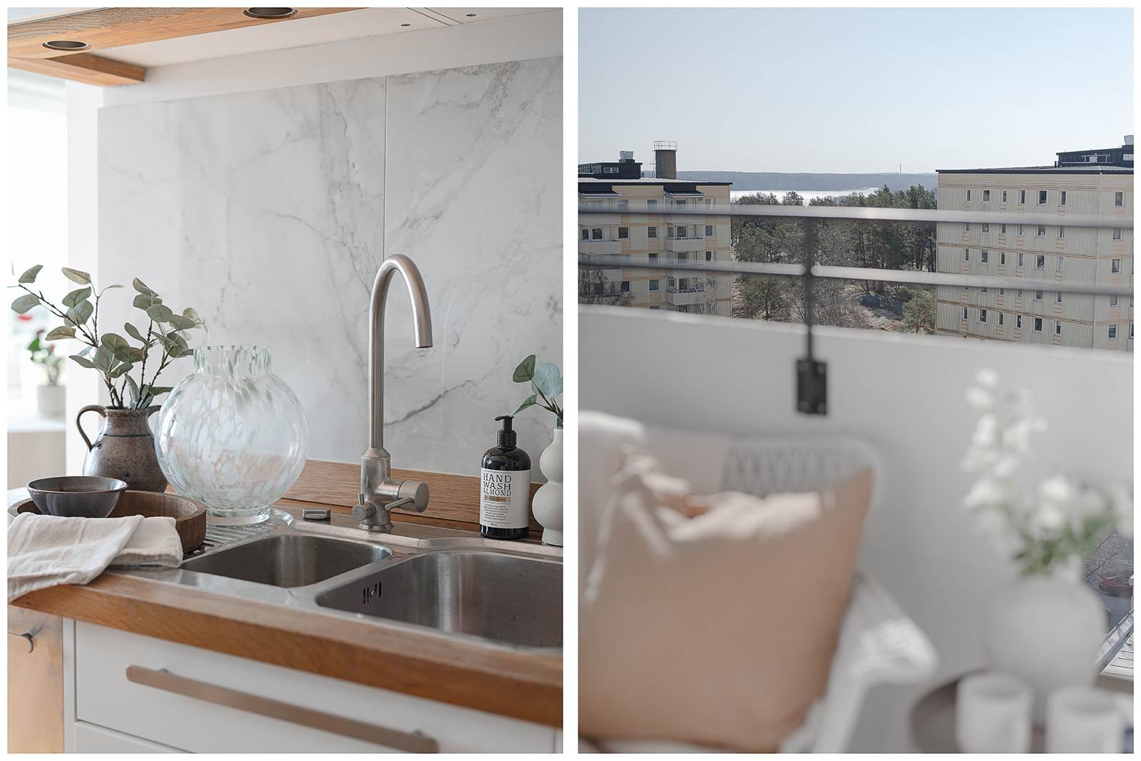 Ett smakfullt kök direkt till vänster om entrén, med generösa förvaringslösningar på båda sidor. Den öppna ytan rymmer en trivsam matplats och skapar en social atmosfär. Härifrån nås balkongen med en svårslagen panoramavy över vattnet.