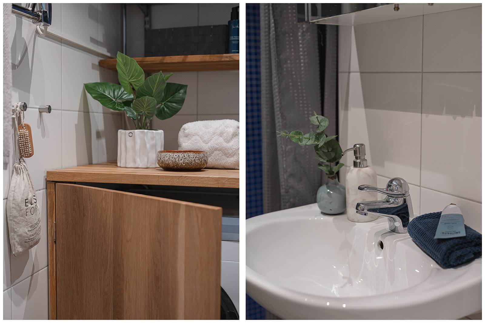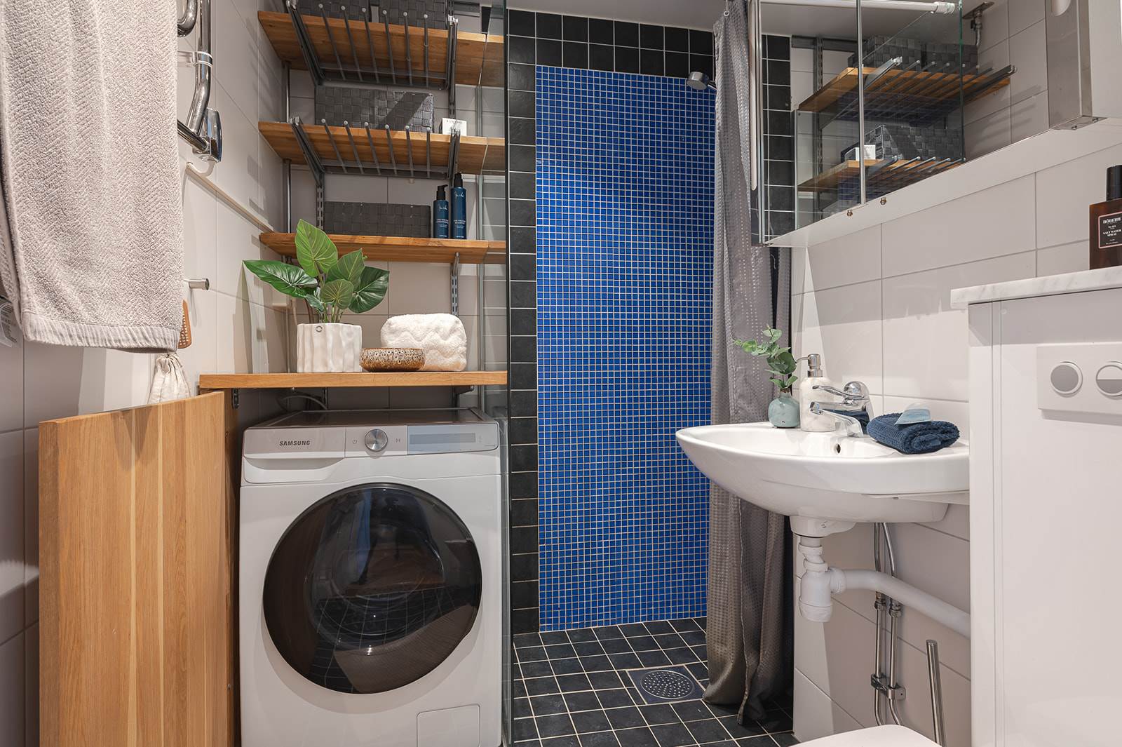 Stilrent helkaklat badrum i vitt och blått, utrustat med dusch, tvättmaskin, handfat, toalett och praktisk förvaring.
