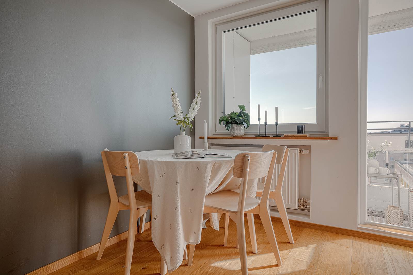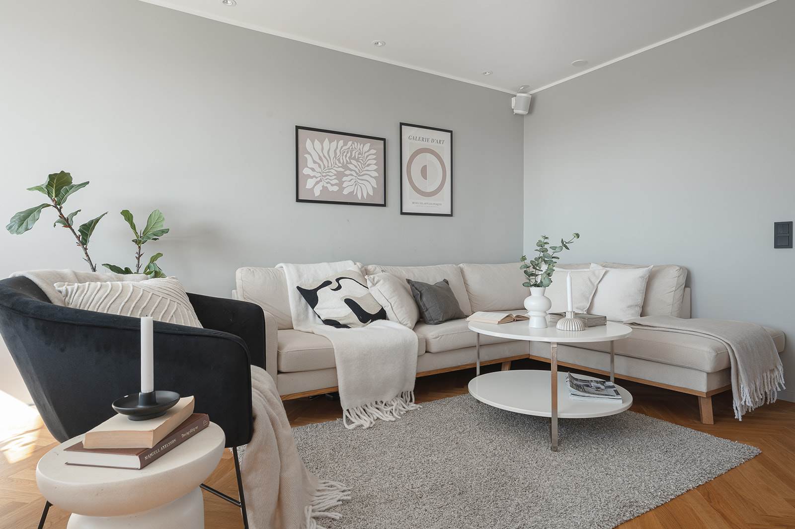 Här möts du av en genomgående ljus och öppen bostad där rummen samspelar på ett naturligt sätt. De generösa fönsterpartierna låter dagsljuset flöda fritt och skapar en varm, levande atmosfär som är svår att inte trivas i. Den fina renoveringen ger ett stilrent intryck, samtidigt som lägenheten behåller sin charm och personlighet.