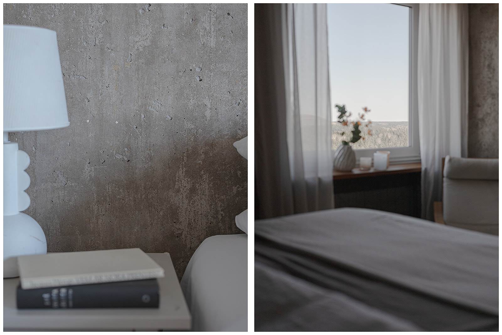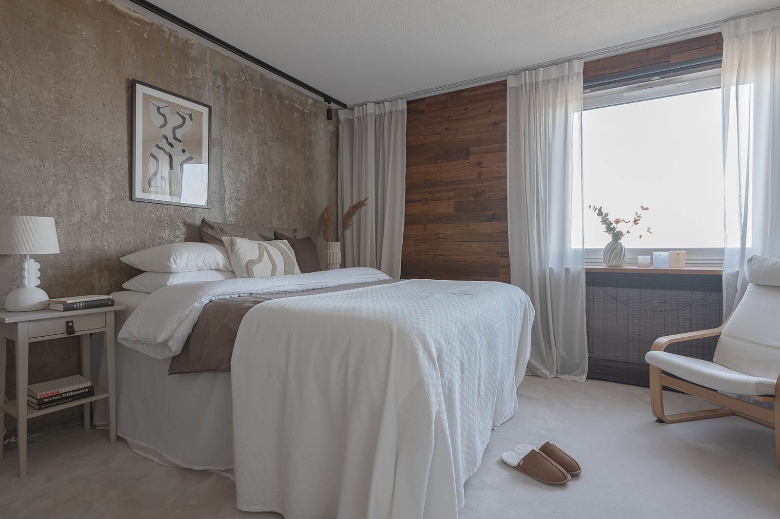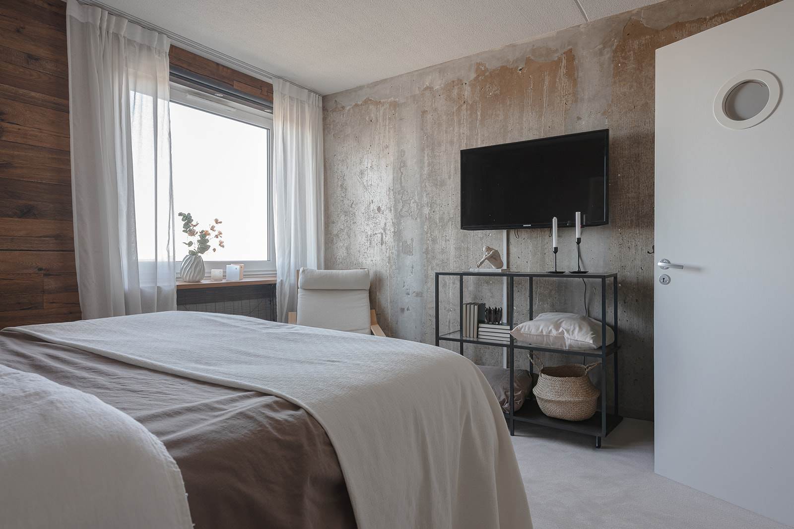 Ett rogivande sovrum med utsikt över grönskande trädtoppar. Här möts varm träpanel, rå betongvägg och mjuk heltäckningsmatta i en unik och genomtänkt design. Gott om plats för dubbelsäng och tillhörande möblemang.